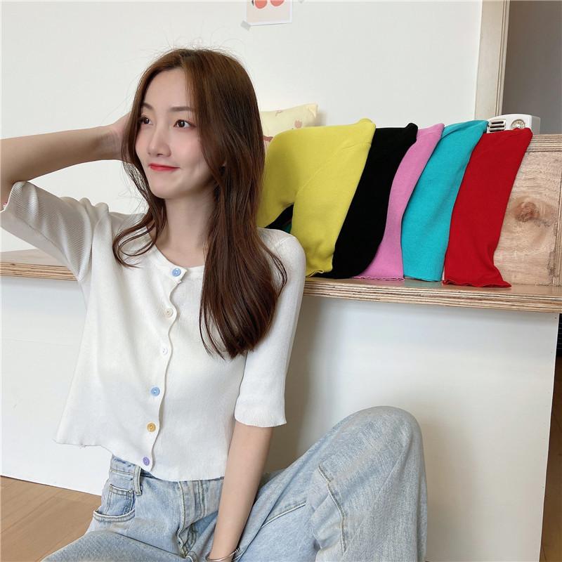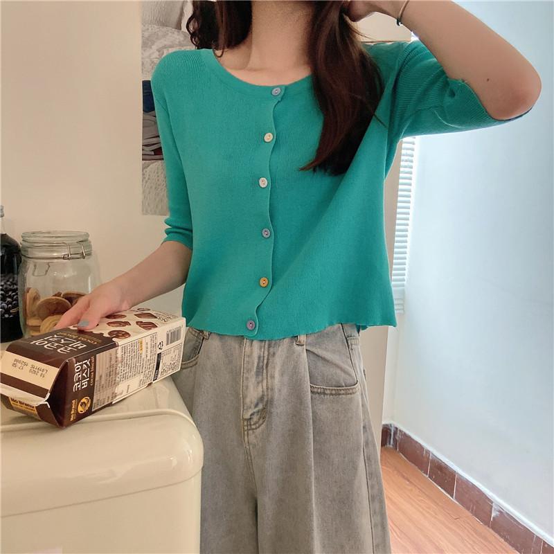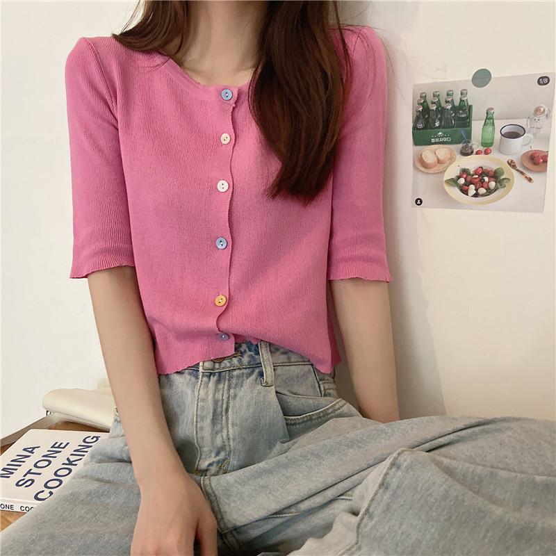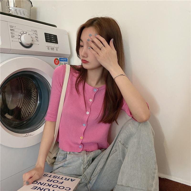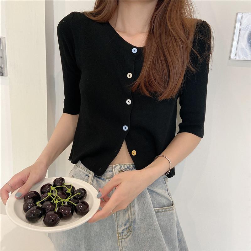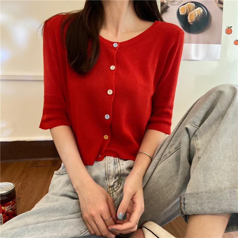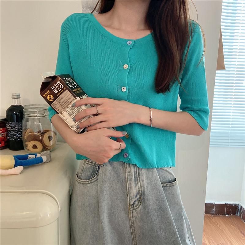 Cárdigan corto elegante de punto para mujer, estilo coreano nuevo 2024, corte entallado, adelgazante, cuello redondo, seda fría colorida, manga corta