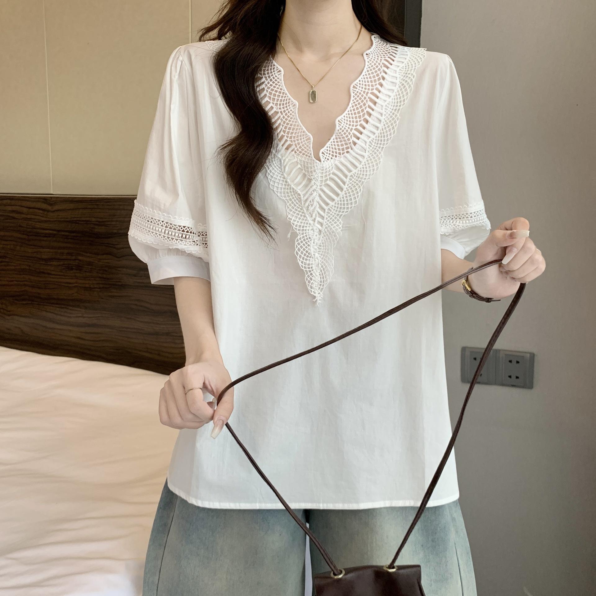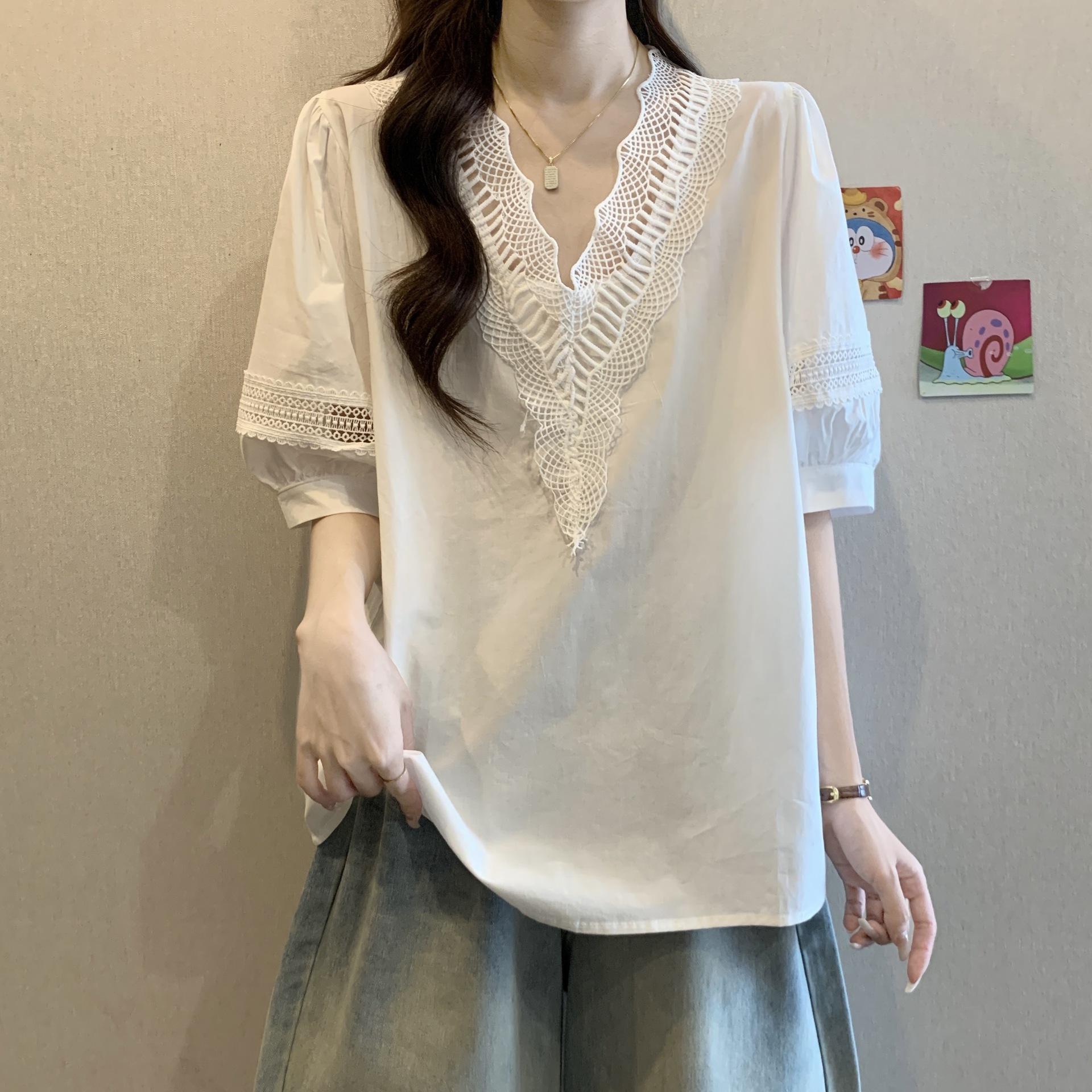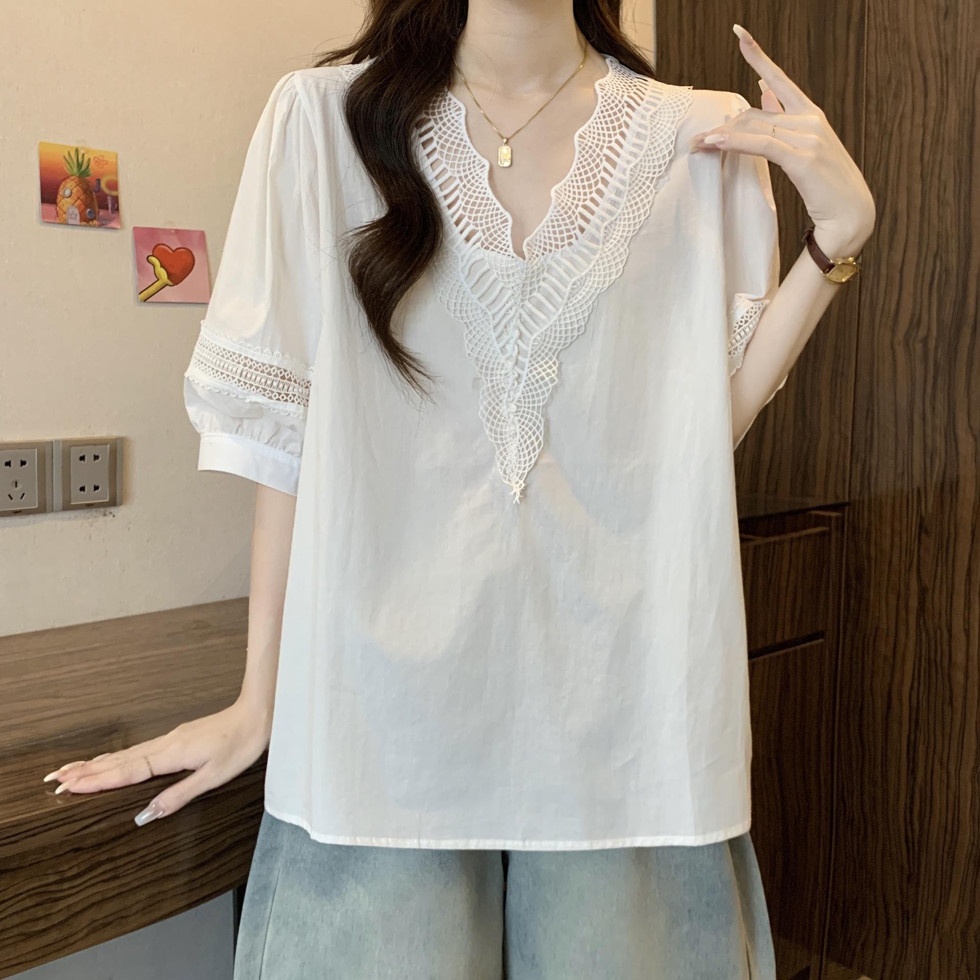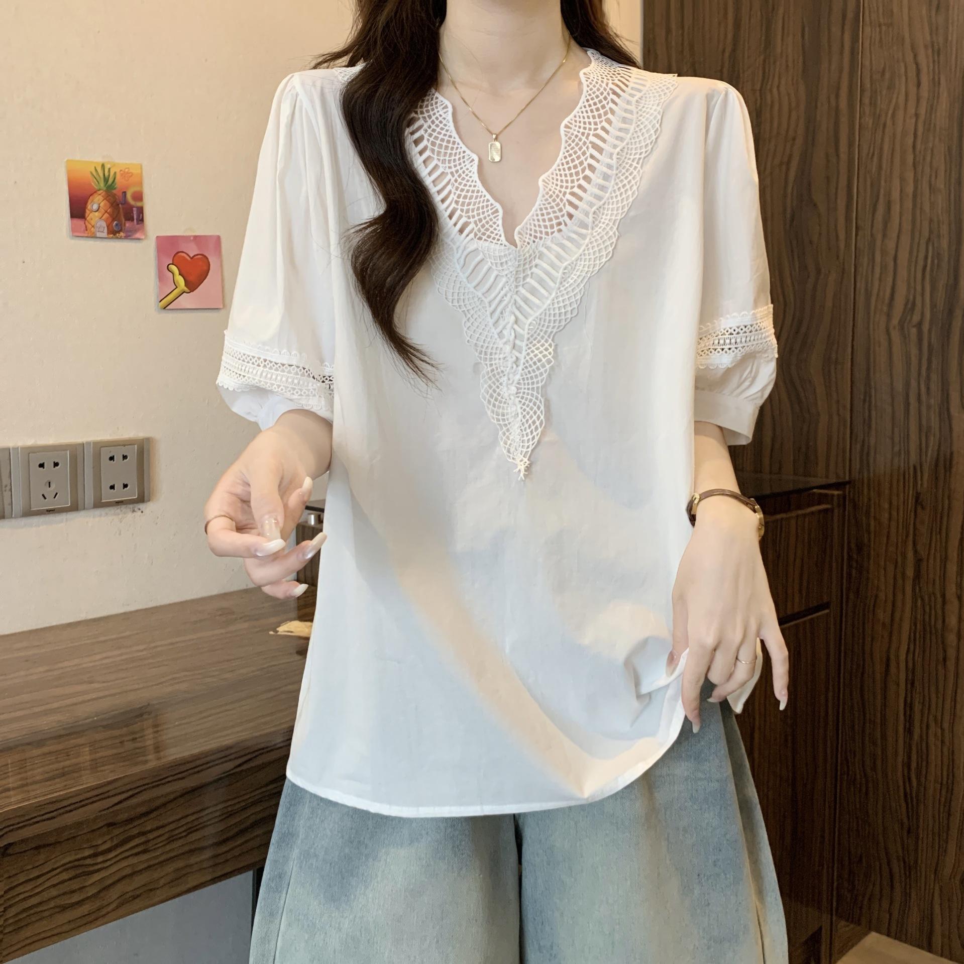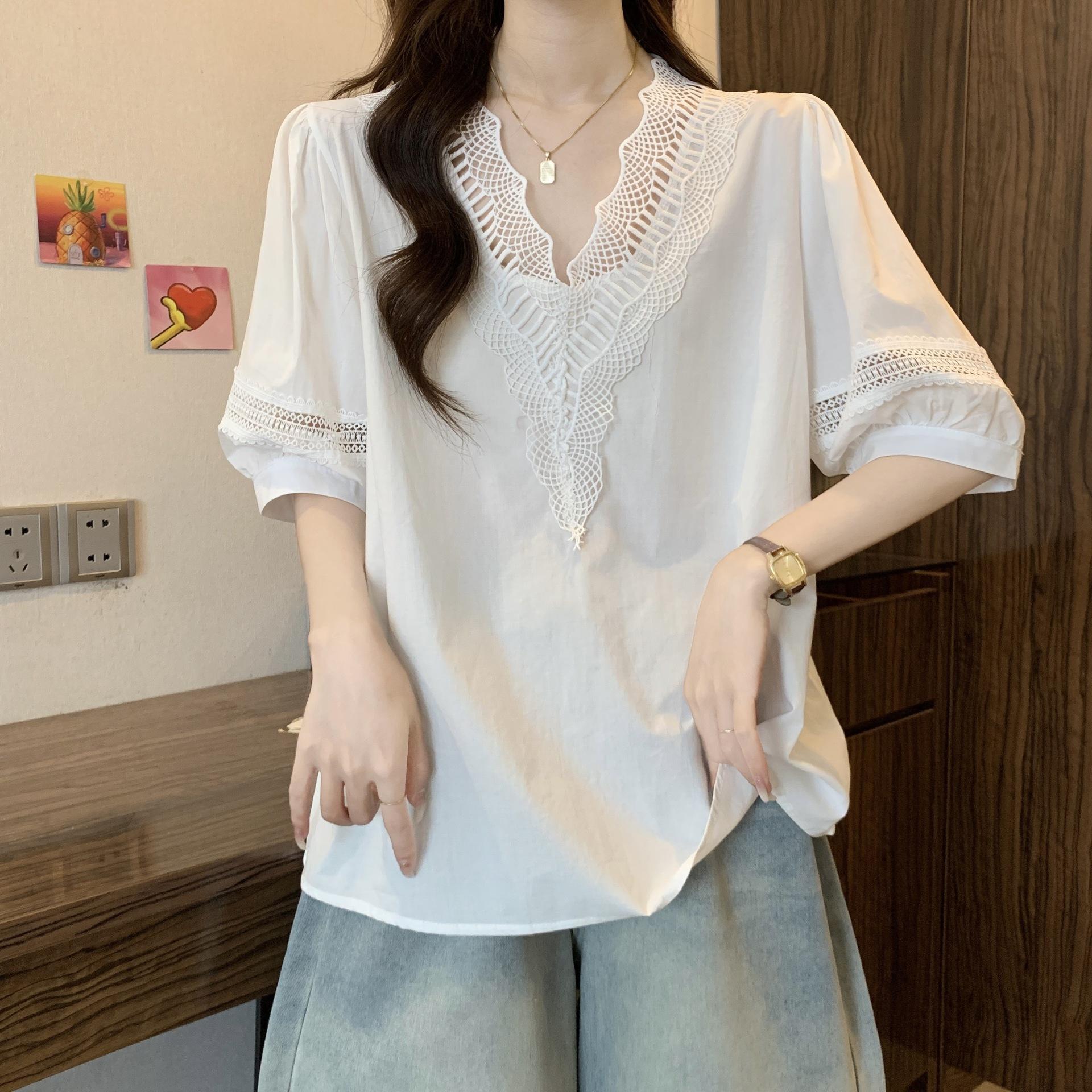 Foto Real de Blusas Casuales Adelgazantes de Manga Corta con Cuello Temperamento para Verano para Mujer de Talla Grande