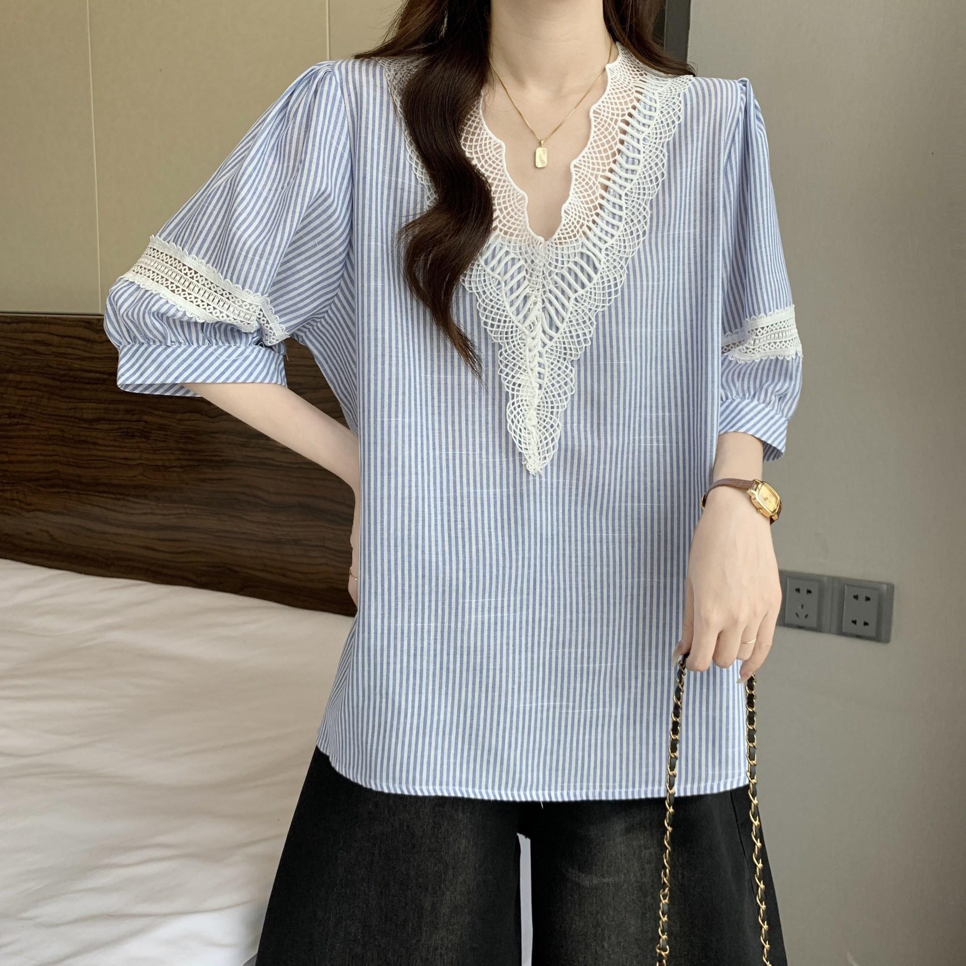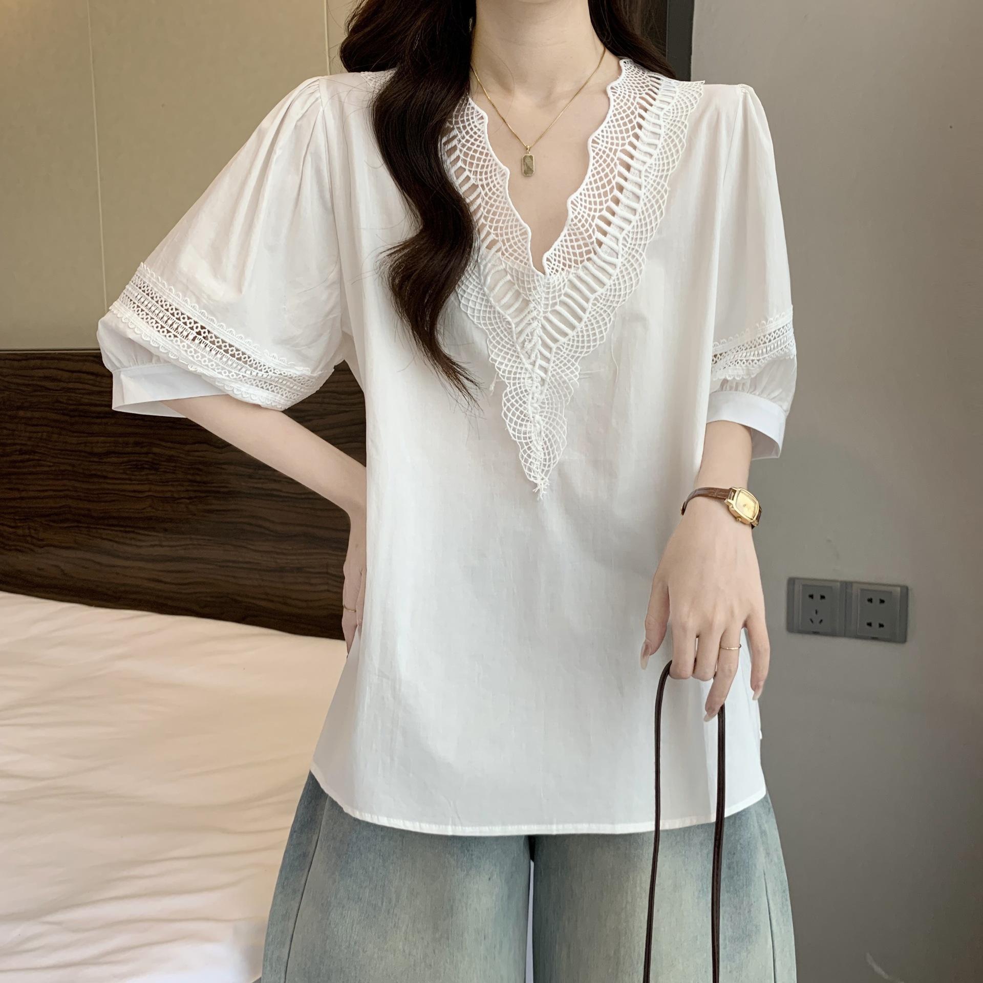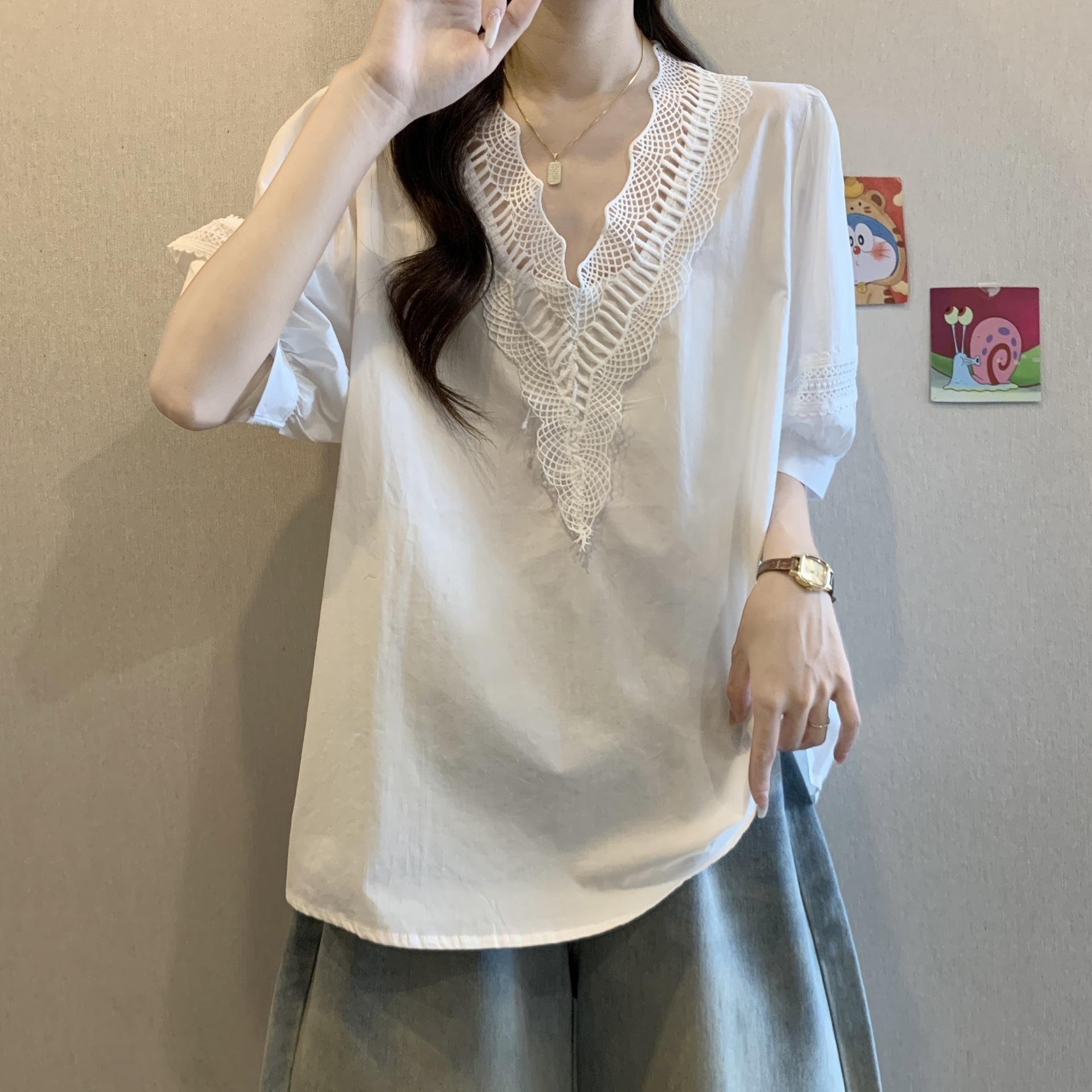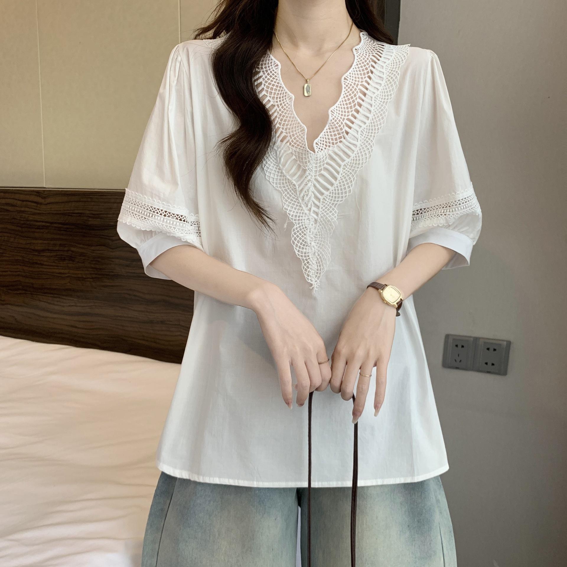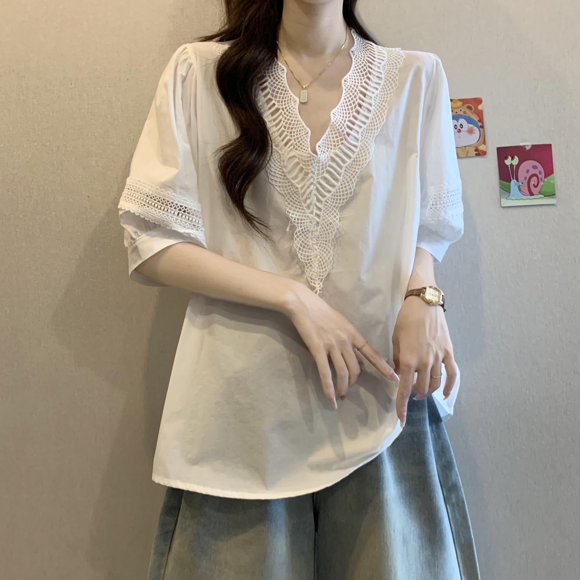 Foto Real de Blusas Casuales Adelgazantes de Manga Corta con Cuello Temperamento para Verano para Mujer de Talla Grande