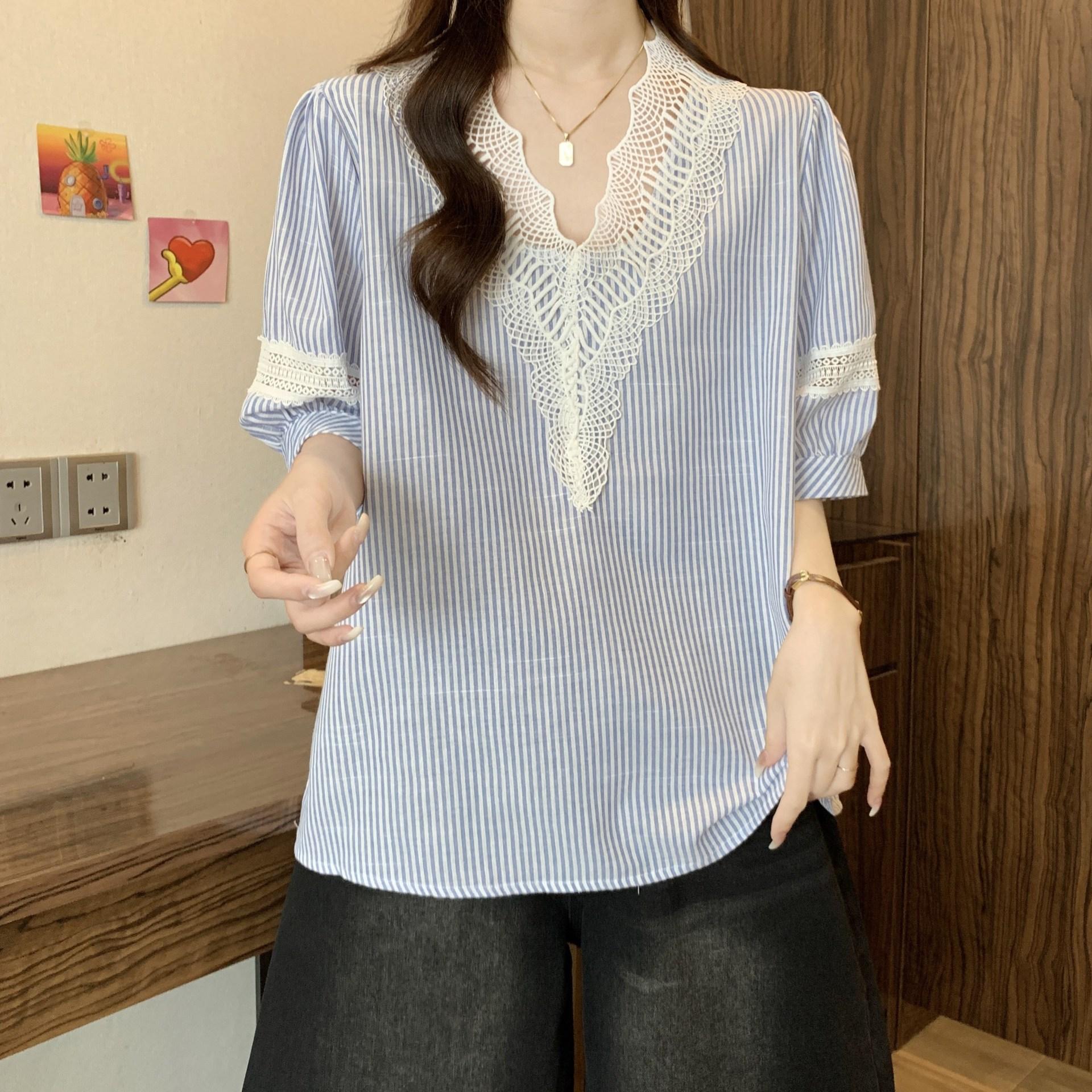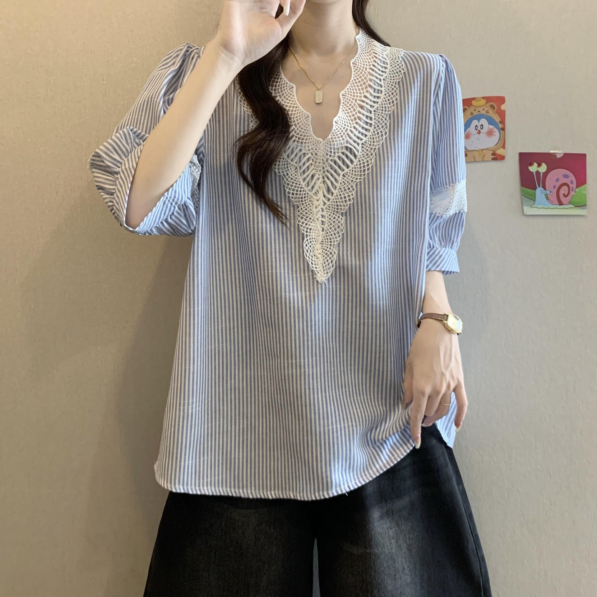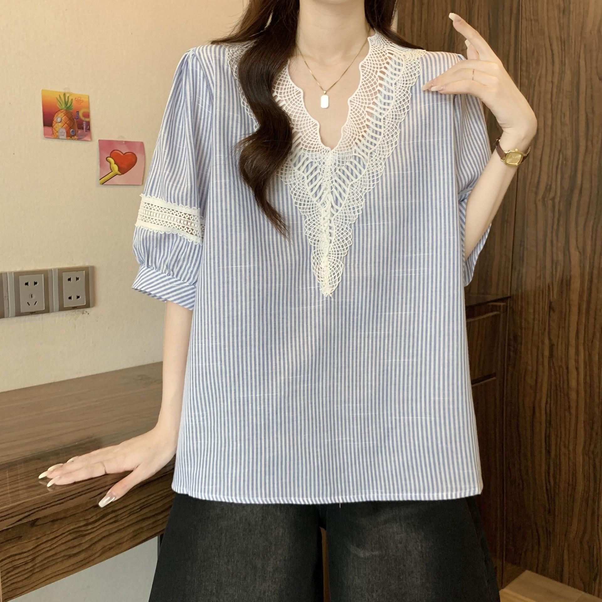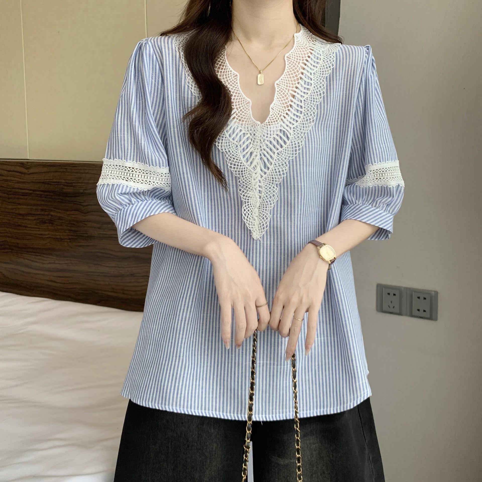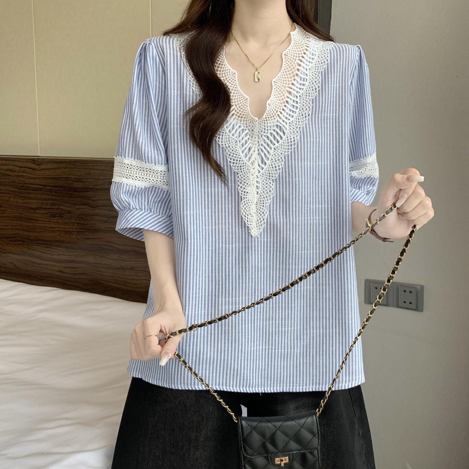 Foto Real de Blusas Casuales Adelgazantes de Manga Corta con Cuello Temperamento para Verano para Mujer de Talla Grande