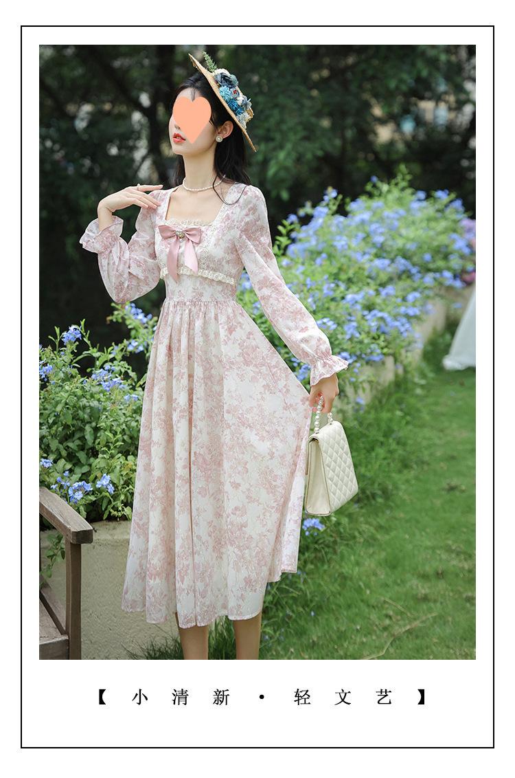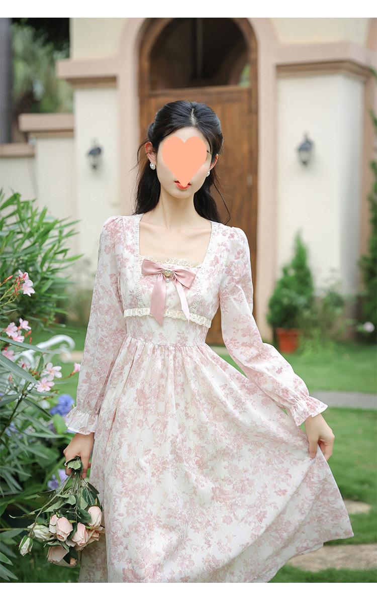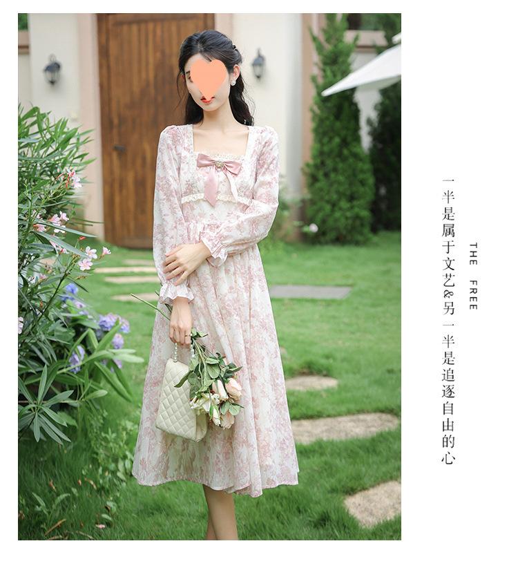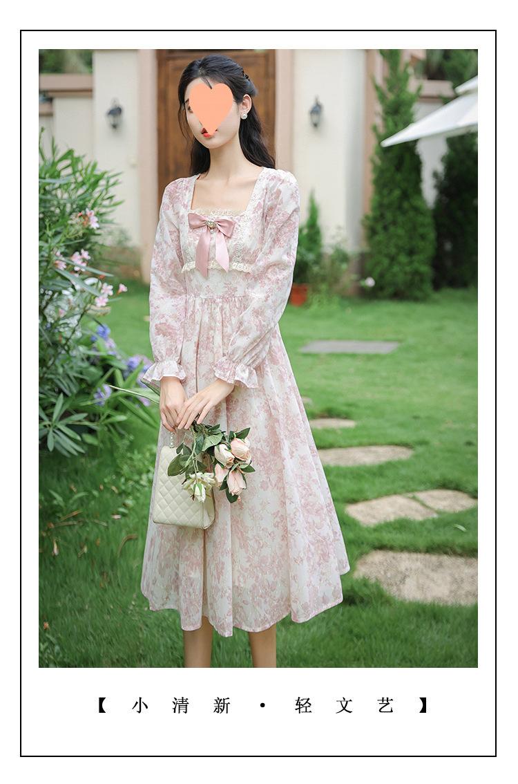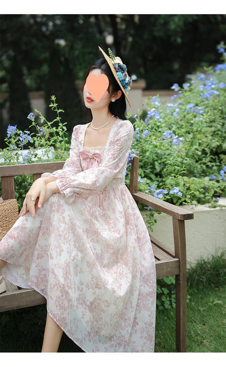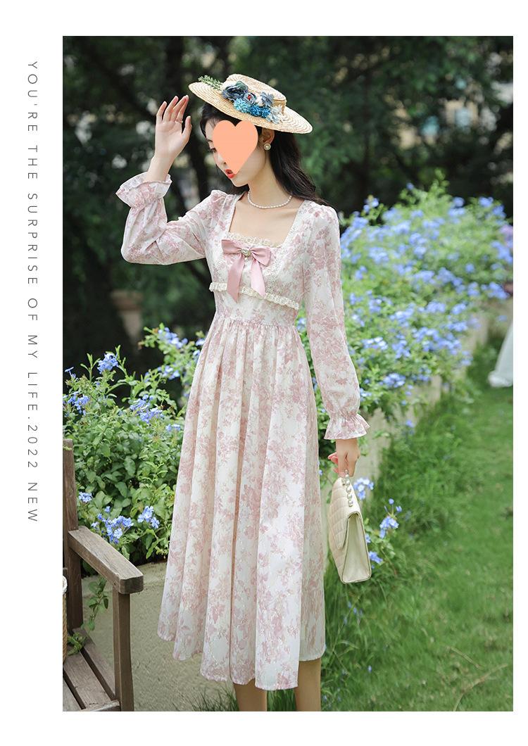 Vestido Rosa Floral Estilo Dulce de Princesa para Mujer de Manga Larga Primavera y Verano Vestido Largo Francés de Platycodon Vestido Estilo Gentil