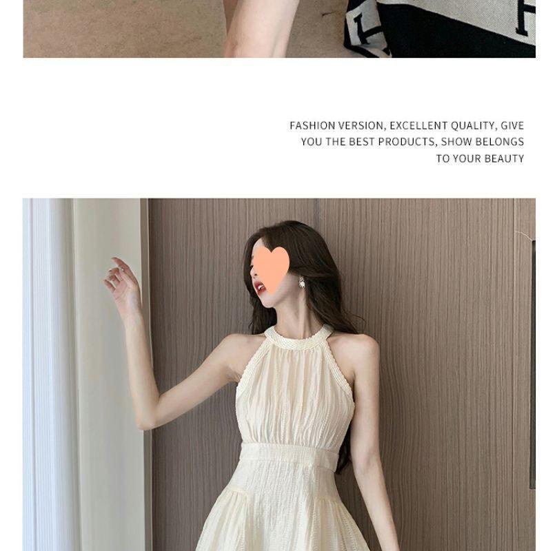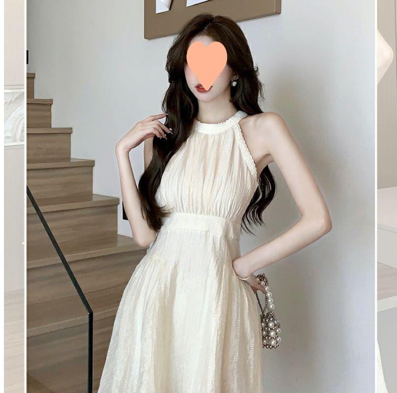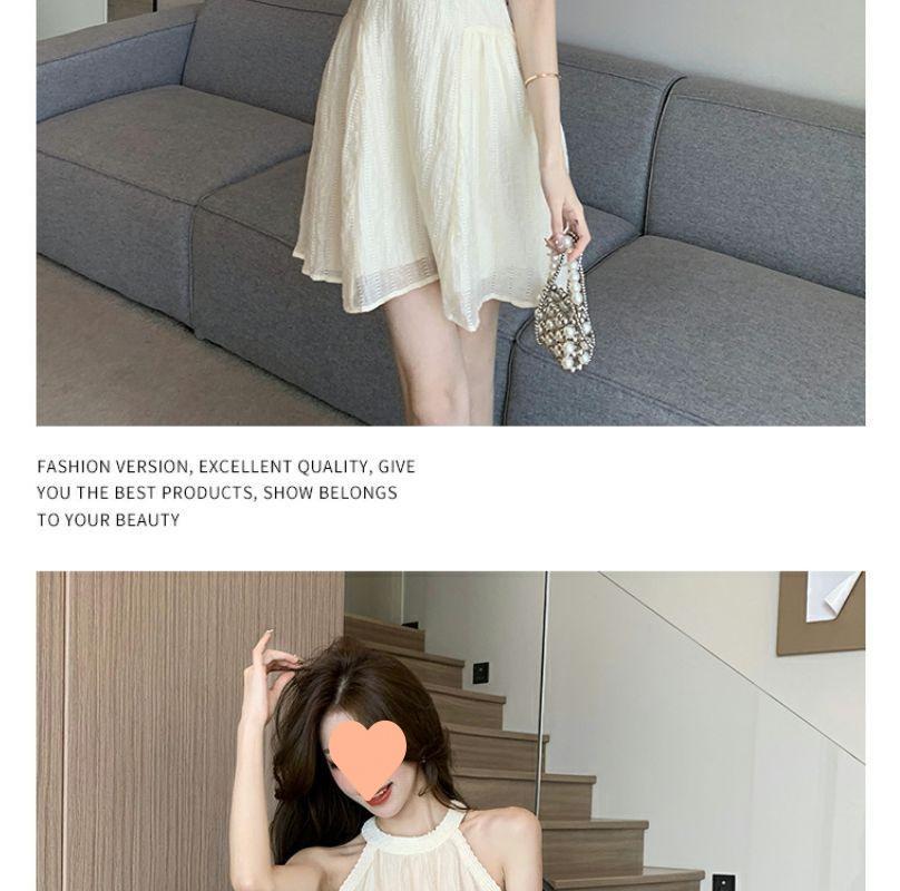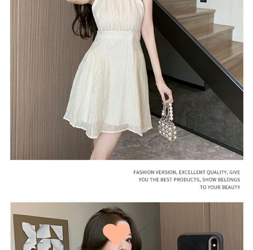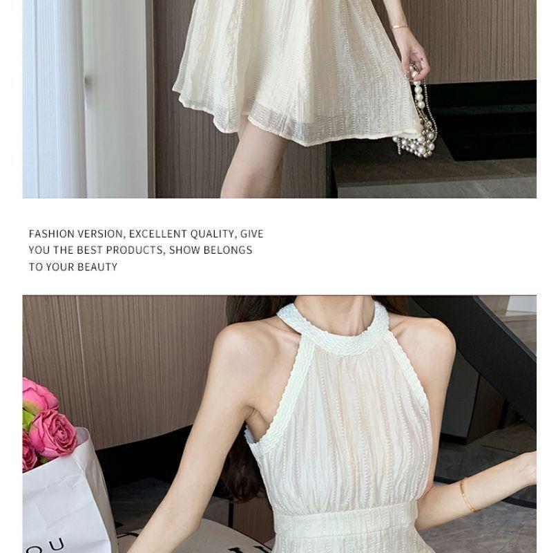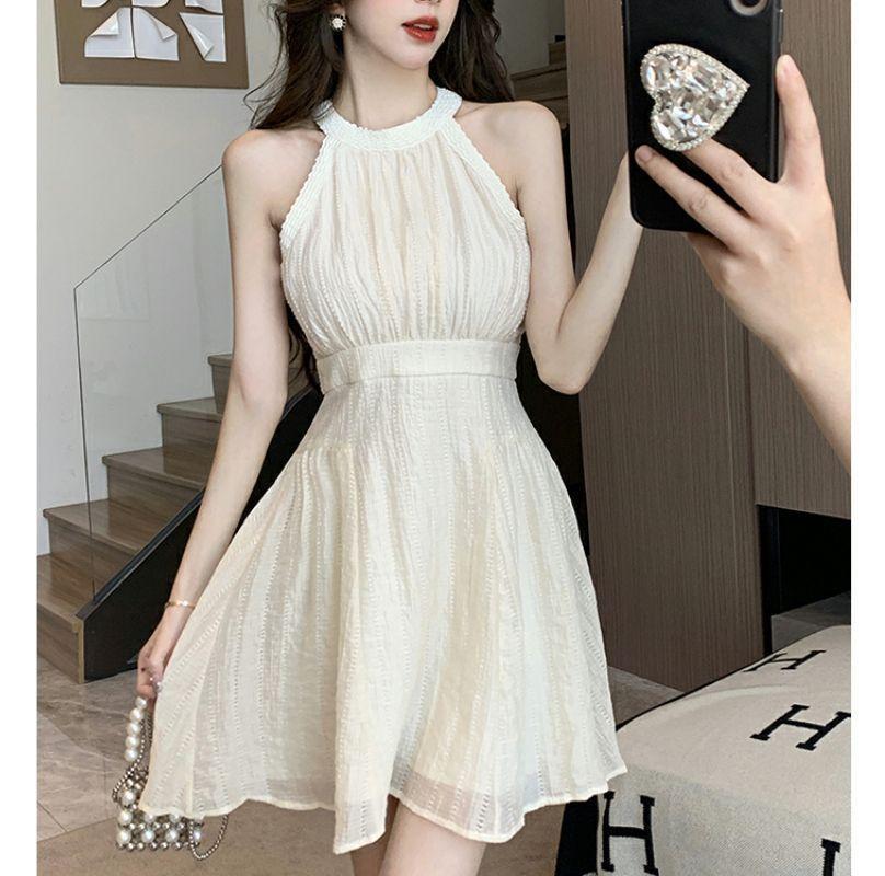 Vestido de Hada Halter sin Mangas de Alta Gama Francés para Mujer Vacaciones de Verano Junto al Mar Look Adelgazante de Cintura Alta Falda Línea A