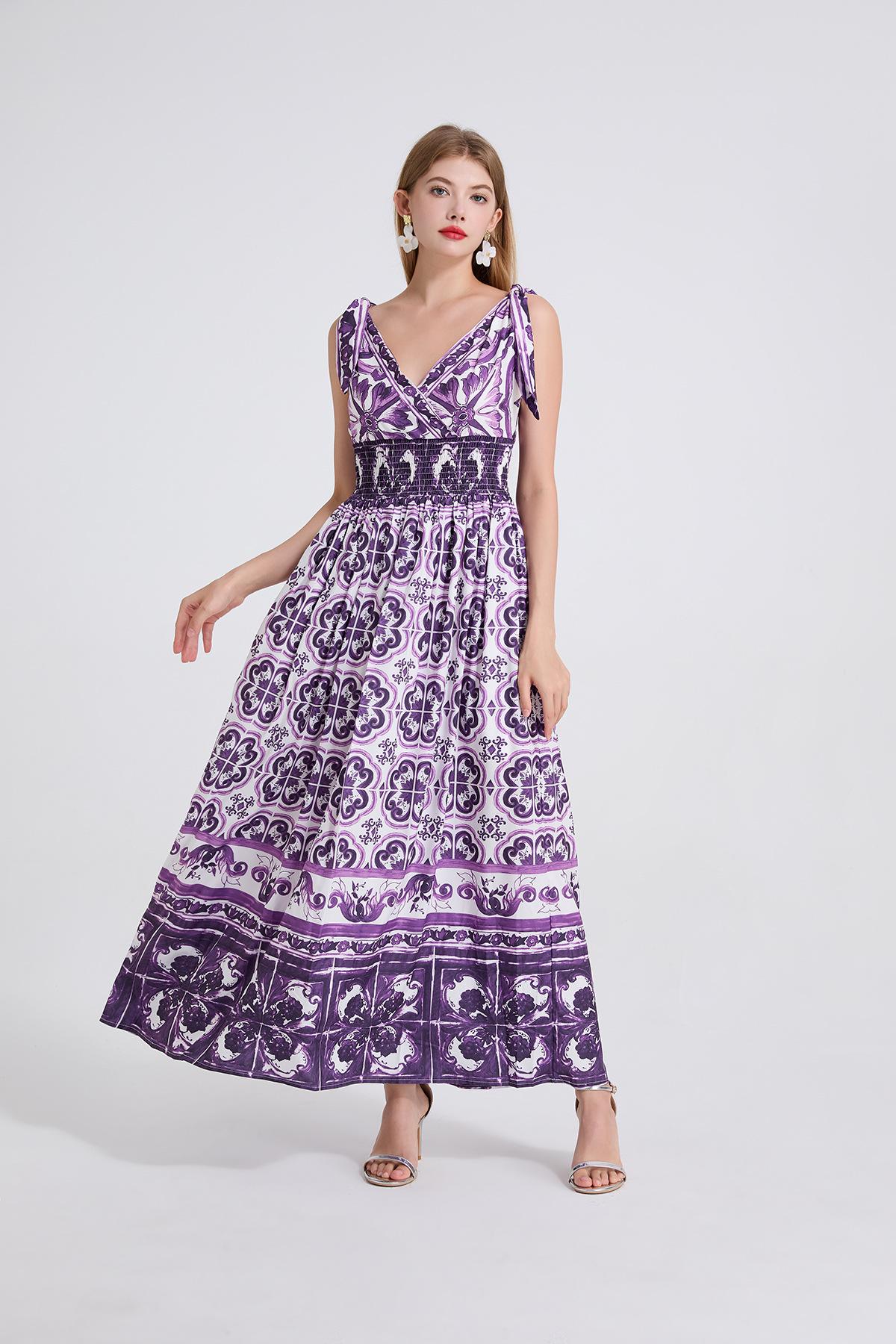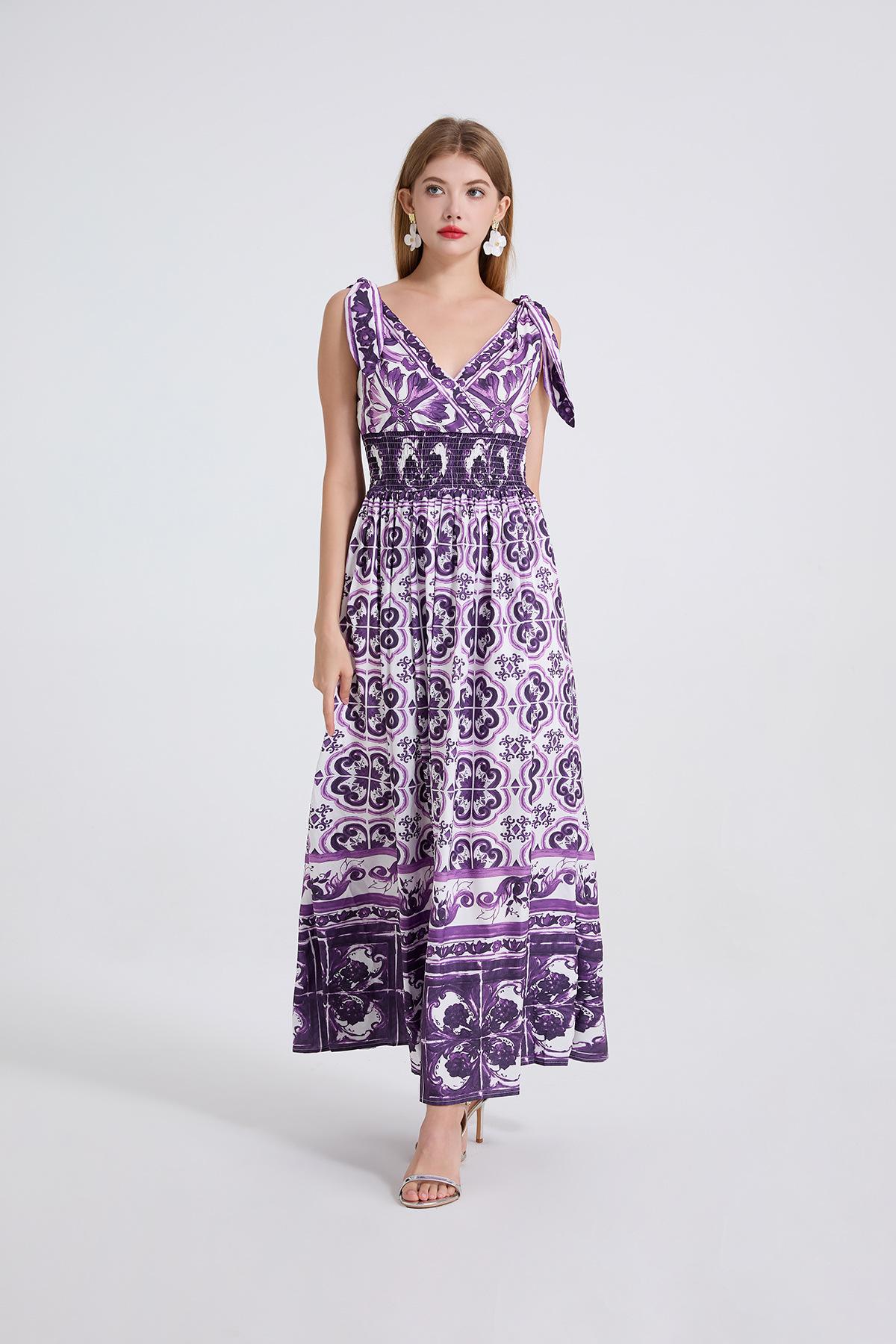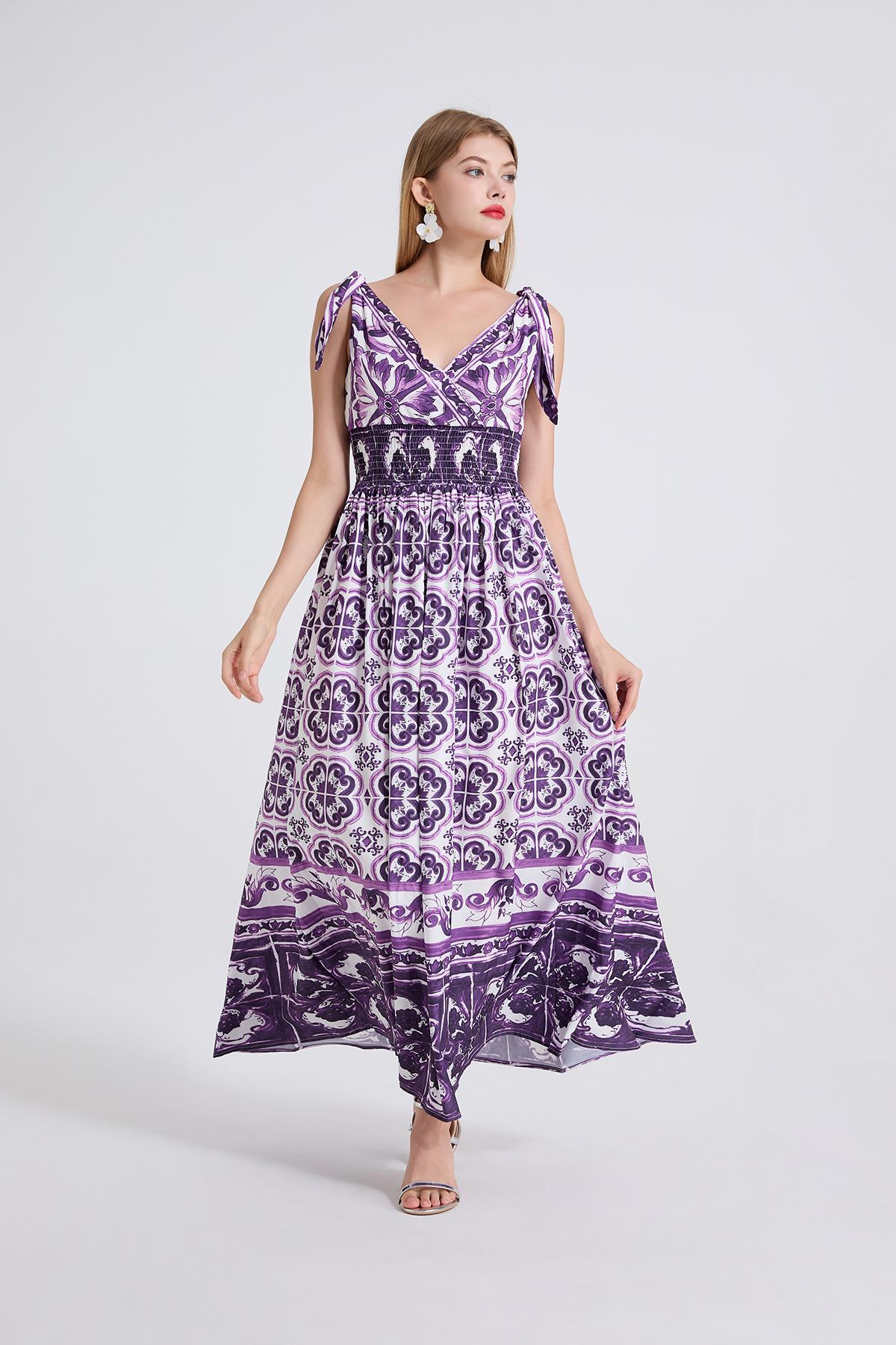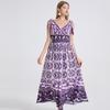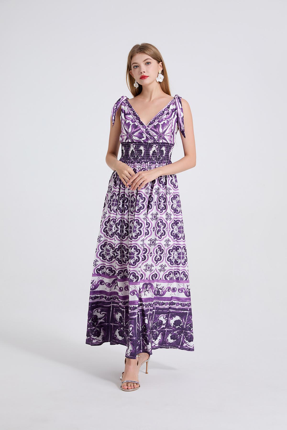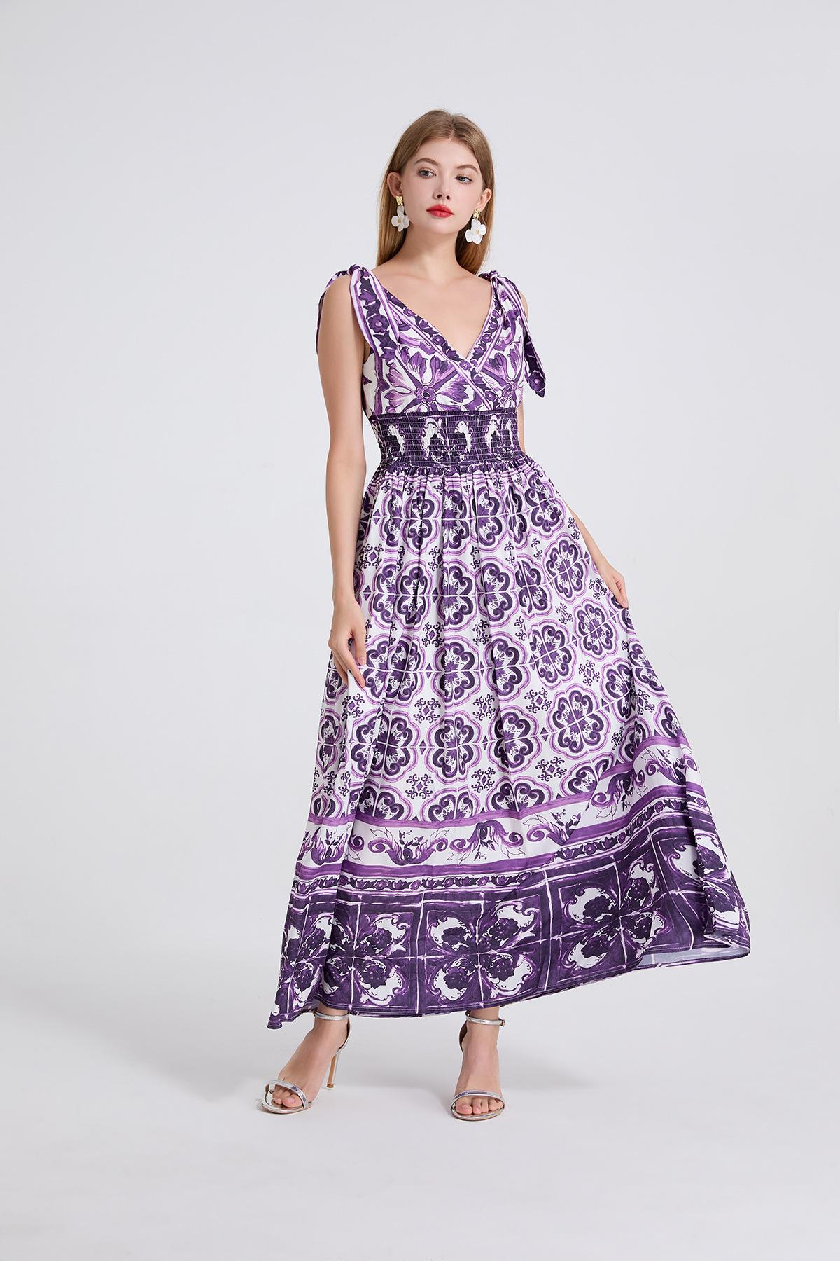 Vestido Sexy de Cuello en V con Estampado de Posicionamiento, Cintura Elástica, para Vacaciones en la Playa, con Lazos y Falda Ajustada