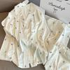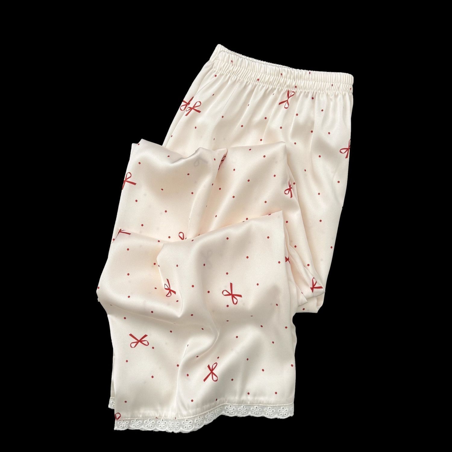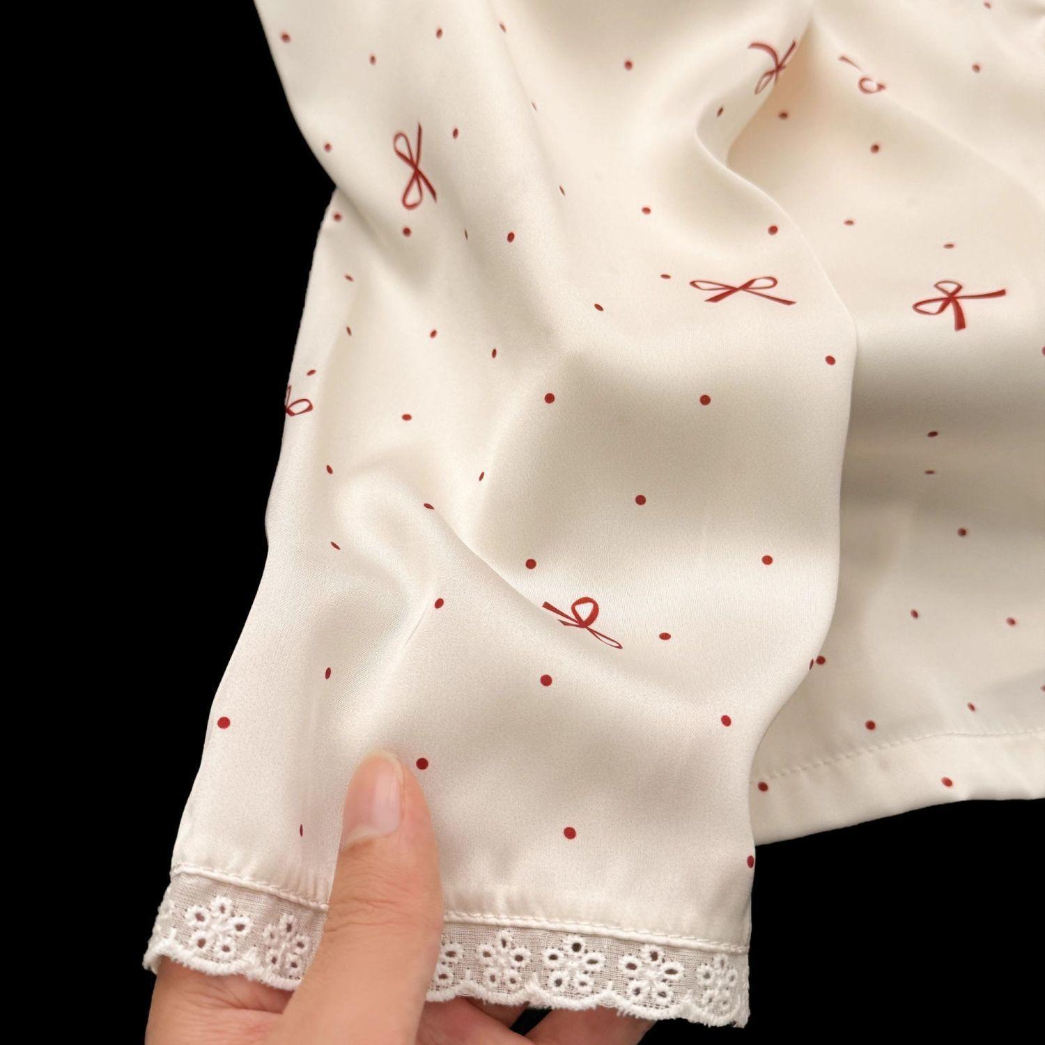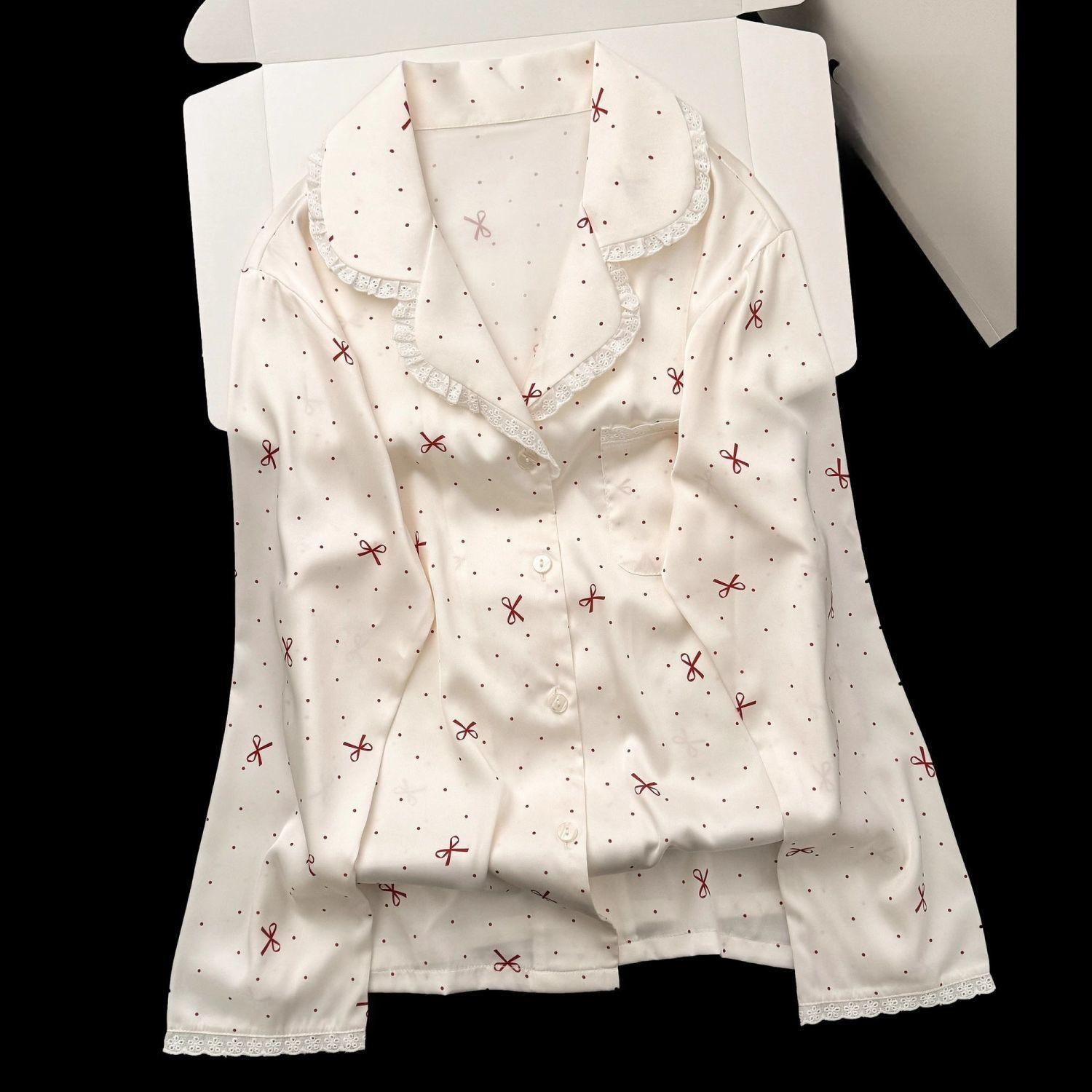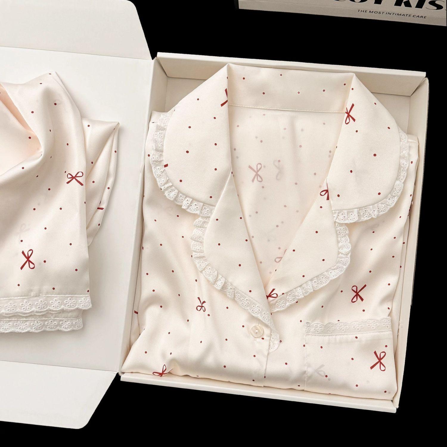 Pijama de Seda de Hielo con Lunares de Lazo para Mujer Primavera, Otoño y Verano Pantalones de Manga Larga Encaje de Alta Gama Conjunto de Ropa para el Hogar
