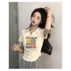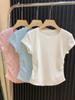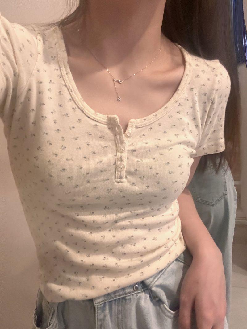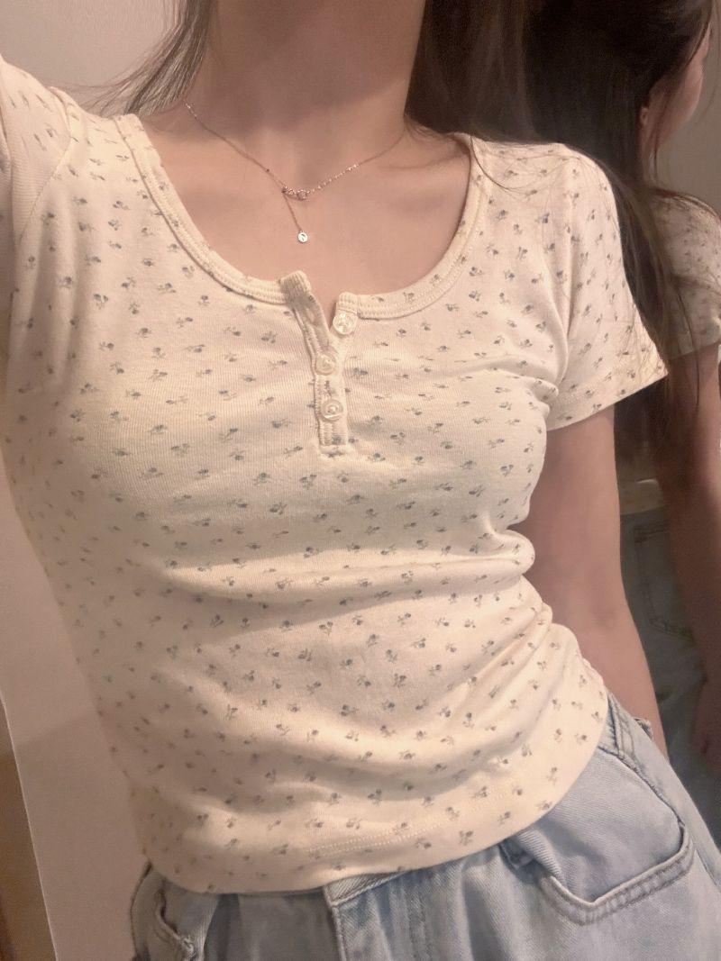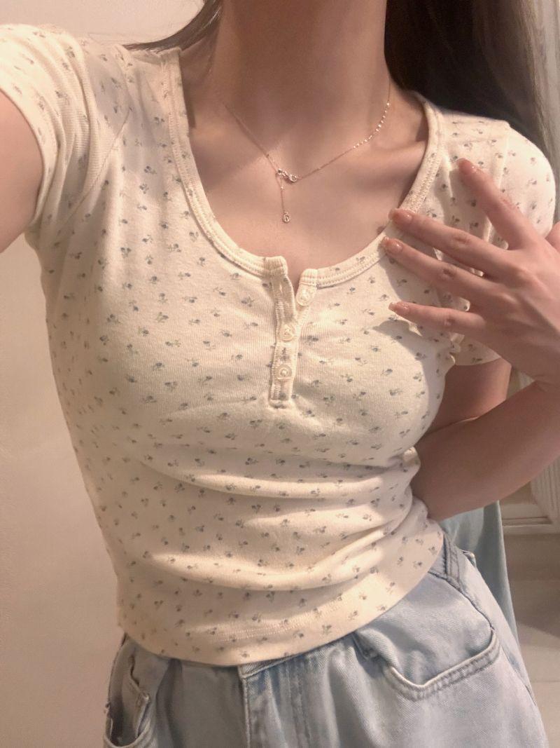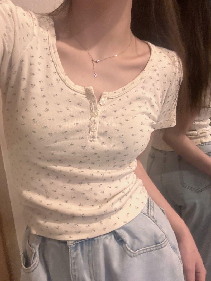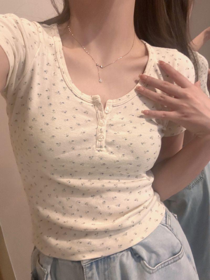 Verano Nuevo Estilo Cuello U Floral Manga Corta Hombro Regular Top Corto para Mujer, Ajustado, Adelgazante, Capa Base, Camiseta Fresca para Mujer Venta al Mayoreo