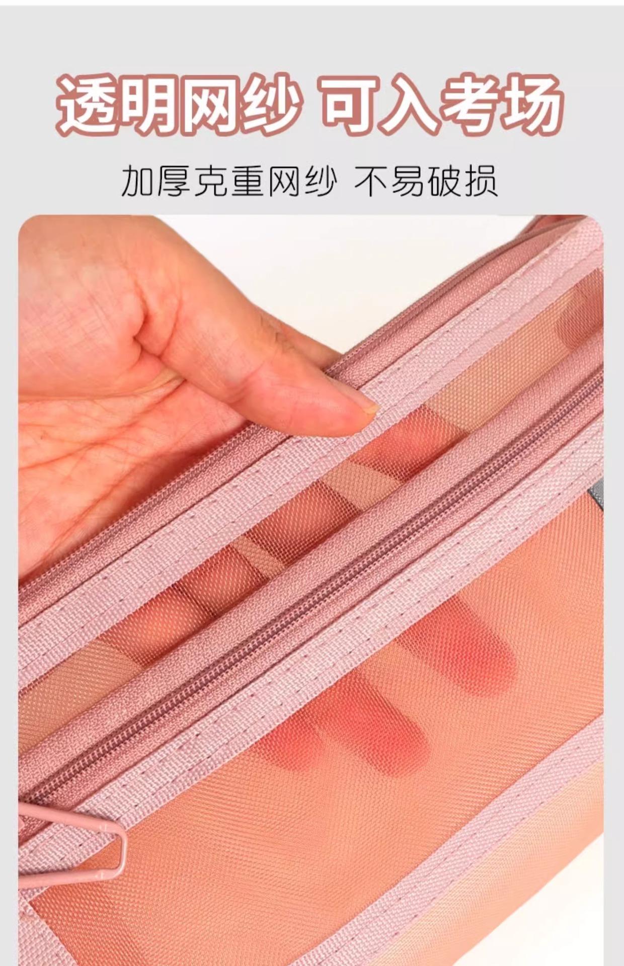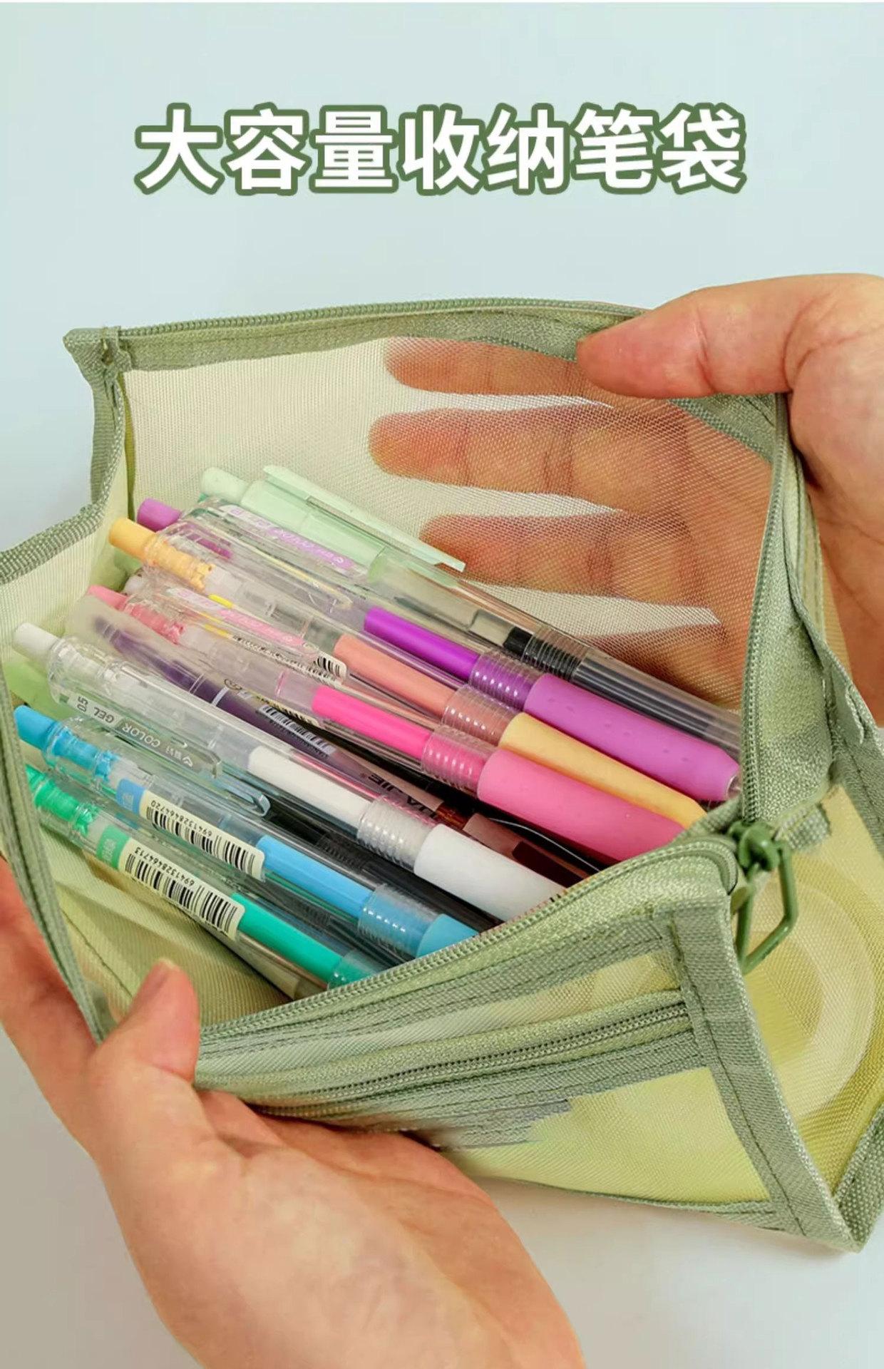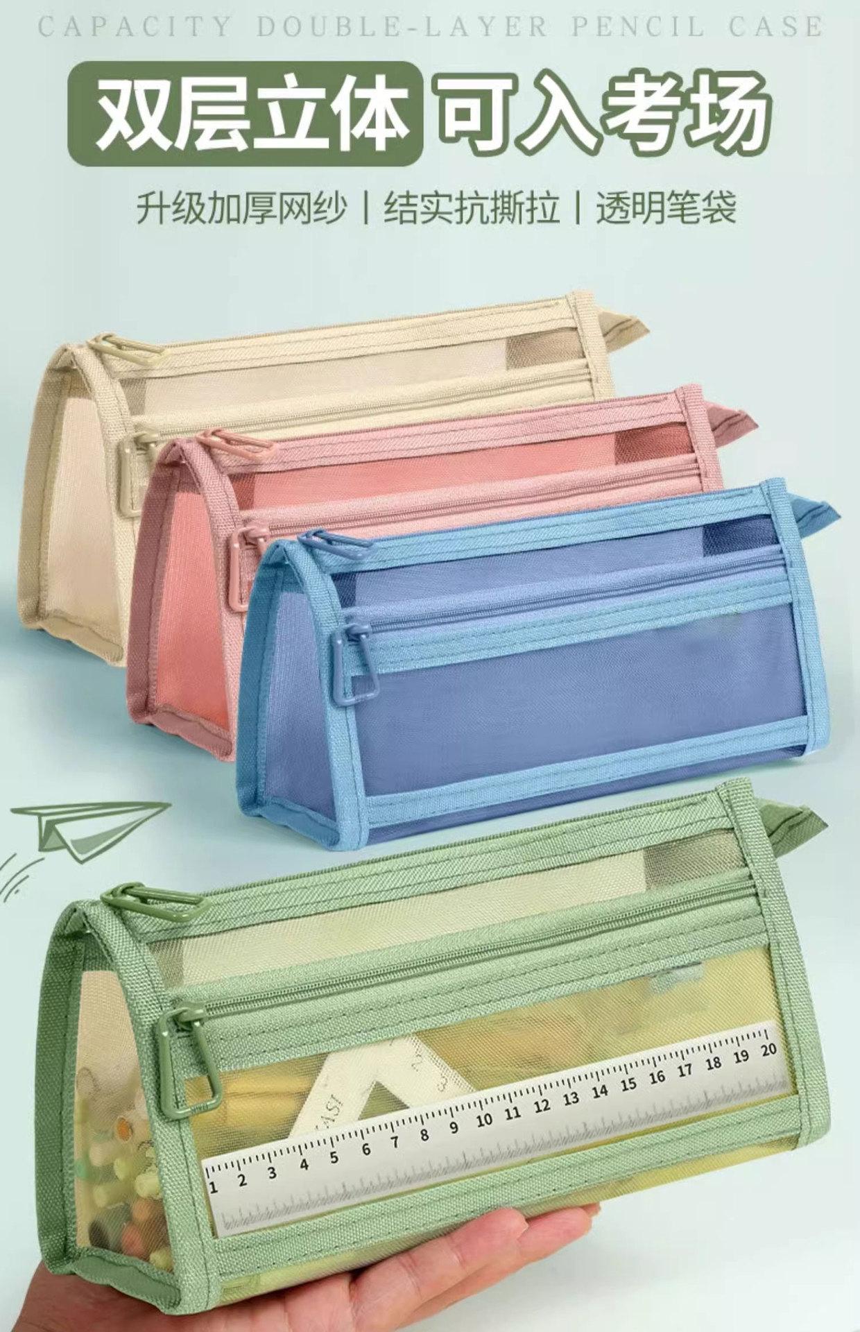 Morandi pencil case ins style casual transparent mesh double layer large capacity student exam zipper stationery storage bag