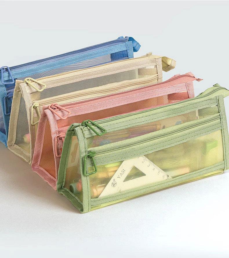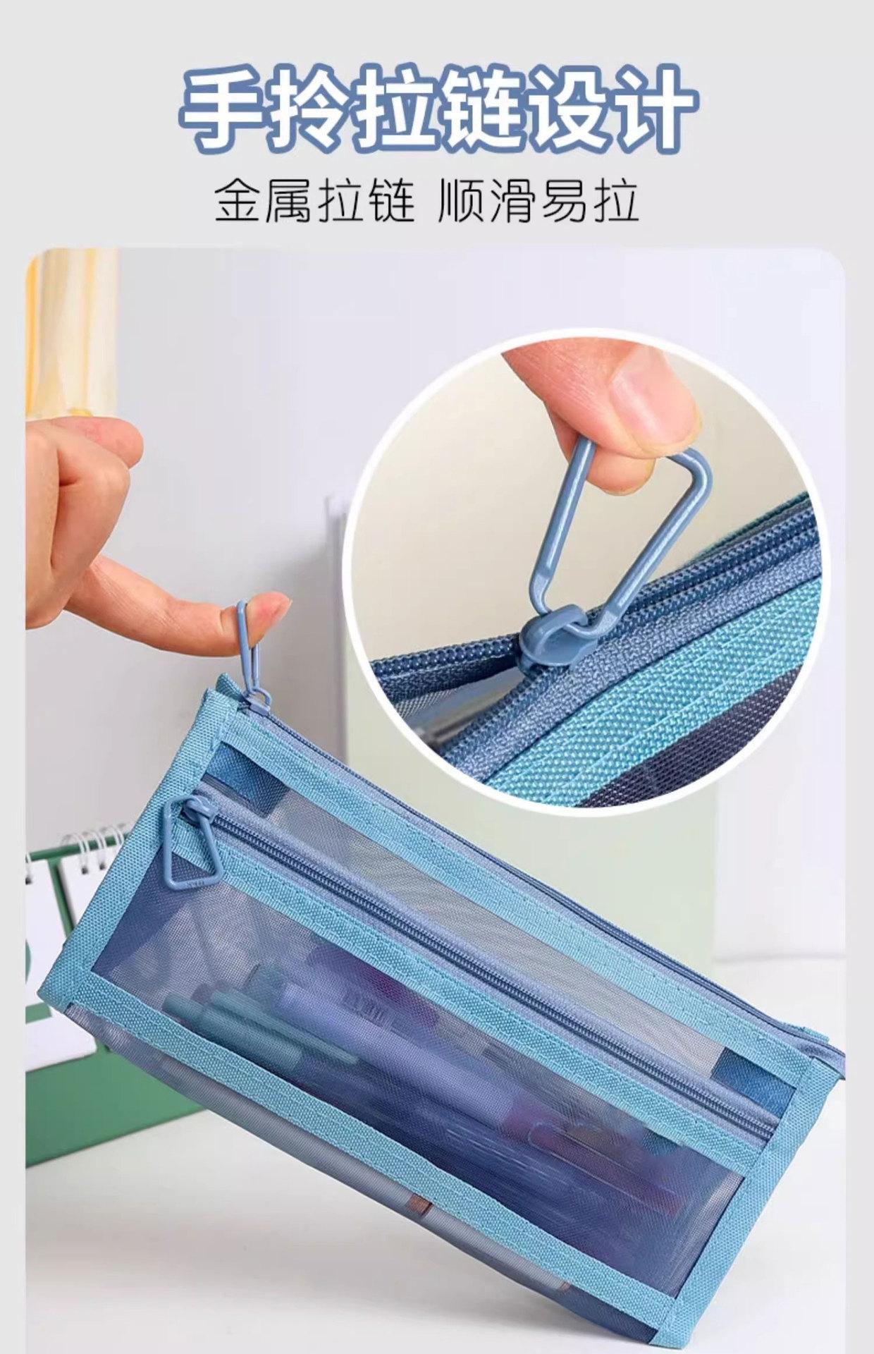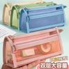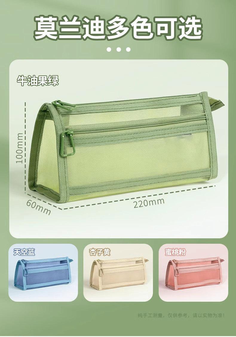 Morandi pencil case ins style casual transparent mesh double layer large capacity student exam zipper stationery storage bag