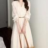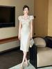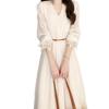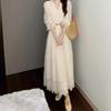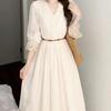 Vestido de Encaje de Manga Larga con Cuello de Verano Nuevo 2025 para Damas Encaje Blanco Francés Hermosa Falda con Cintura Entallada para Mujer