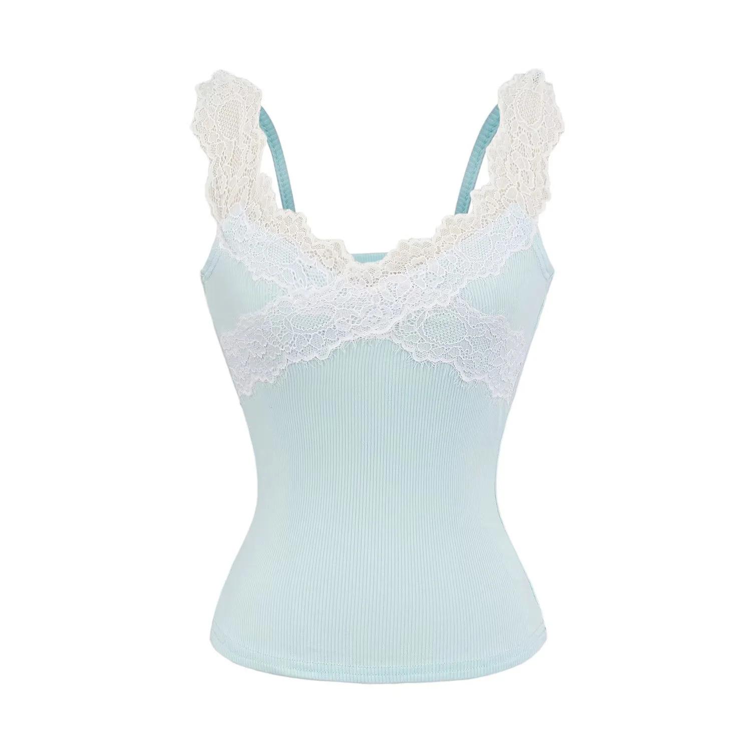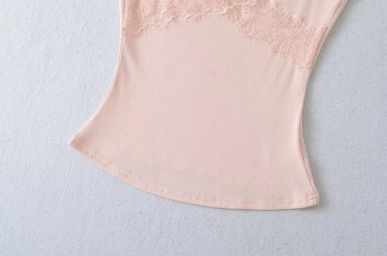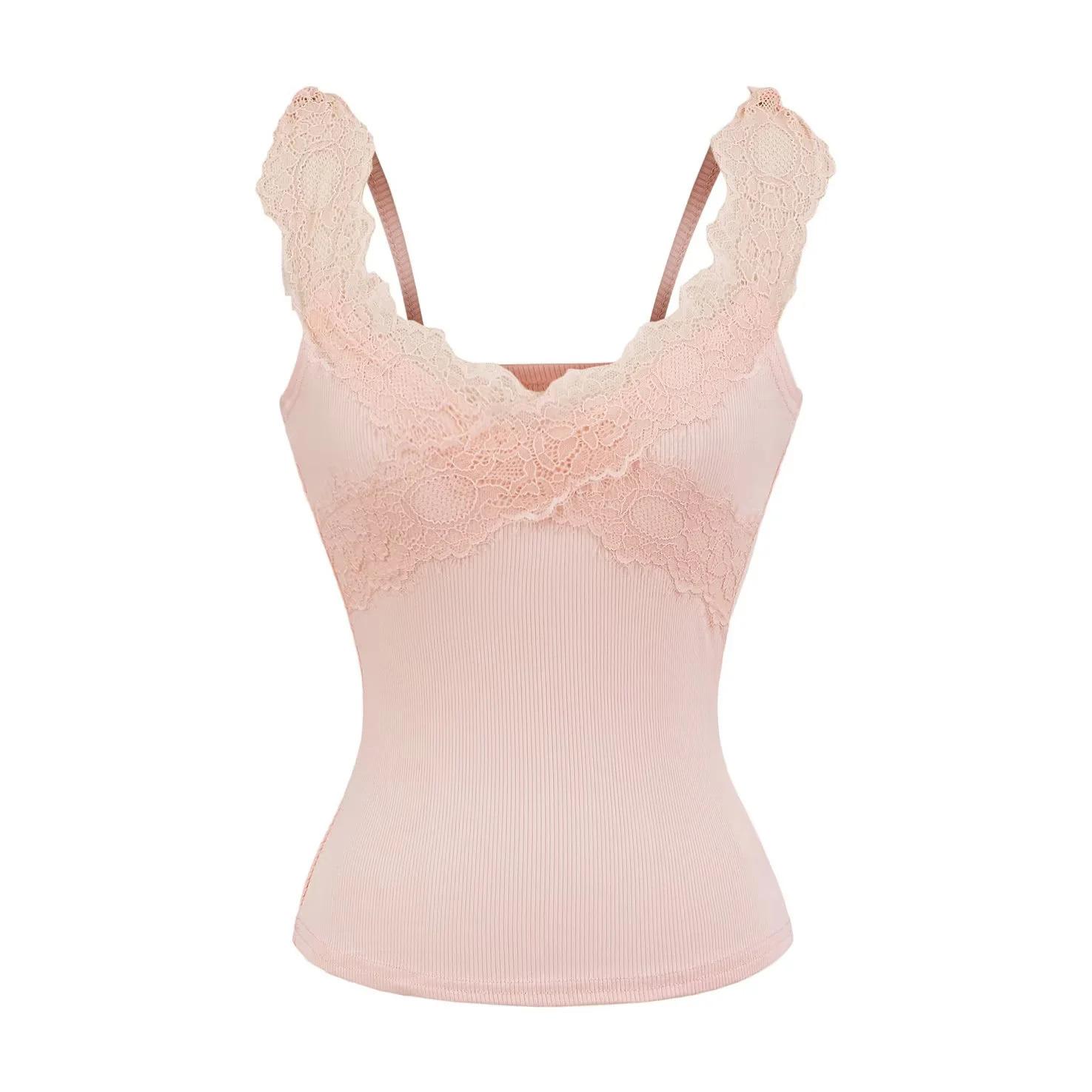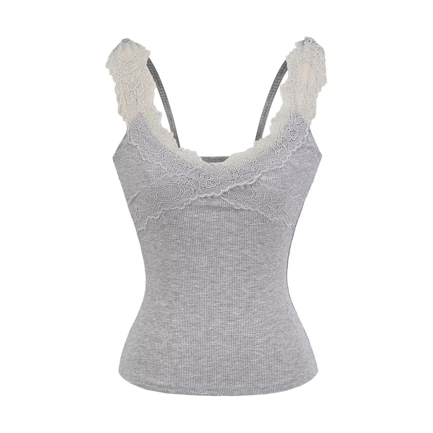 Verano Chica Americana Caliente Encaje Empalme Camisola sin Mangas para Mujer Estilo Pura Lujuria Cuello en V Ajustada Sexy Top Exterior
