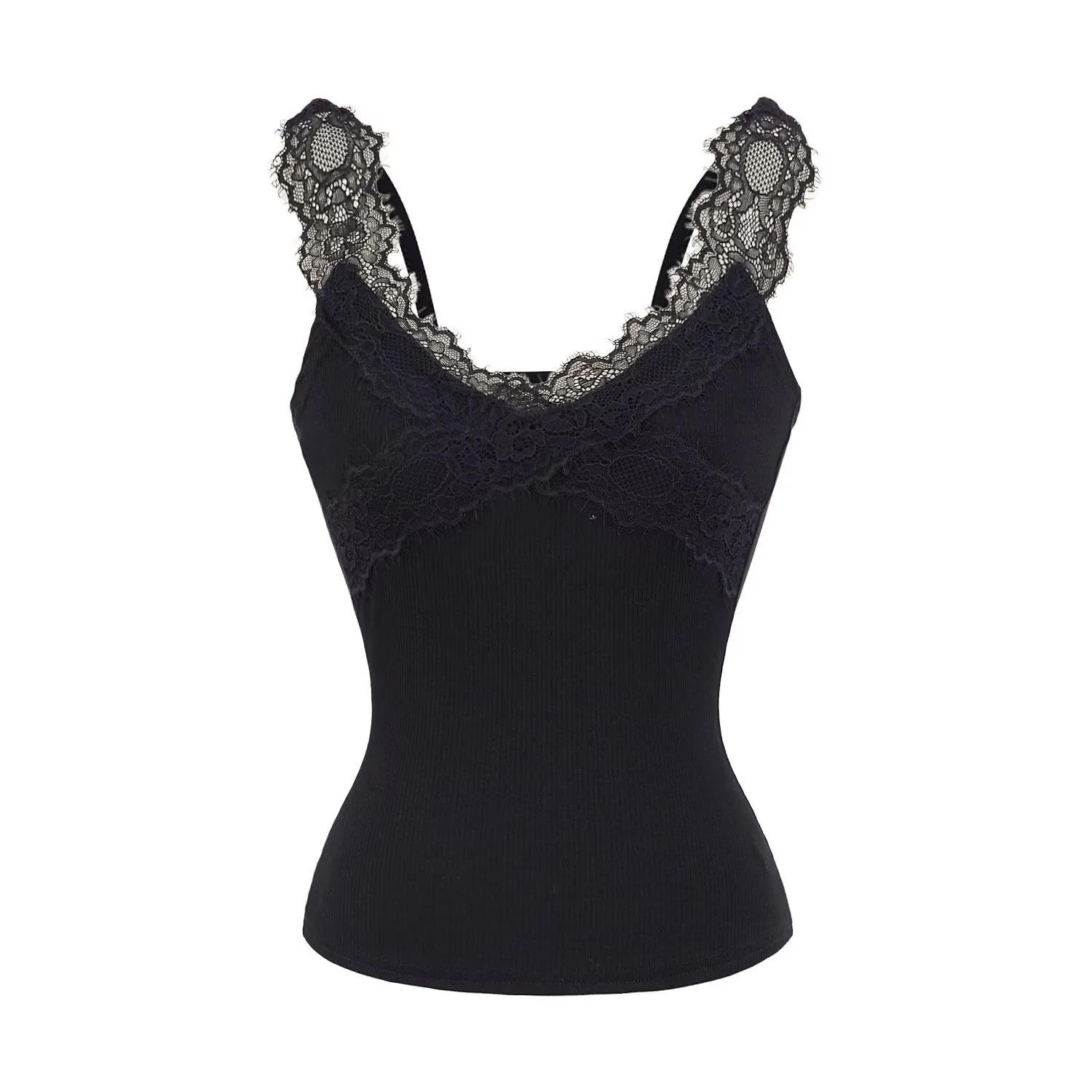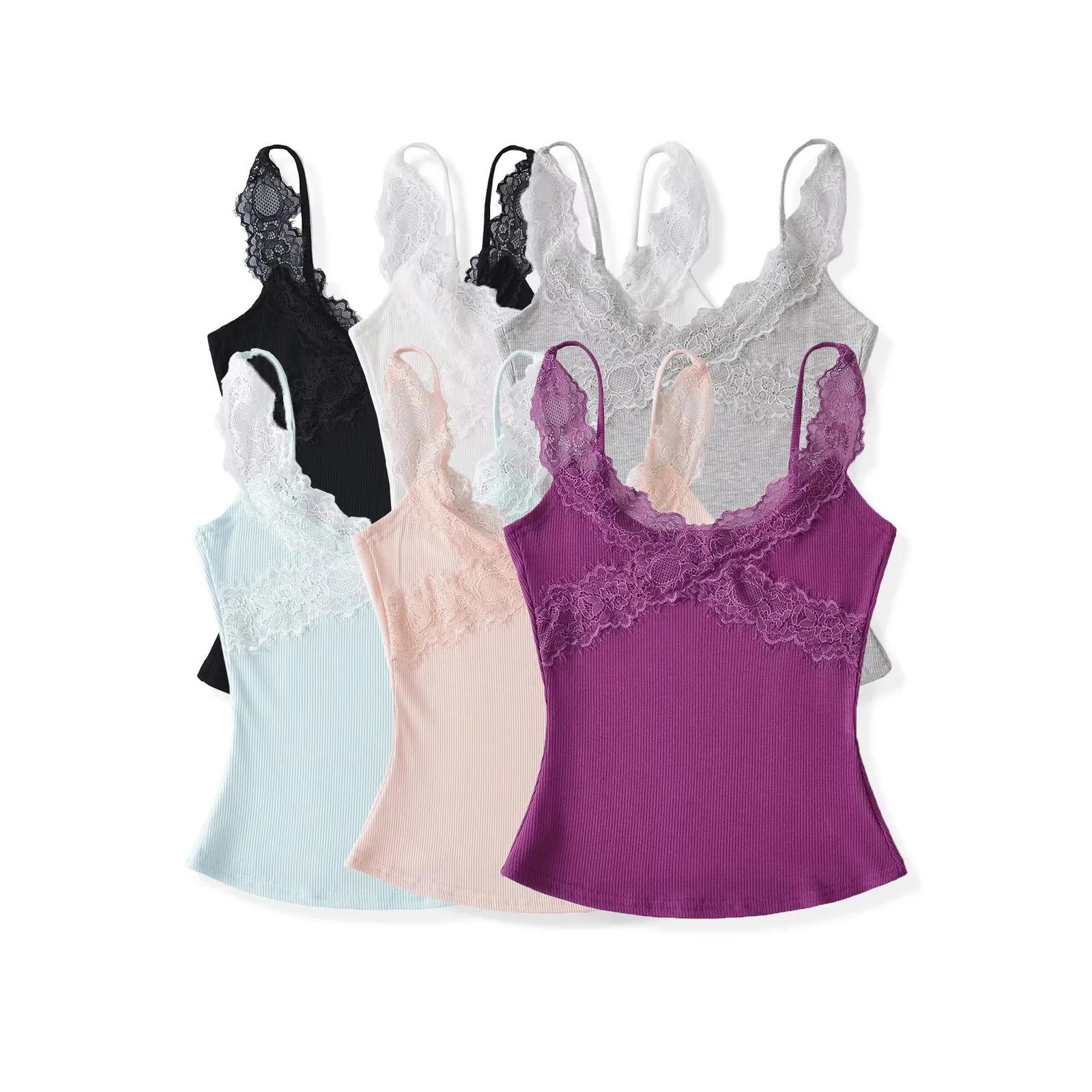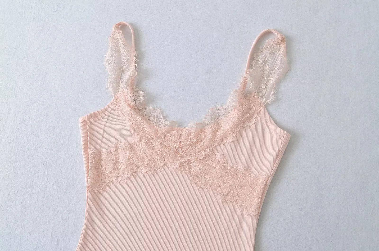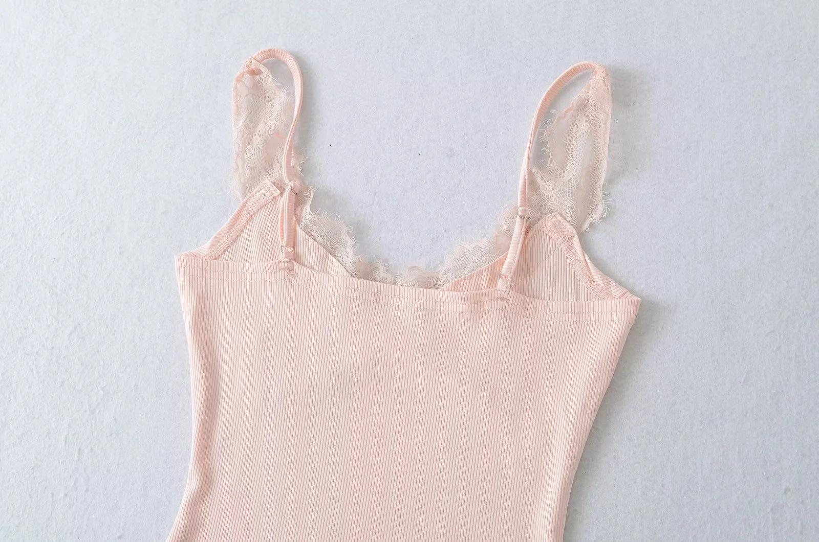 Verano Chica Americana Caliente Encaje Empalme Camisola sin Mangas para Mujer Estilo Pura Lujuria Cuello en V Ajustada Sexy Top Exterior