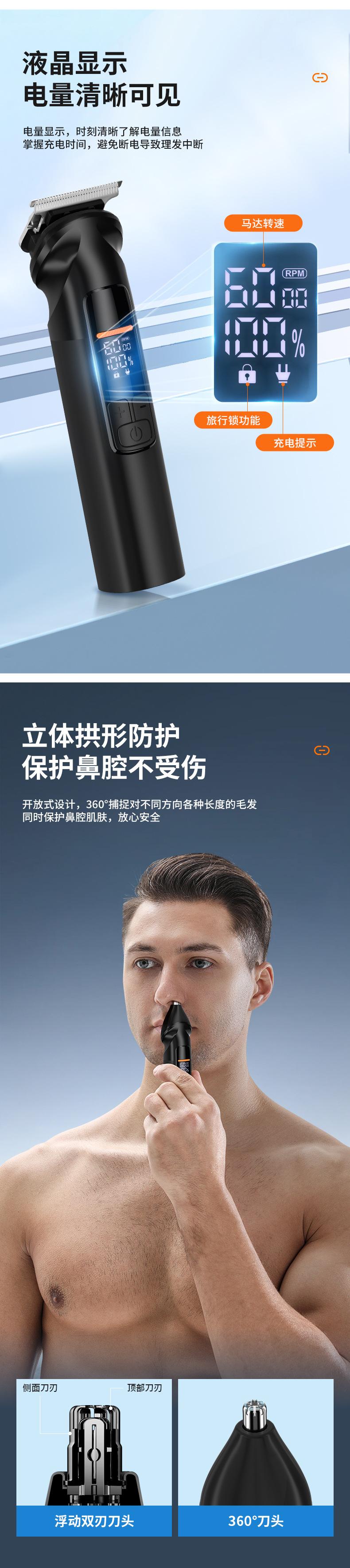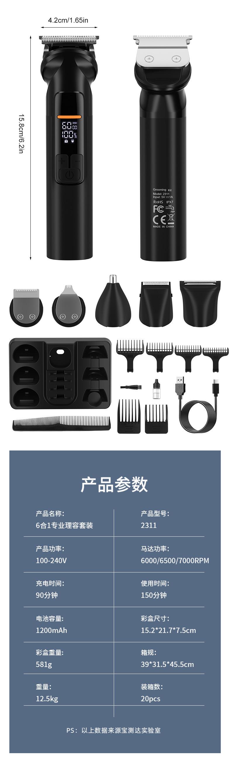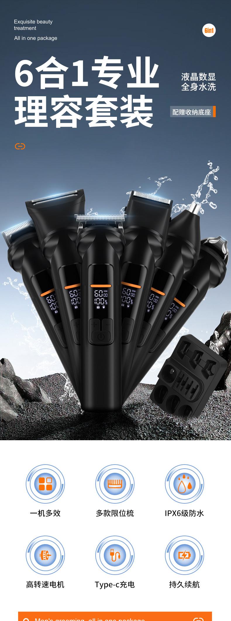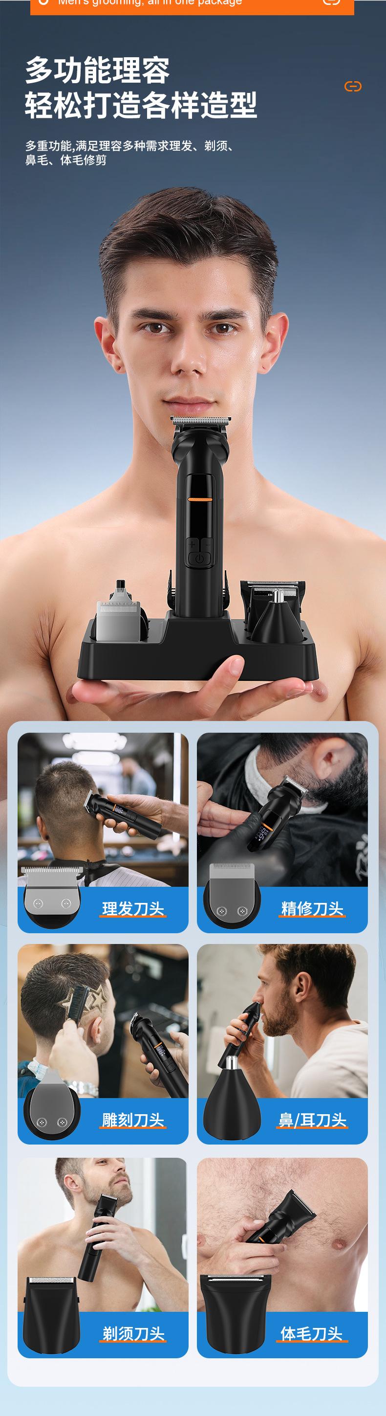 Accesorios del producto: Unidad principal + Cabezal cortapelos + Cabezal grabador + Recortador de vello nasal + Cabezal recortador de patillas + Cabezal afeitador + Manual en inglés + Cable de carga TIPO-C + Peines de ajuste*6 + Cepillo de limpieza + Botella de aceite + Base + Peine