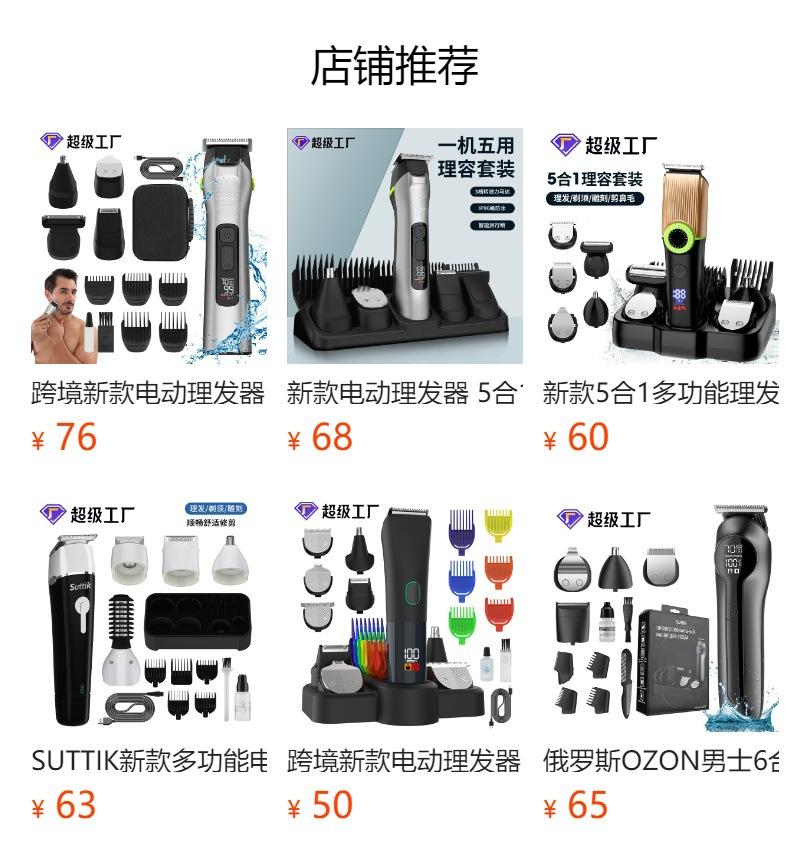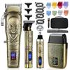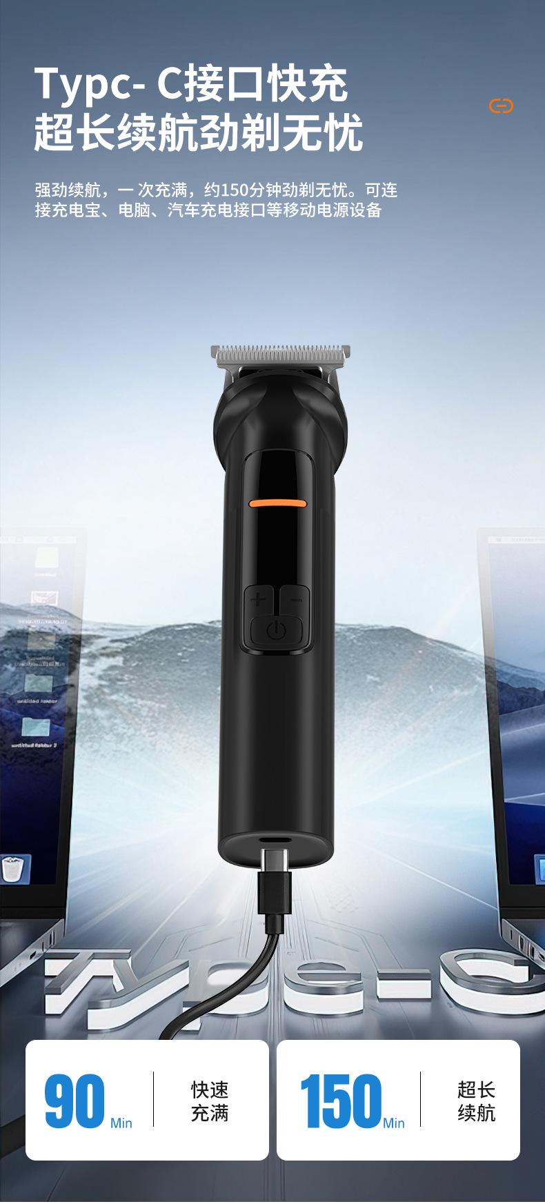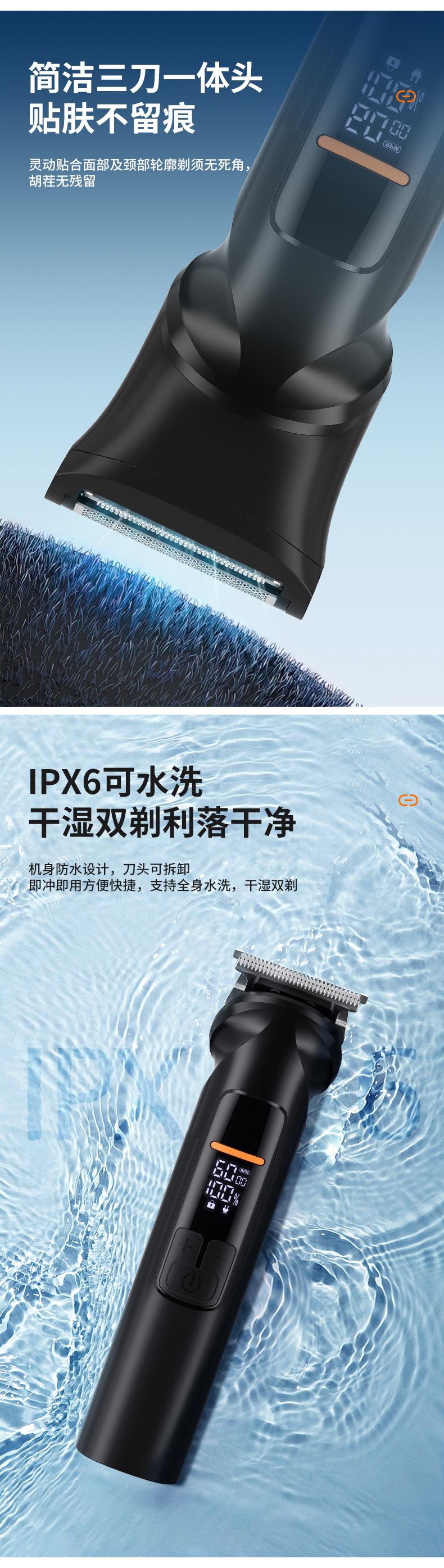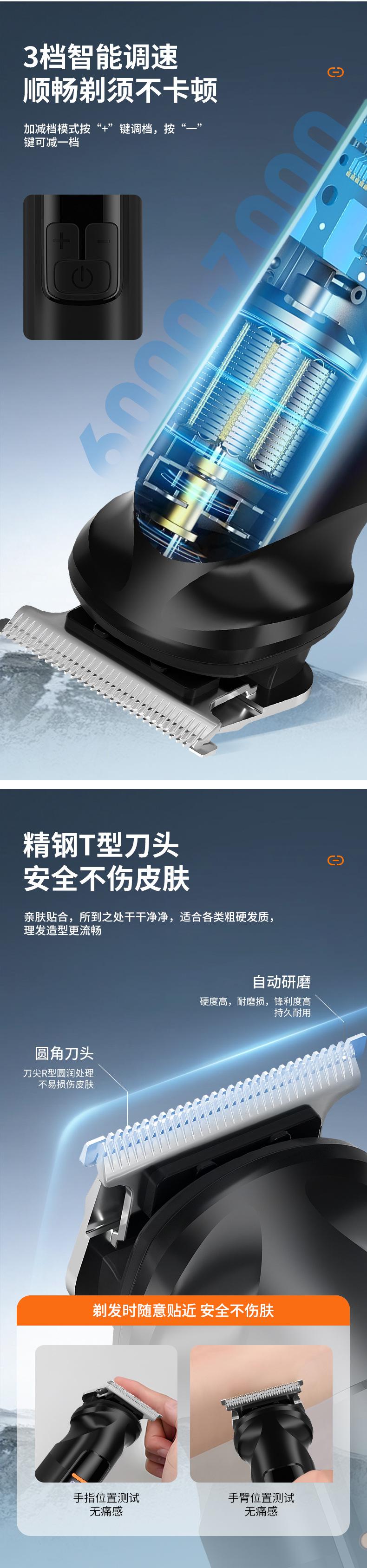 Accesorios del producto: Unidad principal + Cabezal cortapelos + Cabezal grabador + Recortador de vello nasal + Cabezal recortador de patillas + Cabezal afeitador + Manual en inglés + Cable de carga TIPO-C + Peines de ajuste*6 + Cepillo de limpieza + Botella de aceite + Base + Peine