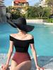 Traje de baño de una pieza con hombro descubierto de venta directa de fábrica para mujer, traje de baño recogido para pecho pequeño, BIKINI retro de color contrastante para mujer