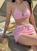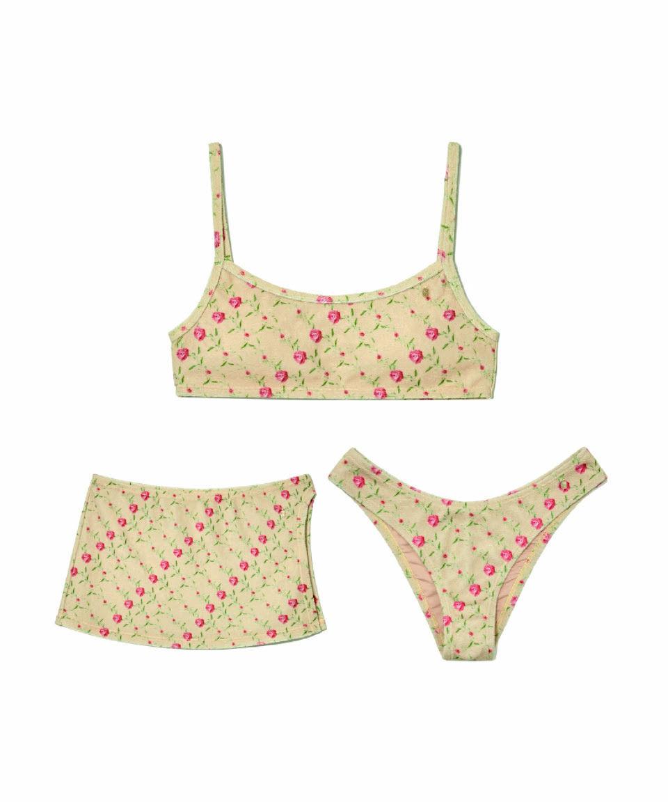 Traje de baño de tres piezas con falda dividida, de alta gama, con tirantes finos y estampado floral para niña