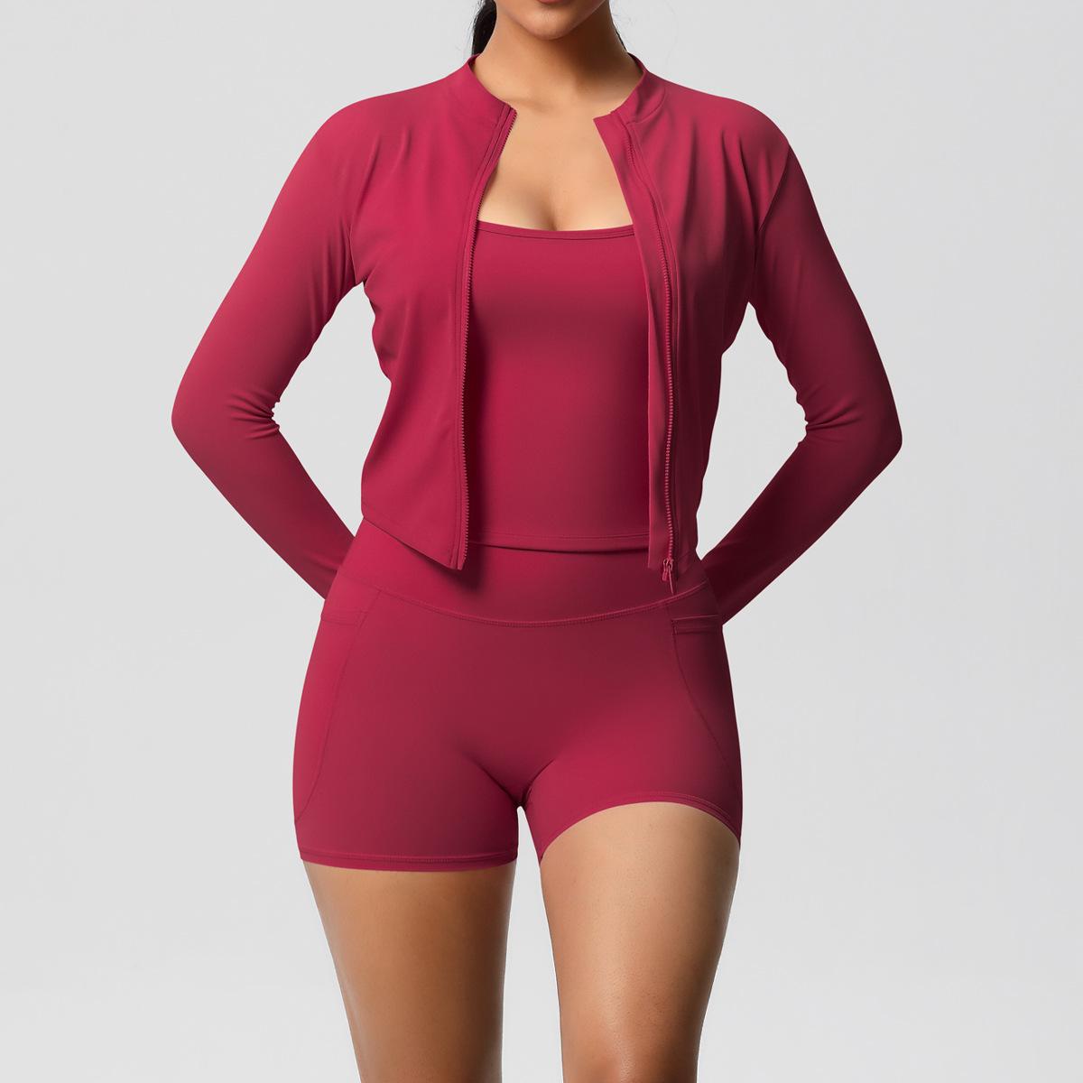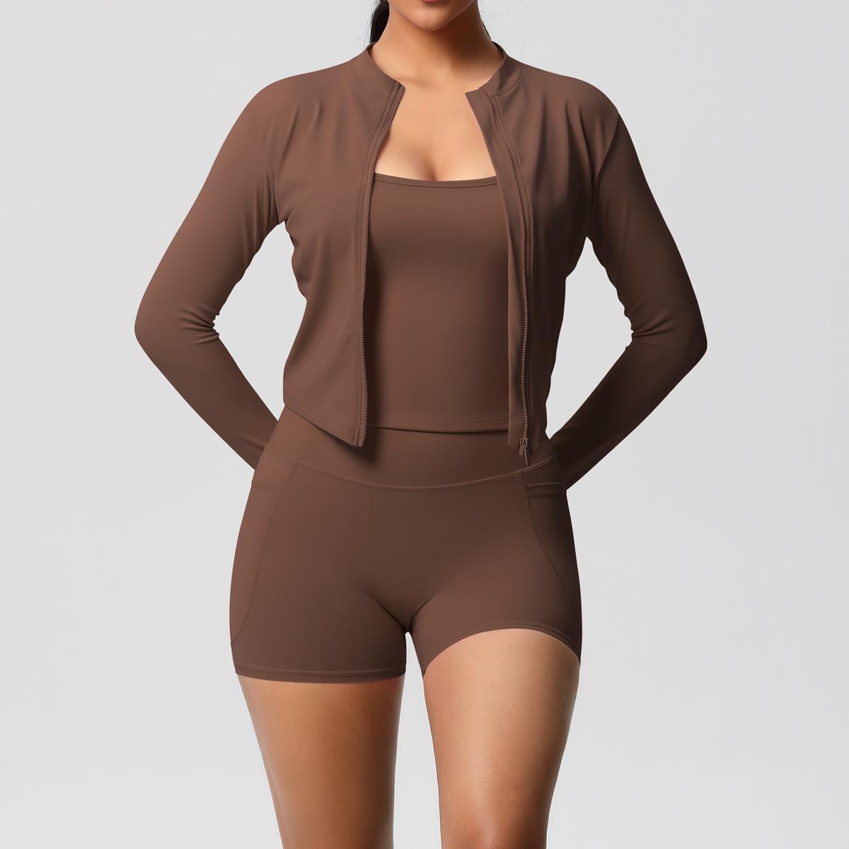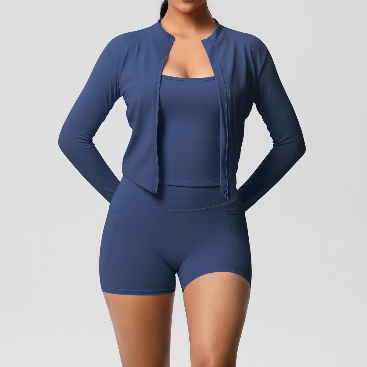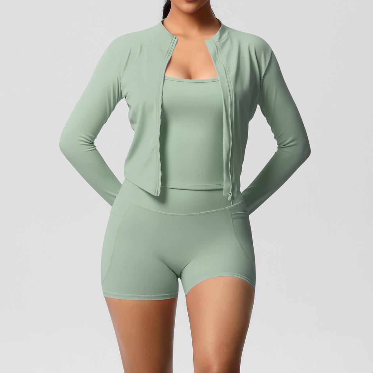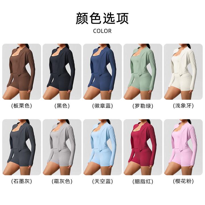 Transfronterizo Nuevo Chaleco Desnudo Ropa Ajustada Casual para Exterior Fitness Pantalones Cortos con Bolsillos Ropa de Yoga Conjunto Deportivo de Tres Piezas