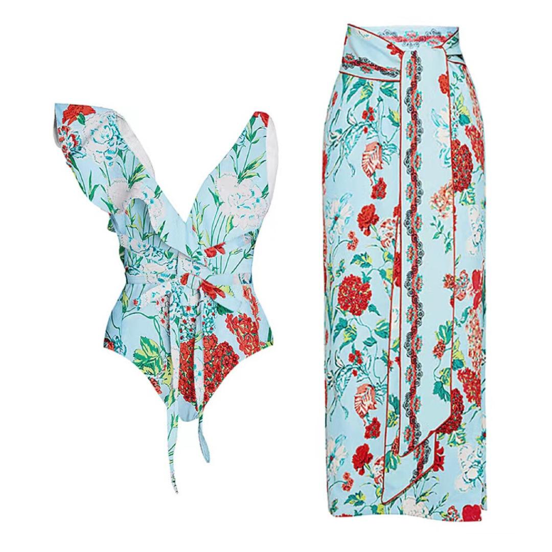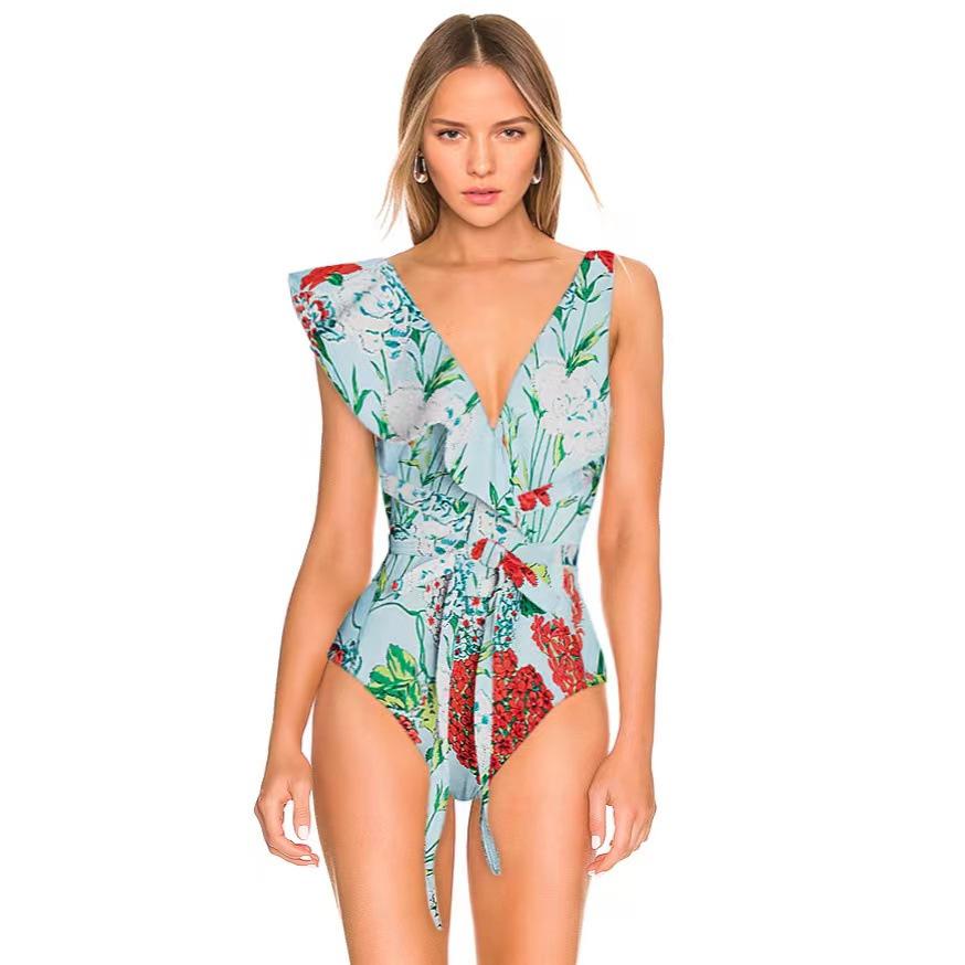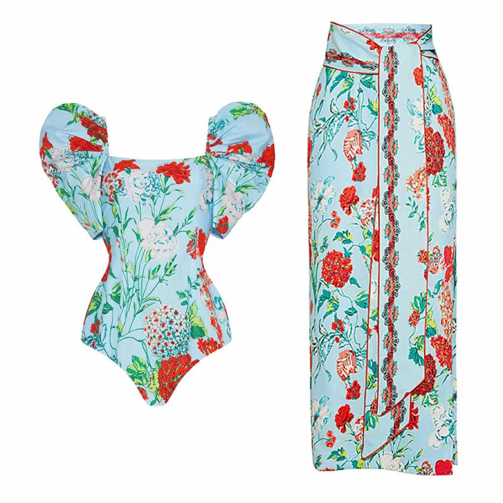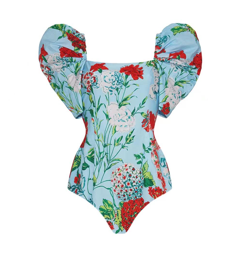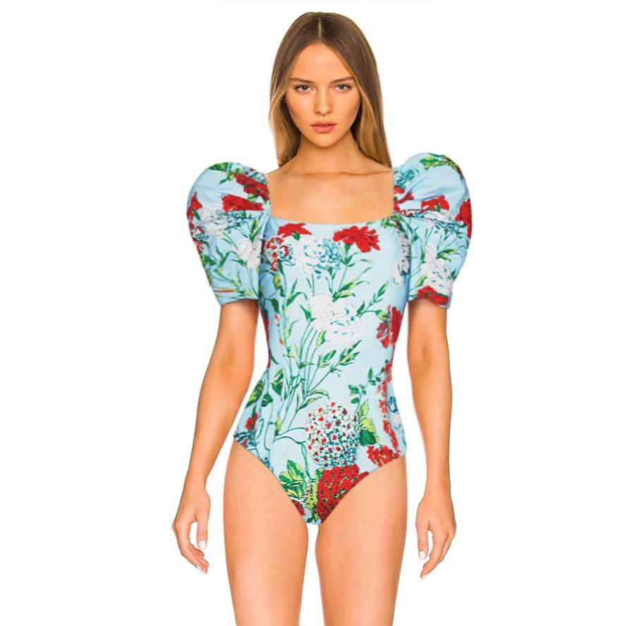 Ruffled one-piece suit, Single ruffle one-piece swimsuit, Single wrap skirt, Puff sleeve jumpsuit, Single puff...