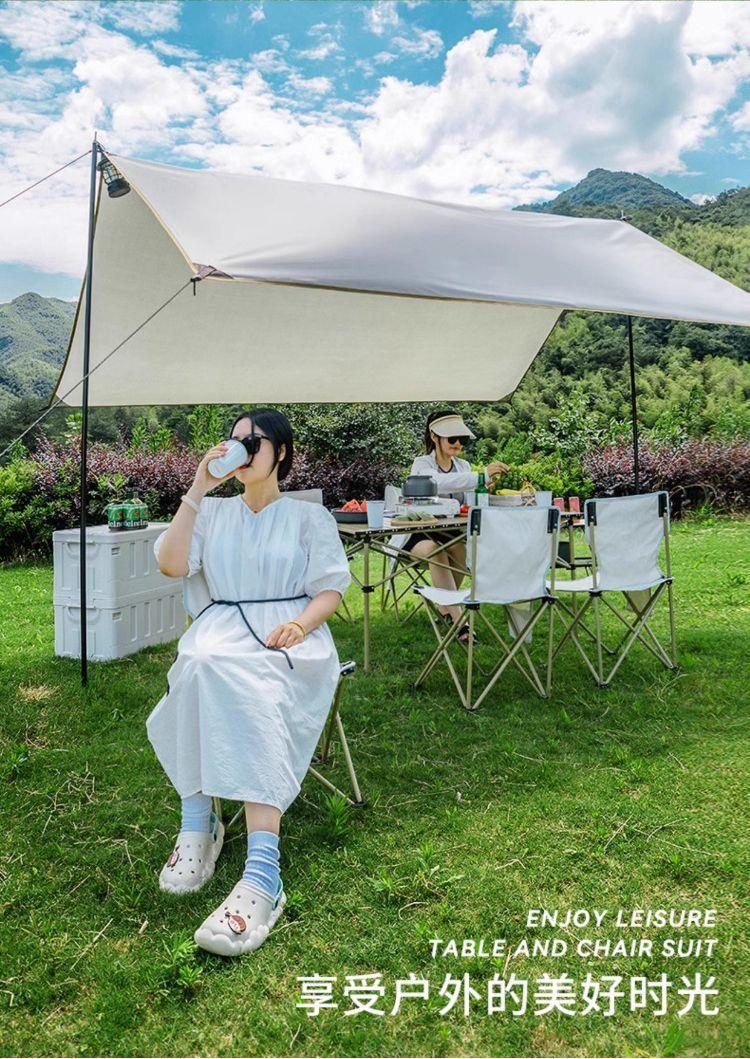 Foldable black 95cm long table, Foldable khaki 95cm long table, Moon chair black, Moon chair white