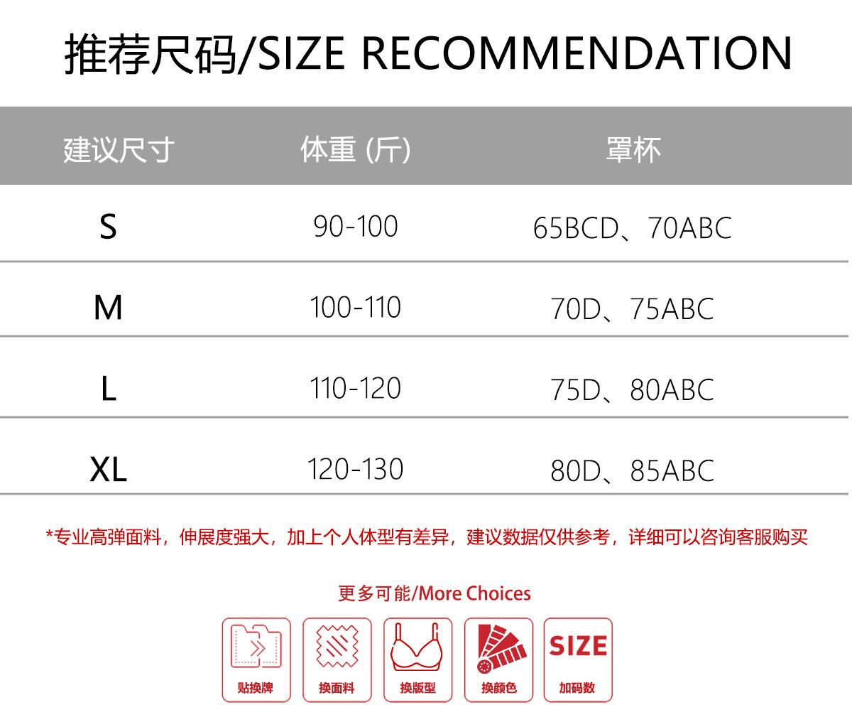 S (recommended within 50kg ), M (recommended 50-55kg ), L (recommended 55-60kg ), Xl (recommended 60-65kg )