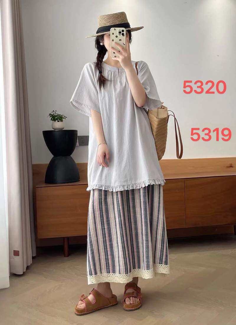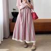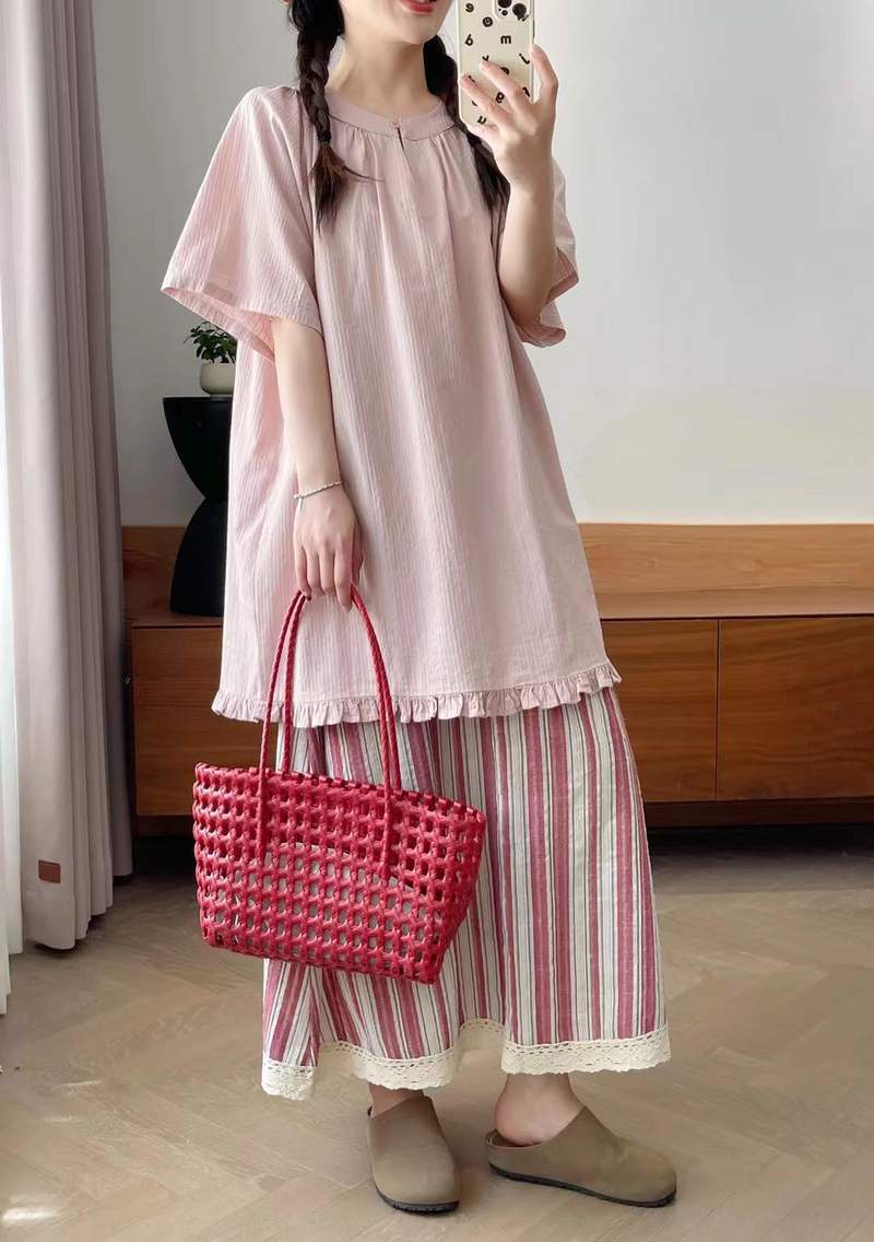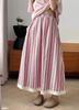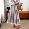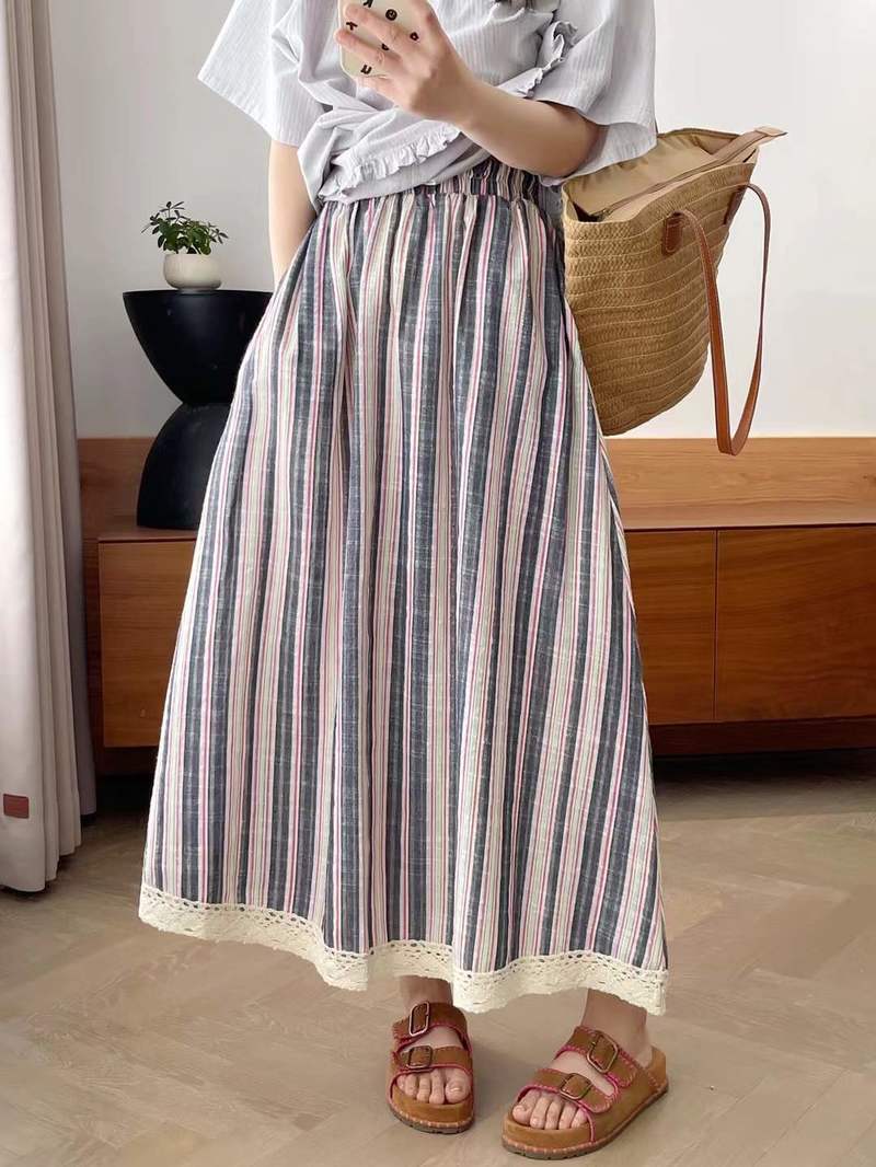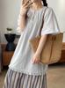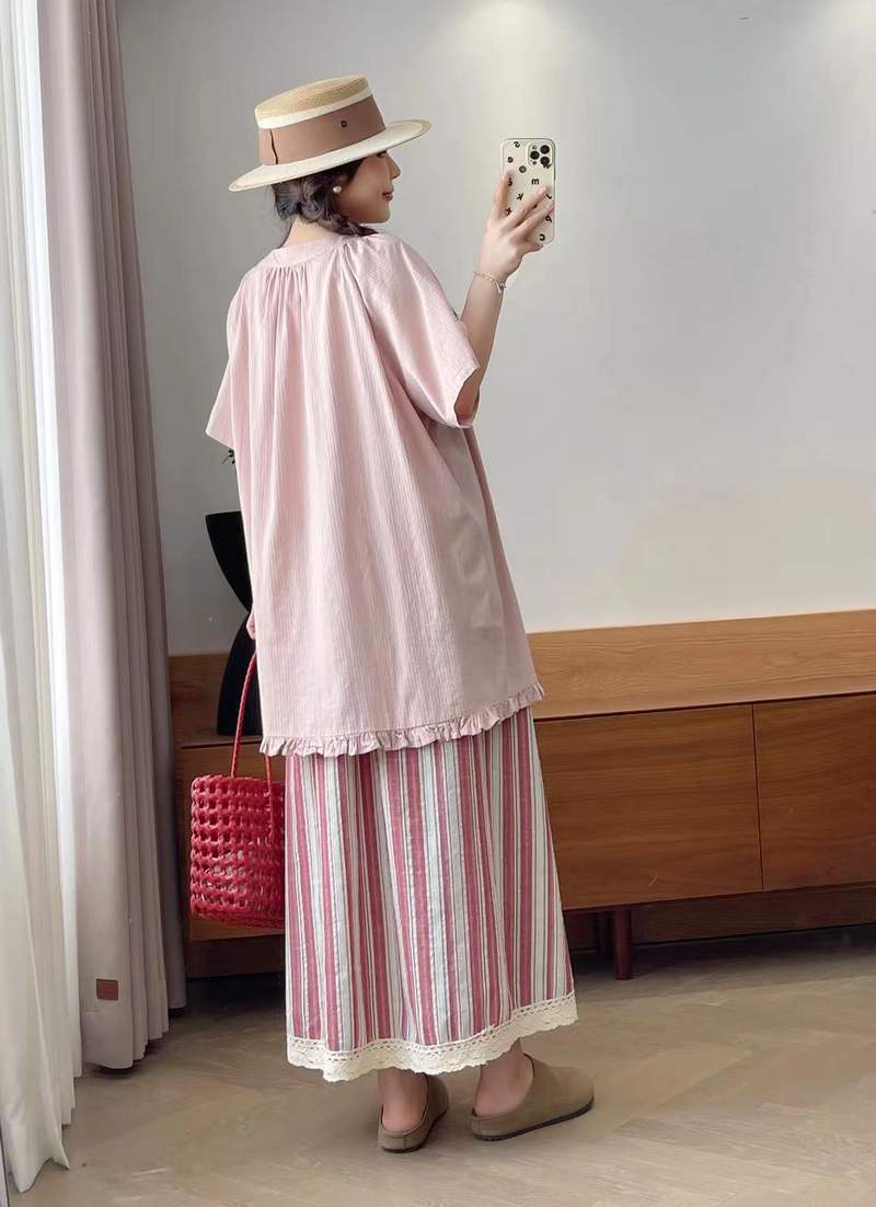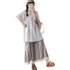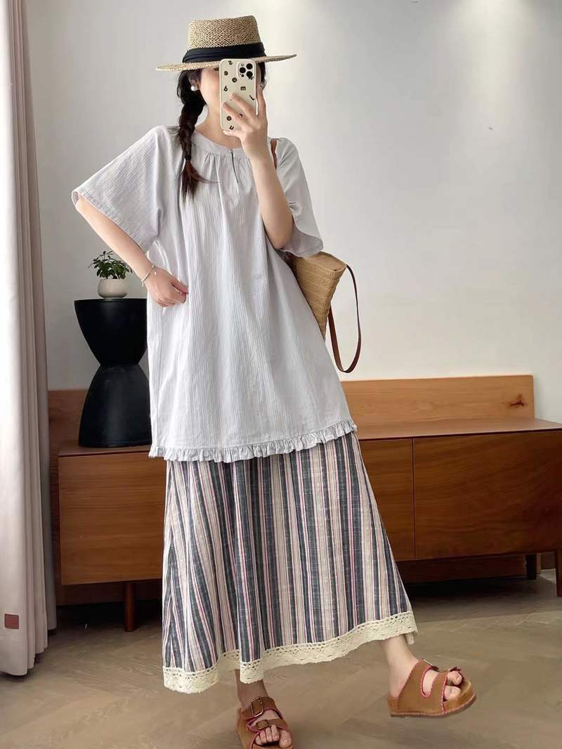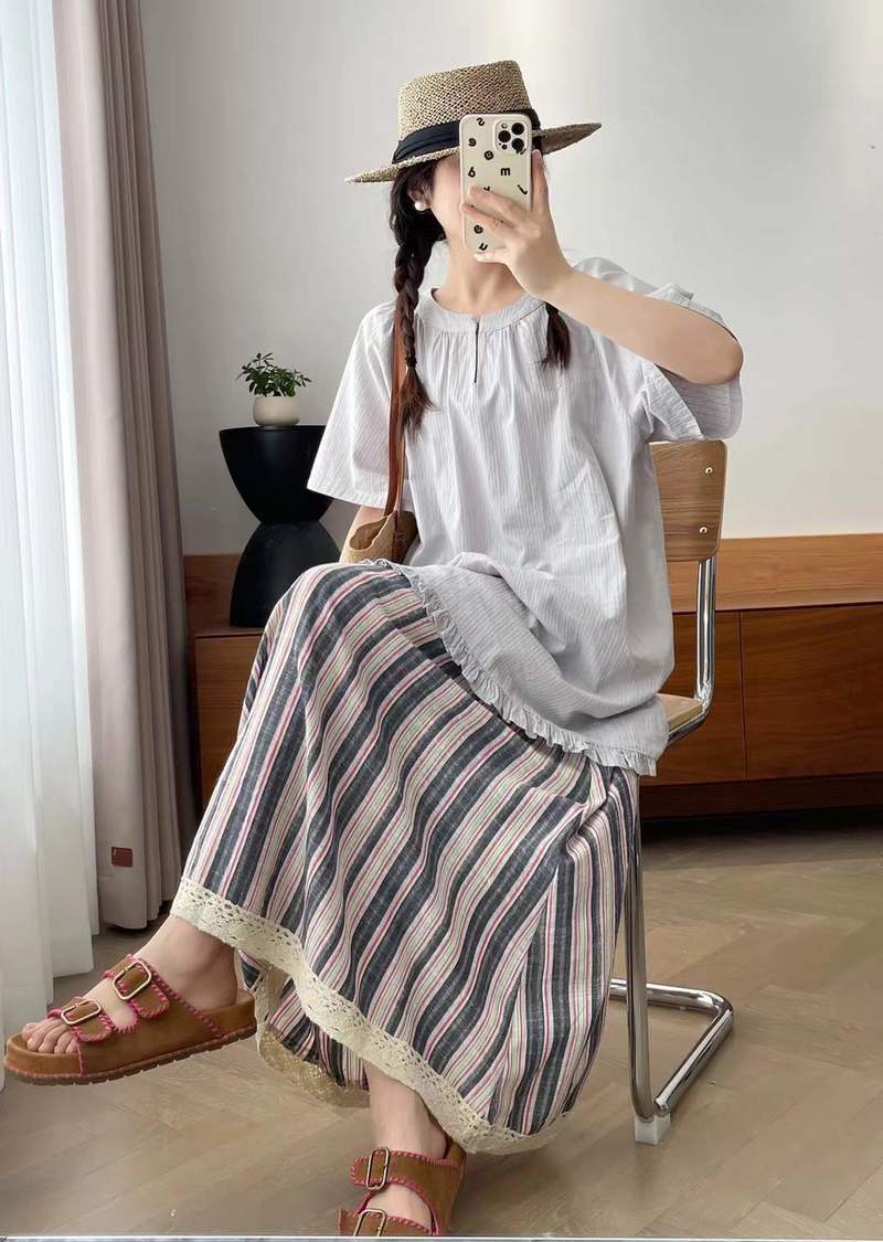 Suéter de Cuello Redondo Estilo Japonés Camisa de Manga Corta de Largo Medio Falda a Rayas Patchwork con Encaje de Cintura Alta Conjunto Versátil