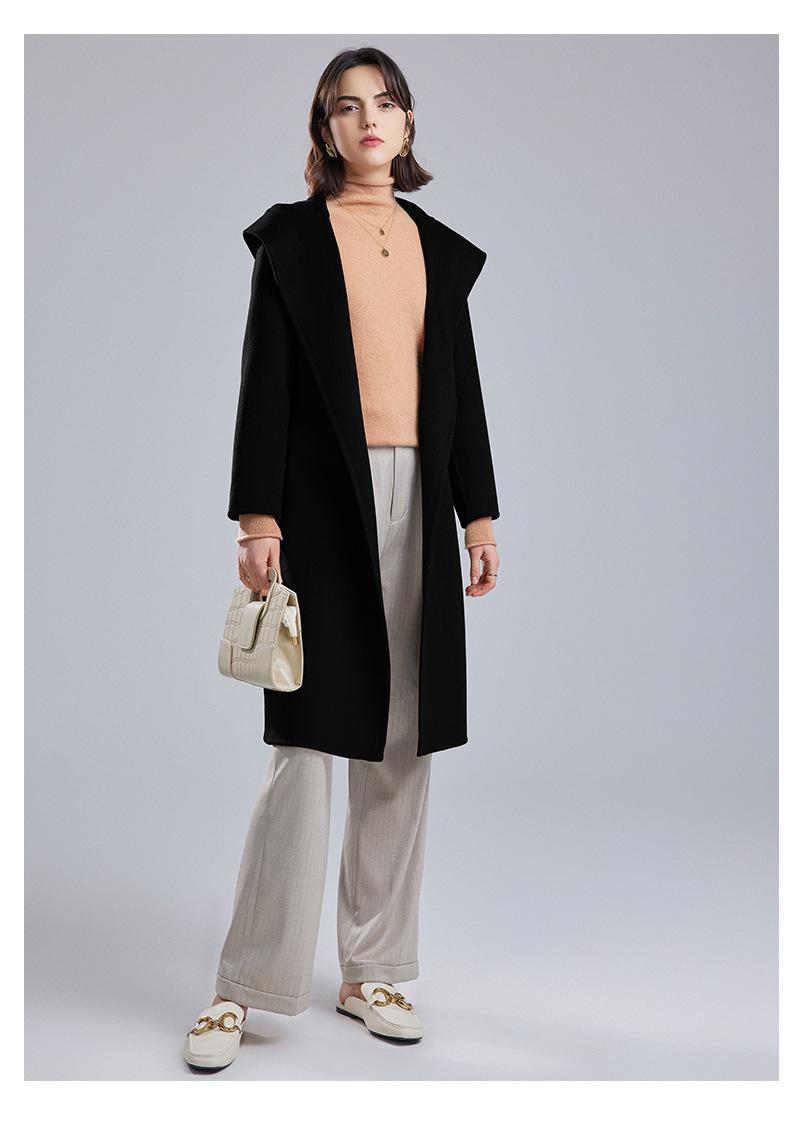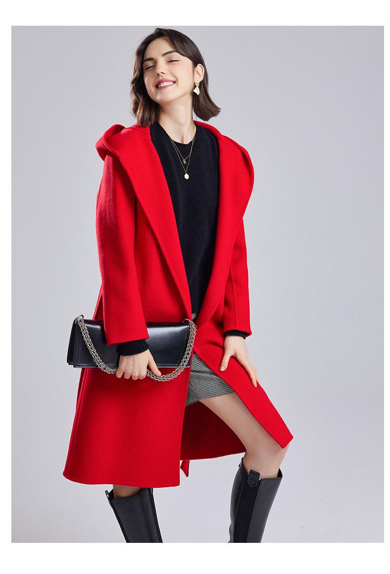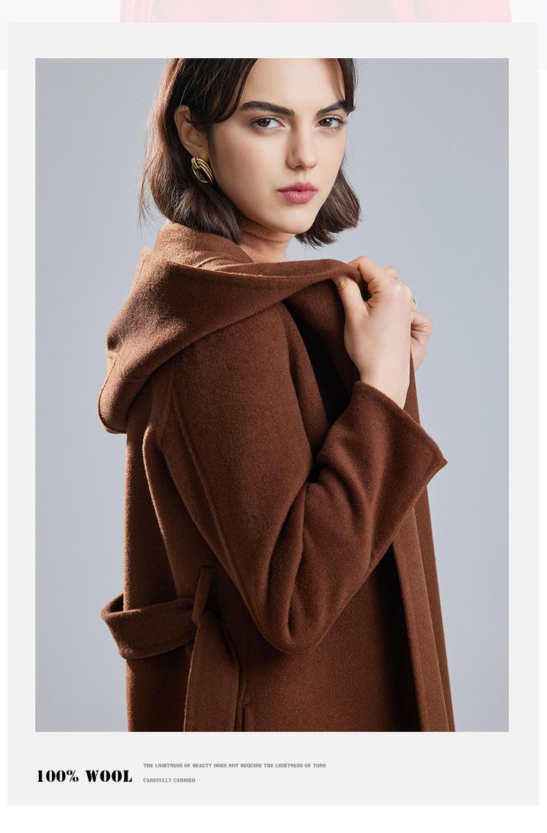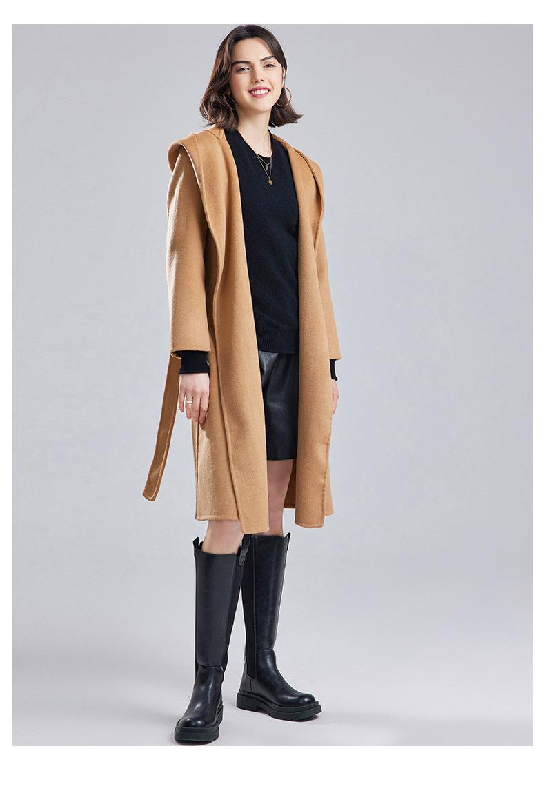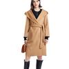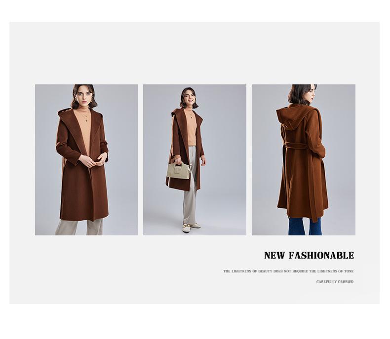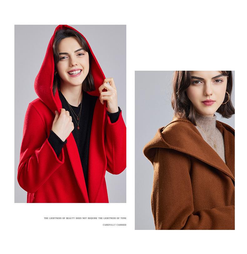 Otoño e Invierno nuevo abrigo de lana de doble cara para mujer estilo coreano color sólido con cordones gabardina con capucha largo medio abrigo de lana sin cachemira