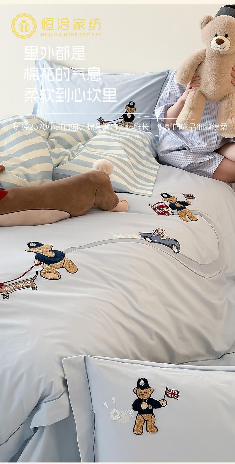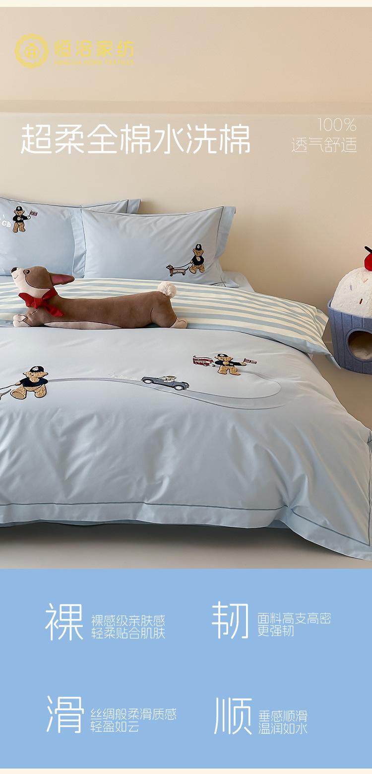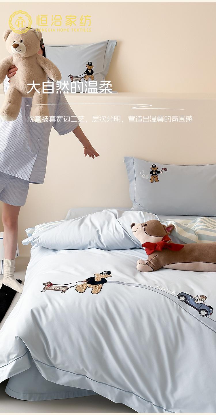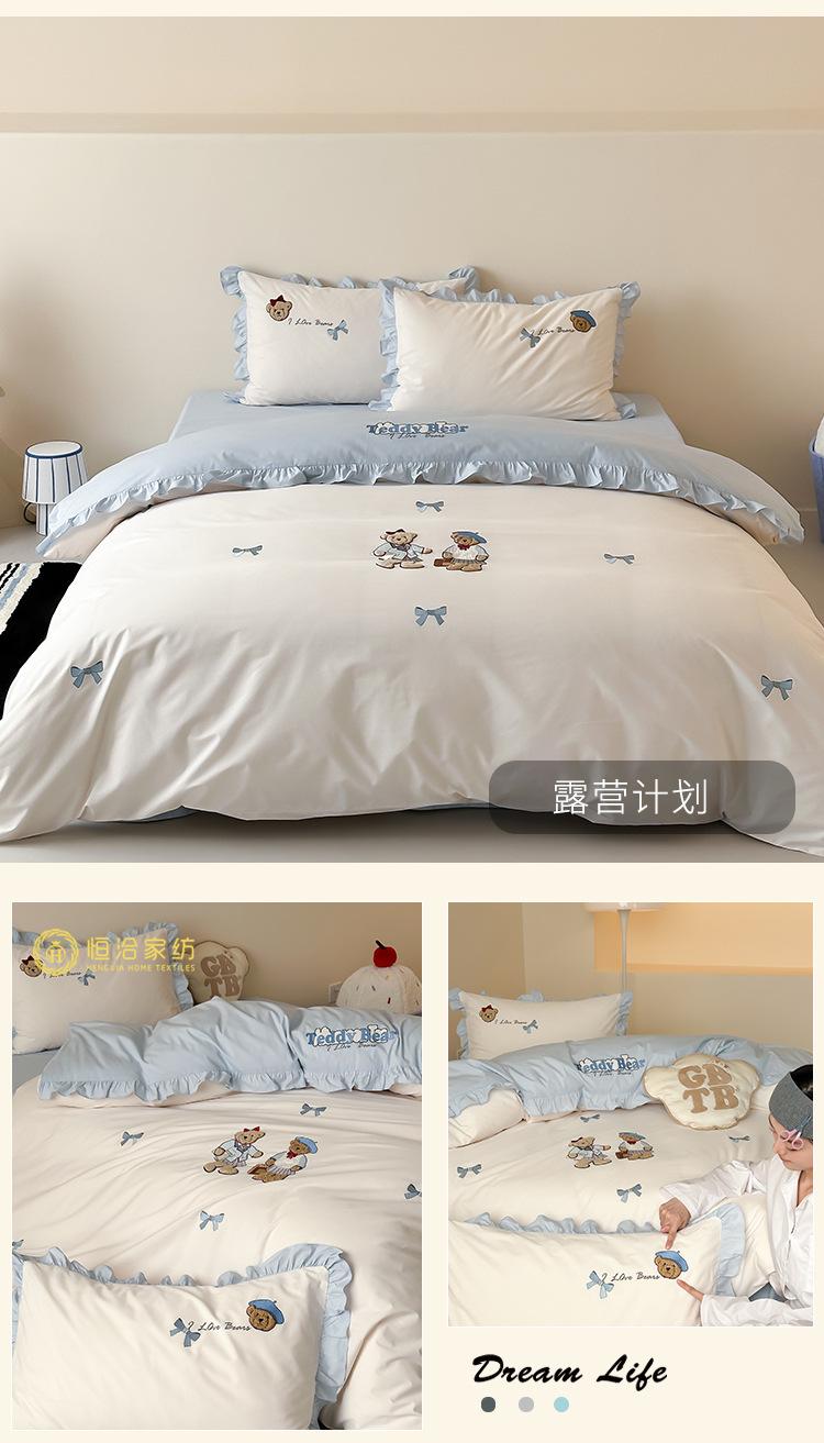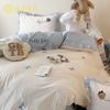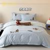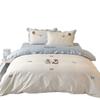 Estilo Caricatura Algodón Súper Suave Algodón Lavado Juego de Cuatro Piezas Parche de Oso Lindo Bordado Algodón Puro 1.2m Funda de Edredón Ropa de Cama Azul
