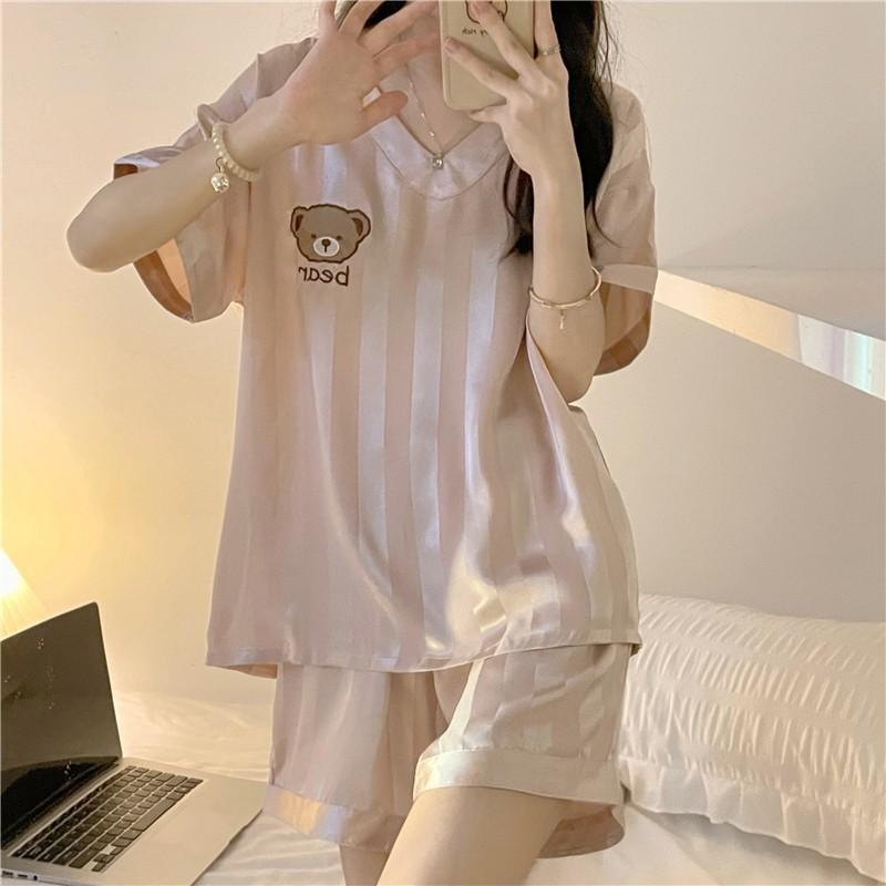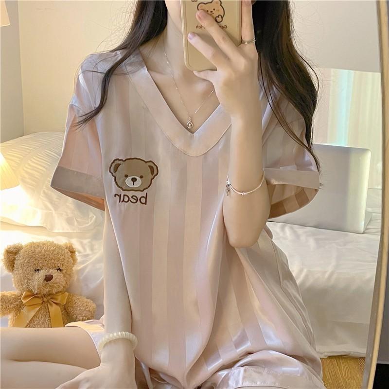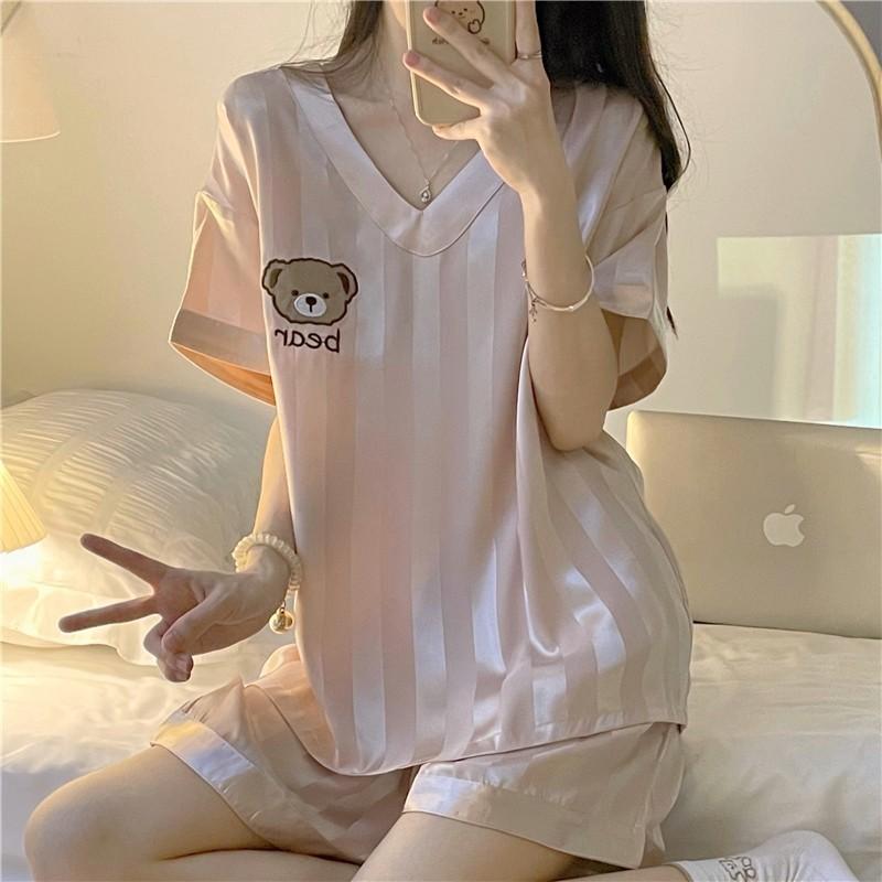 Pijama Nuevo para Mujer Verano Seda de Hielo Manga Corta Ins Dulce y Lindo Oso Seda Se Puede Usar Afuera Cuello en V Conjunto de Ropa para el Hogar