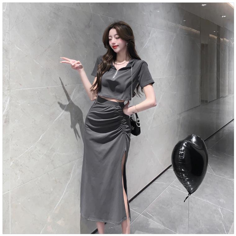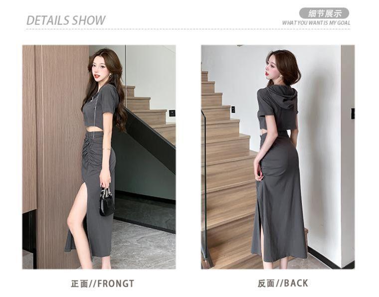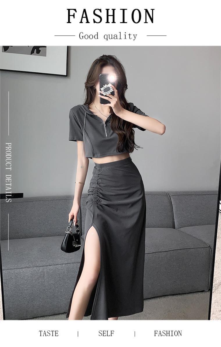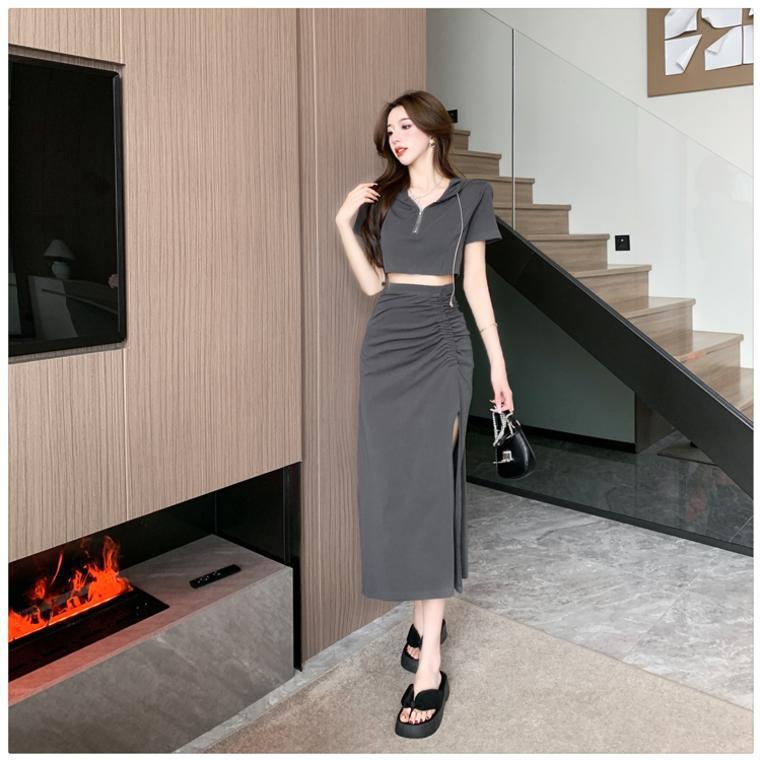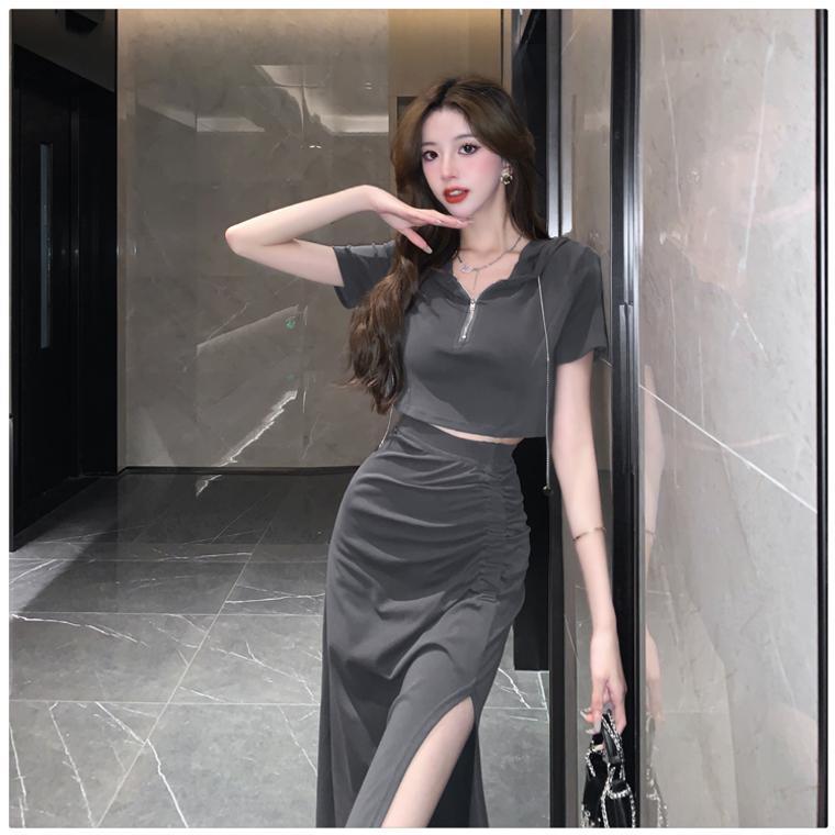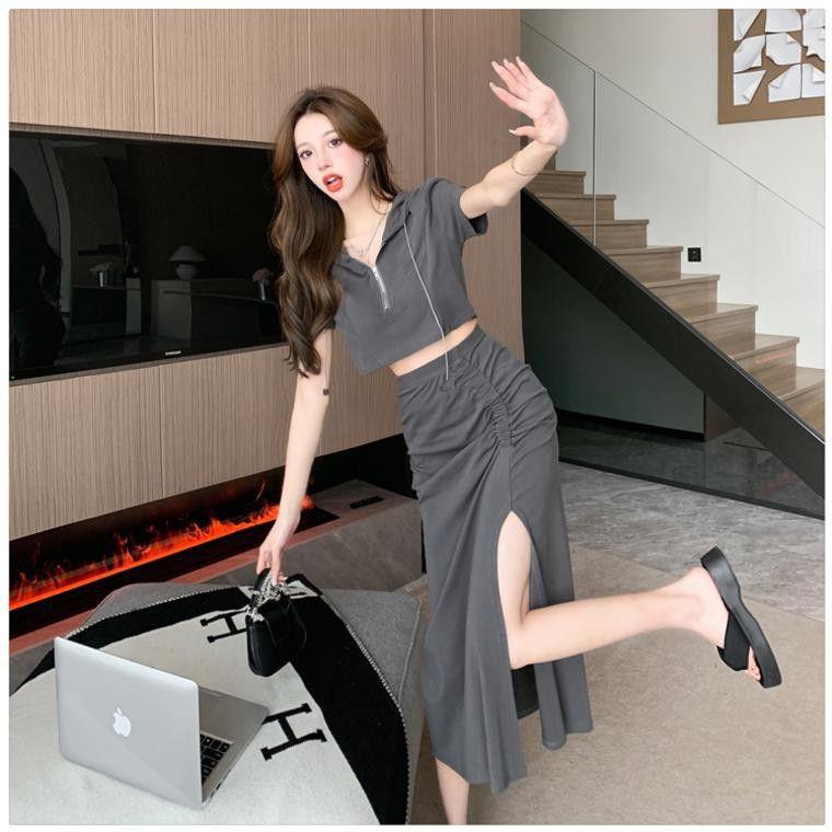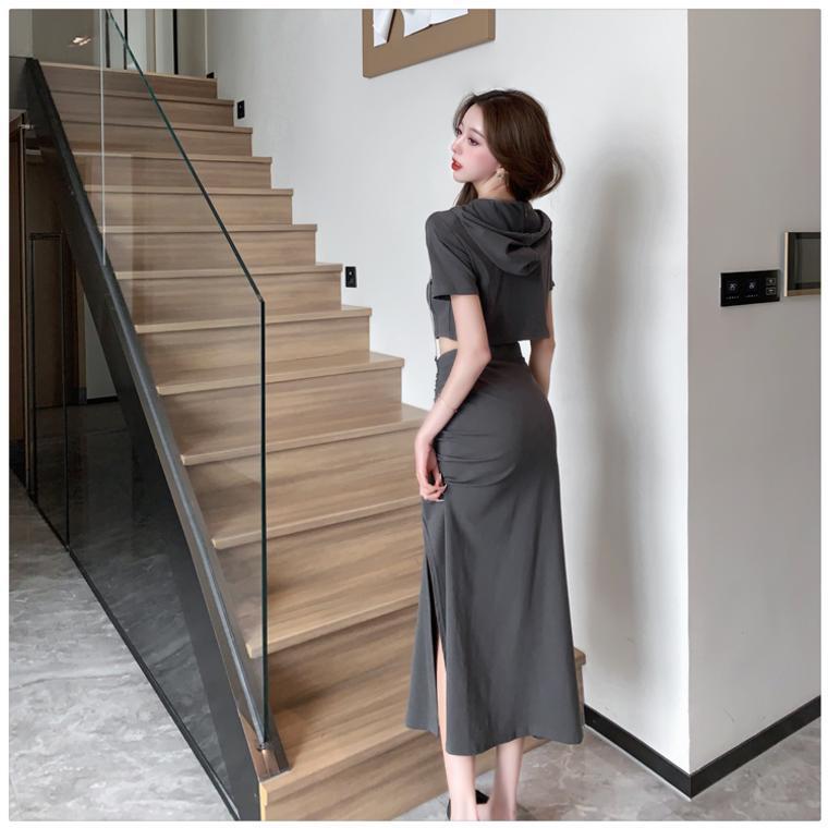 Nuevo Traje de Verano para Mujer Dulce Francés Hottie Deseo Puro con Capucha Manga Corta Celebridad de Internet Falda con Abertura Conjunto de Dos Piezas a la Moda