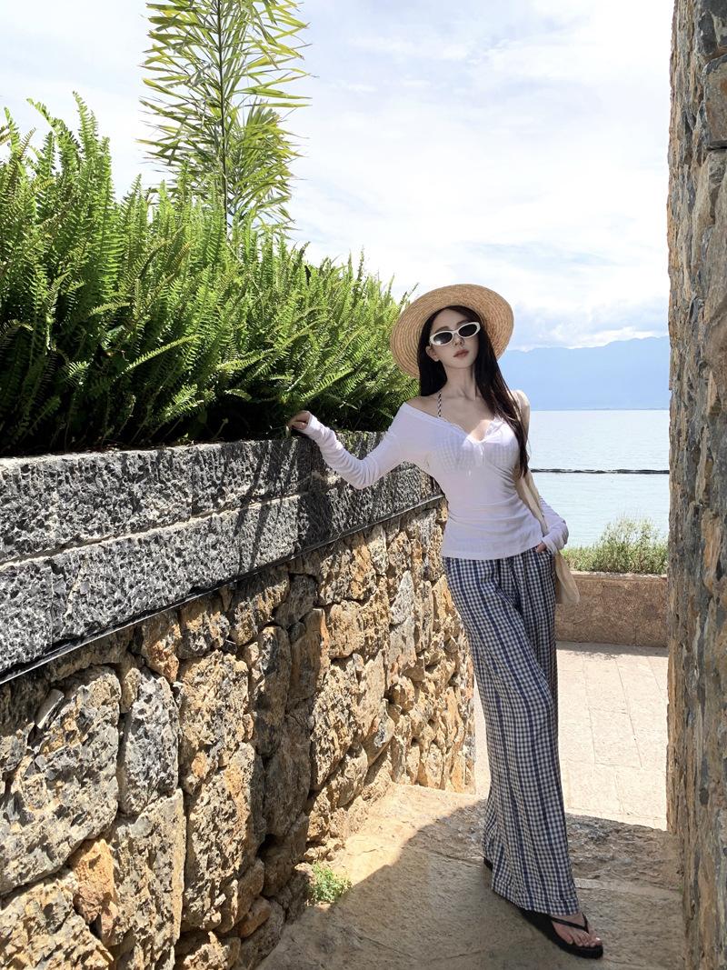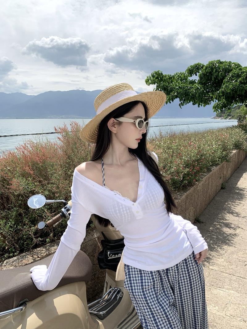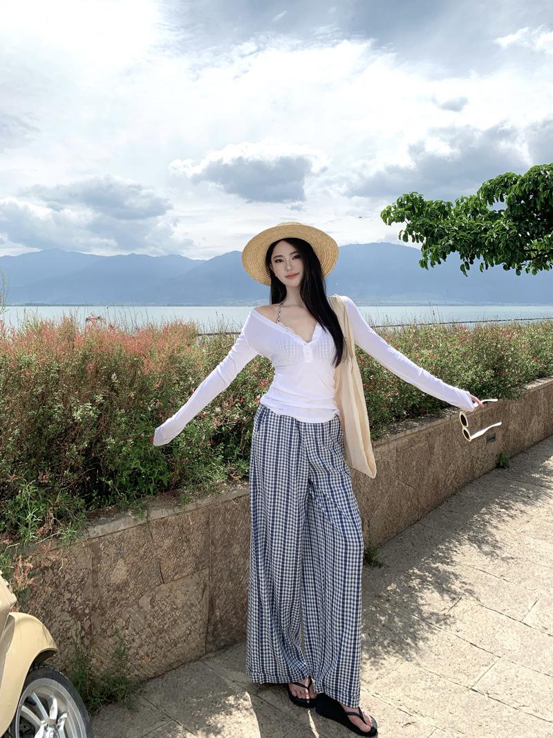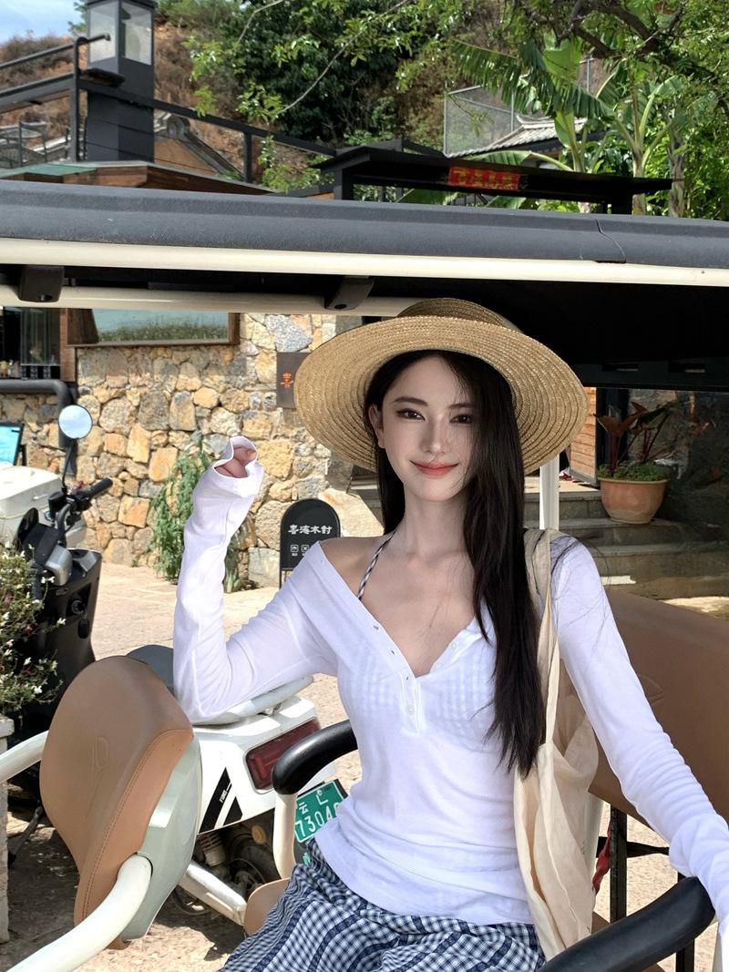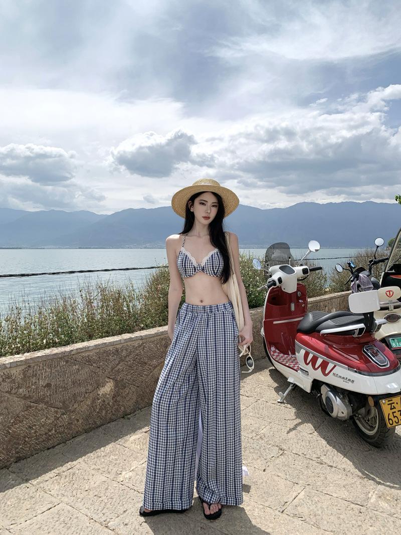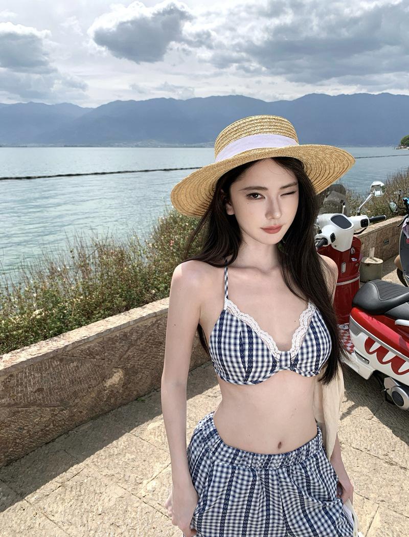 En Stock Foto Real Dulce y Picante Puro Deseo Estilo Milenial Cubre Manga Larga con Capa Interior a Cuadros Bikini para Vacaciones en la Playa