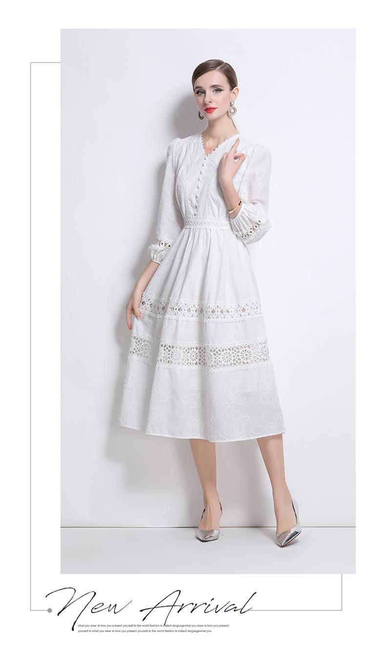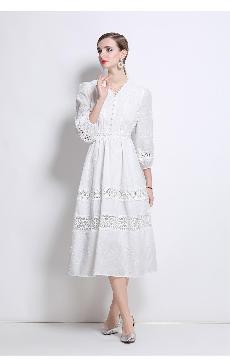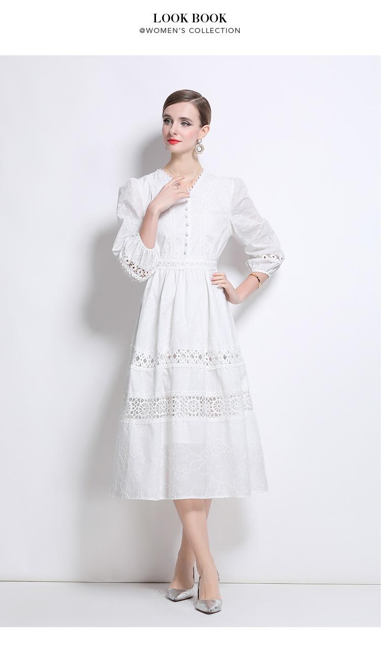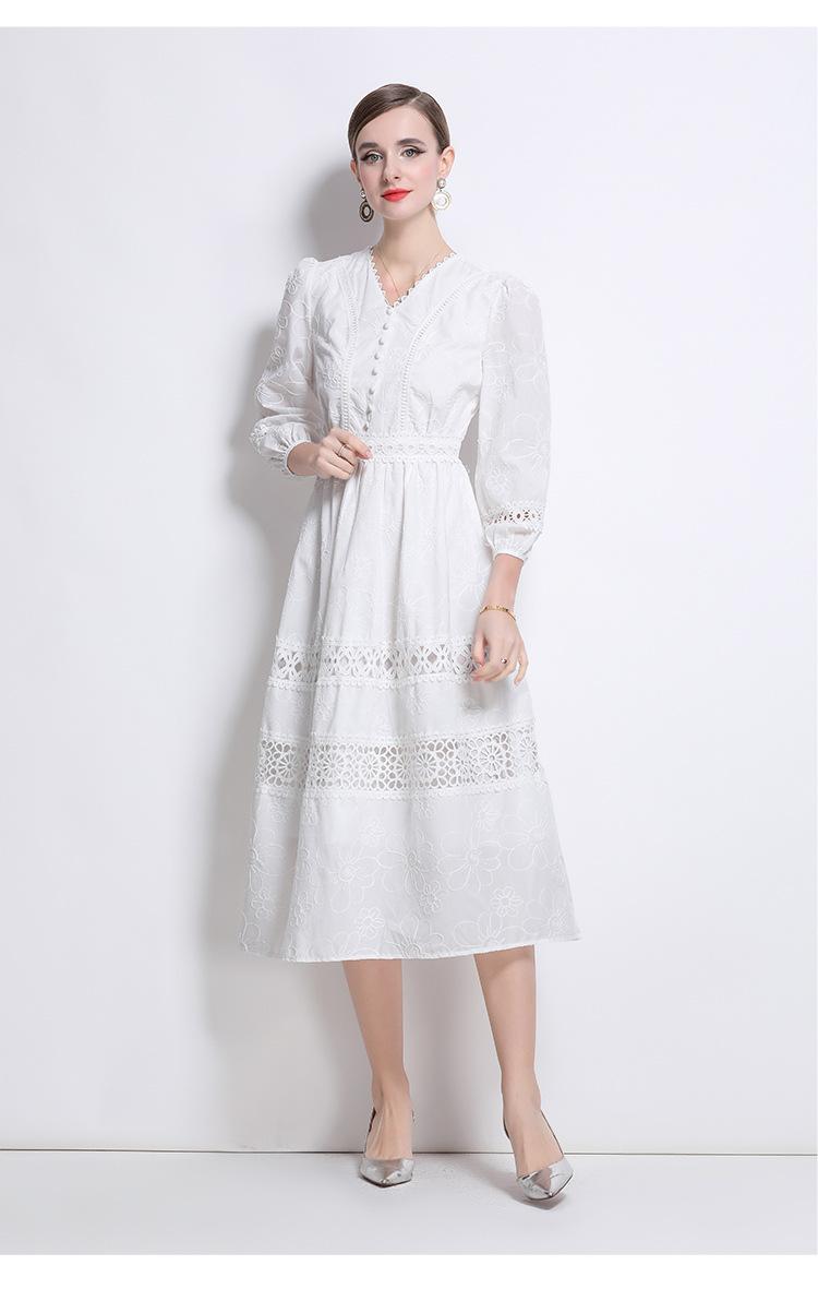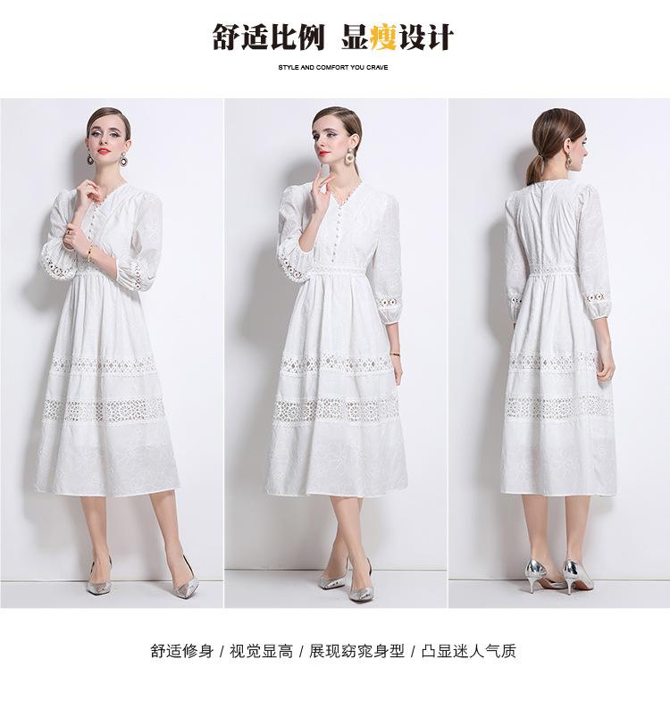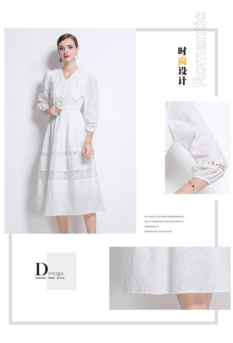 Vestido Blanco de Encaje Bordado con Cuello en V y Manga Larga 2025 Nuevo Estilo de Verano Look Adelgazante de Cintura Falda de Hada