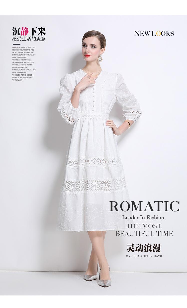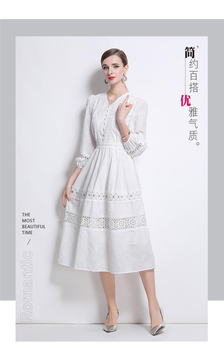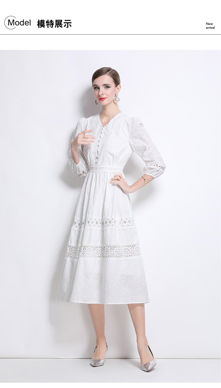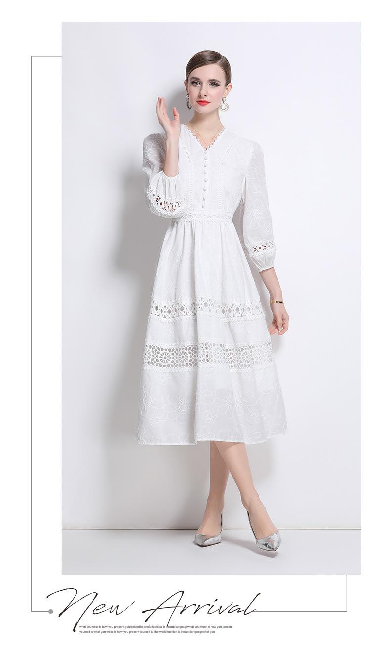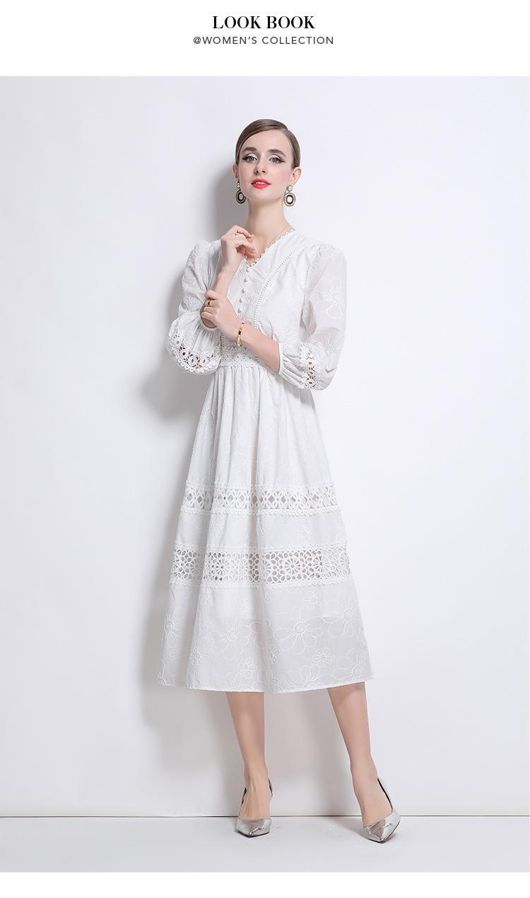 Vestido Blanco de Encaje Bordado con Cuello en V y Manga Larga 2025 Nuevo Estilo de Verano Look Adelgazante de Cintura Falda de Hada