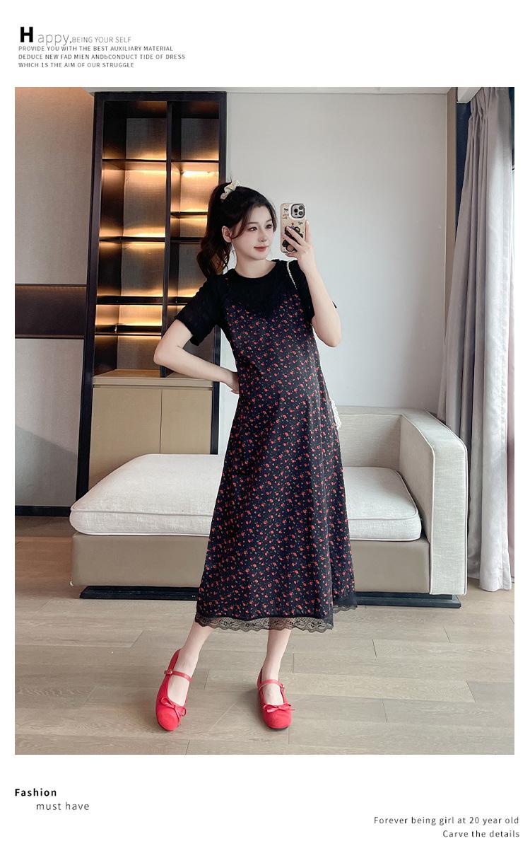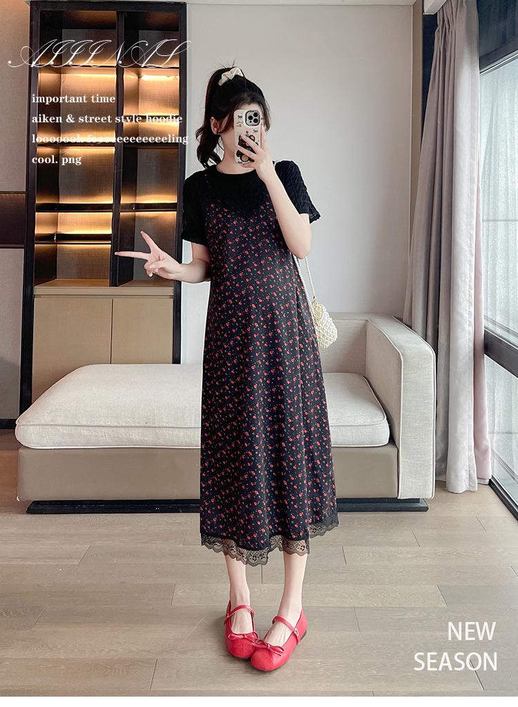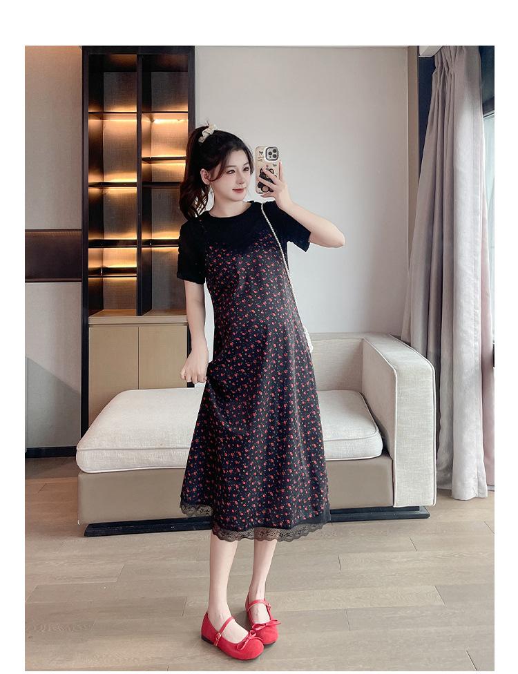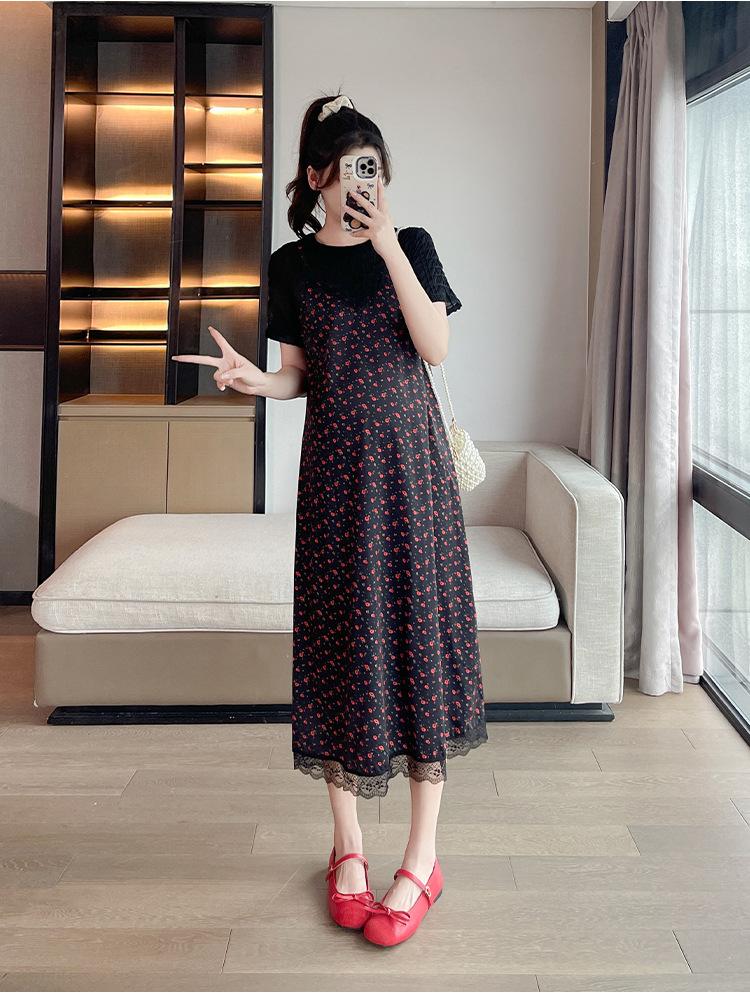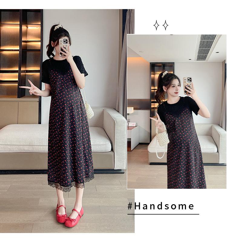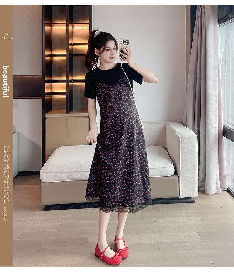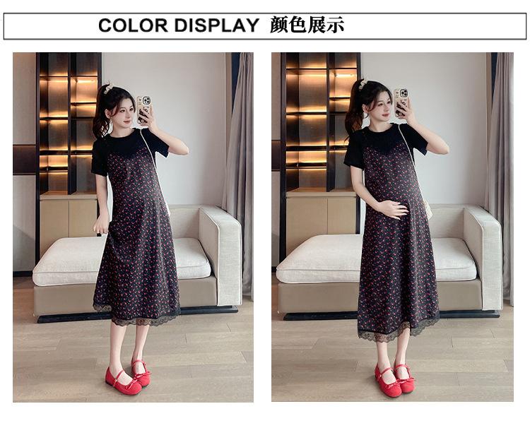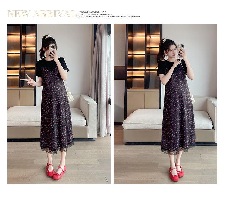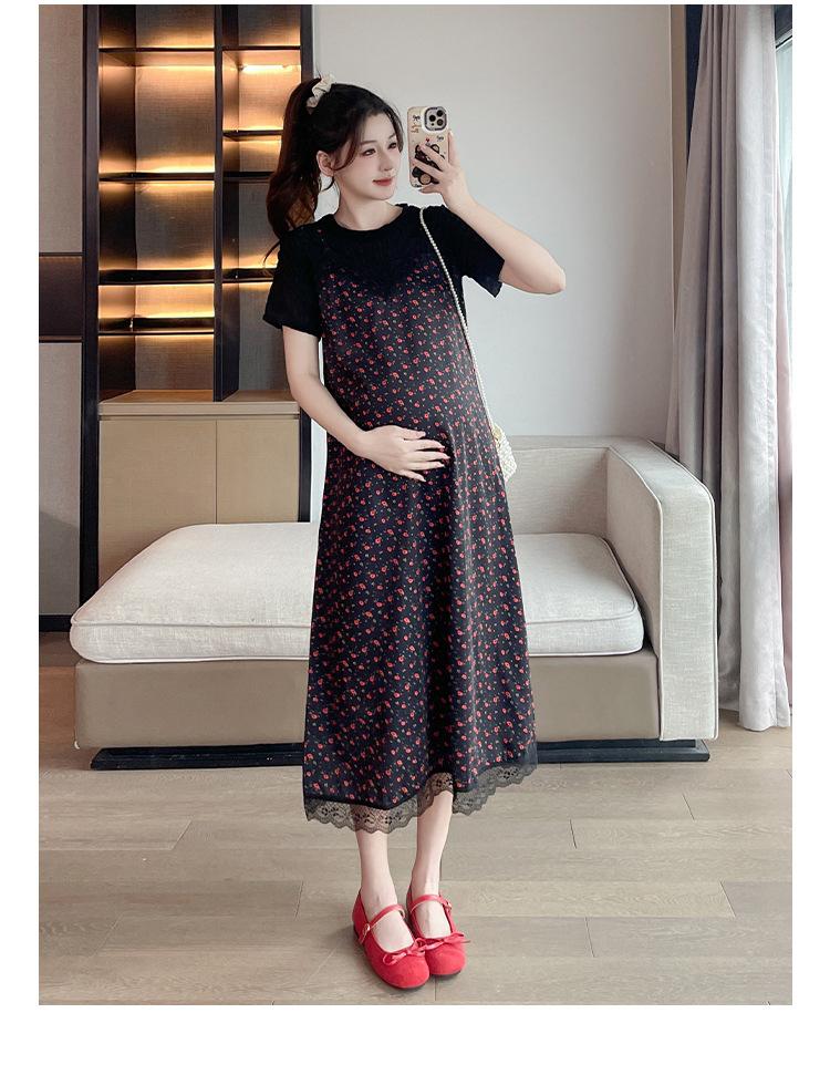 Ropa de Maternidad 2025 Verano Nuevo Estilo Dulce Francés Look Adelgazante Encaje Floral Falso Vestido de Maternidad de Dos Piezas