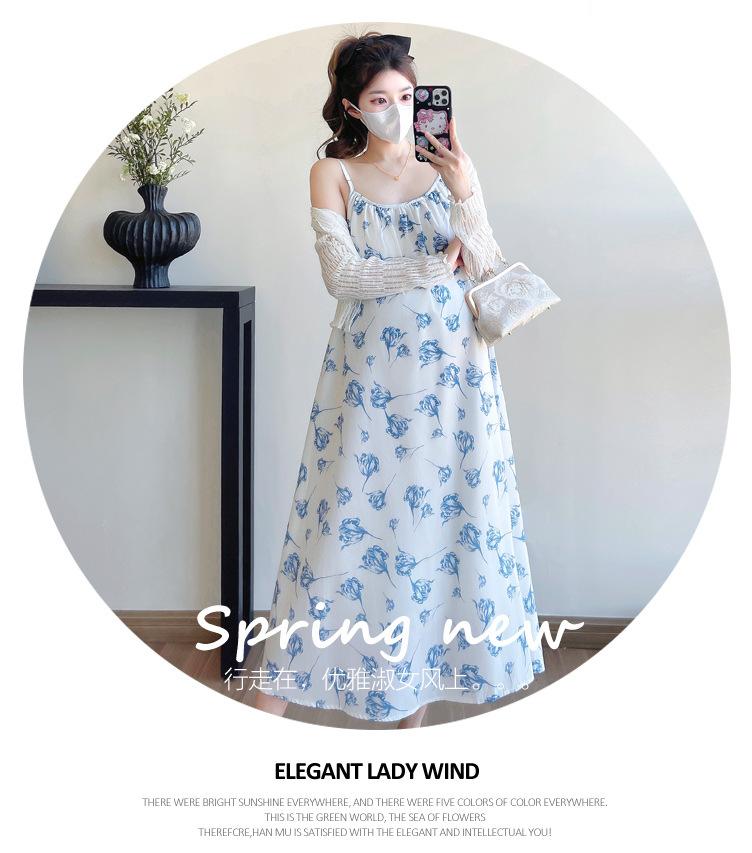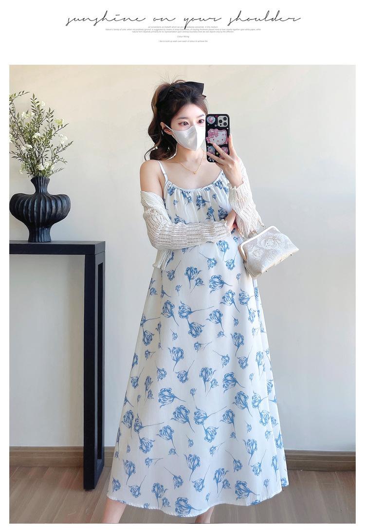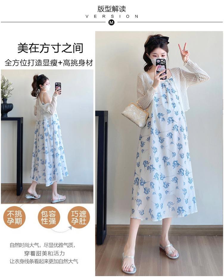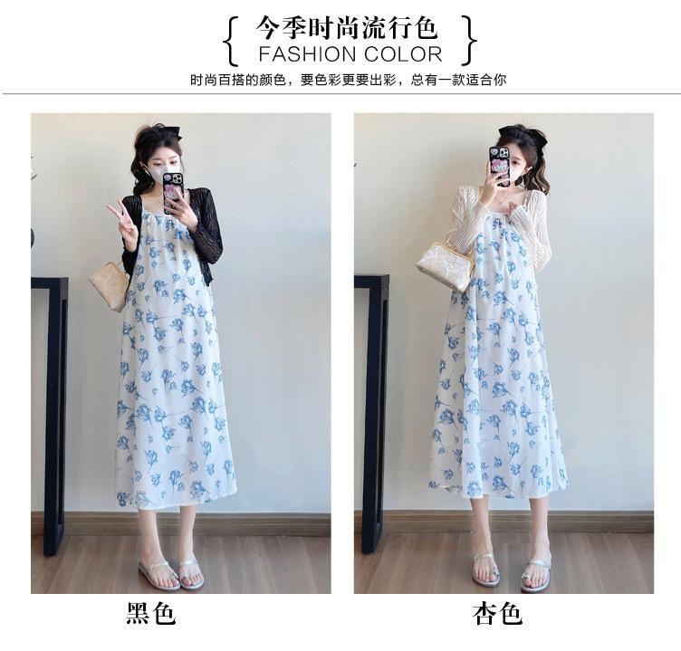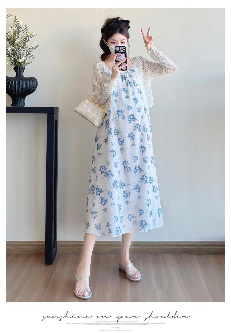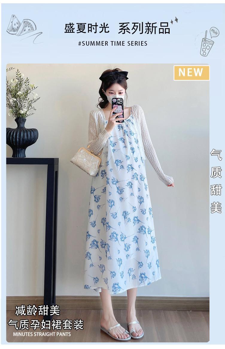 Ropa de Maternidad 2025 Verano Nuevo Estilo Francés Retro Floral Elegante Falda Larga + Cárdigan Vestido de Maternidad de Dos Piezas