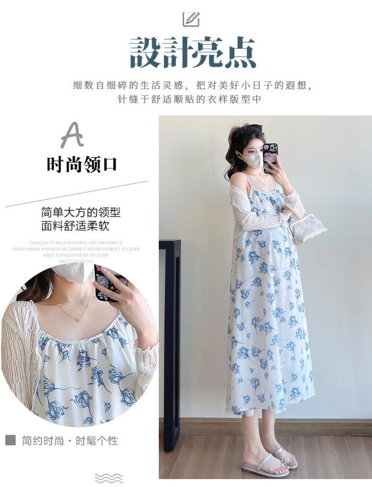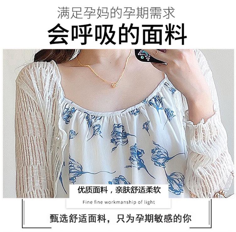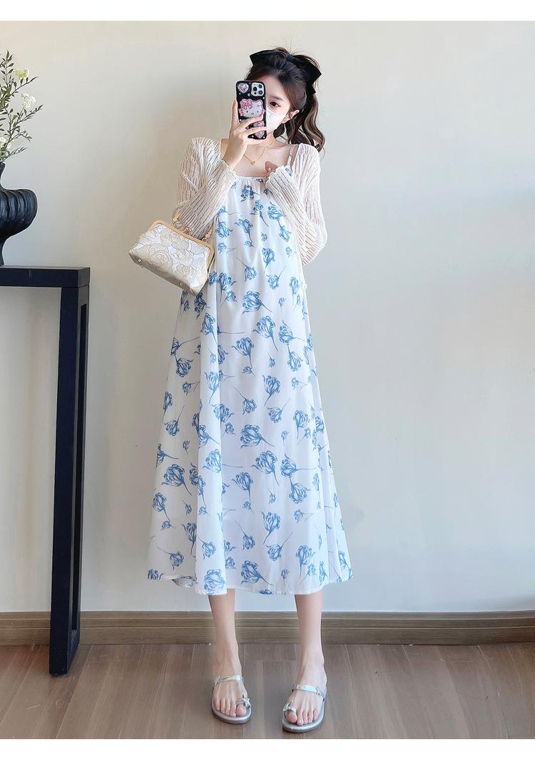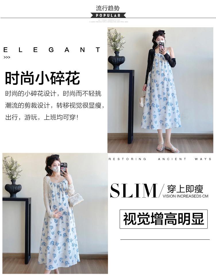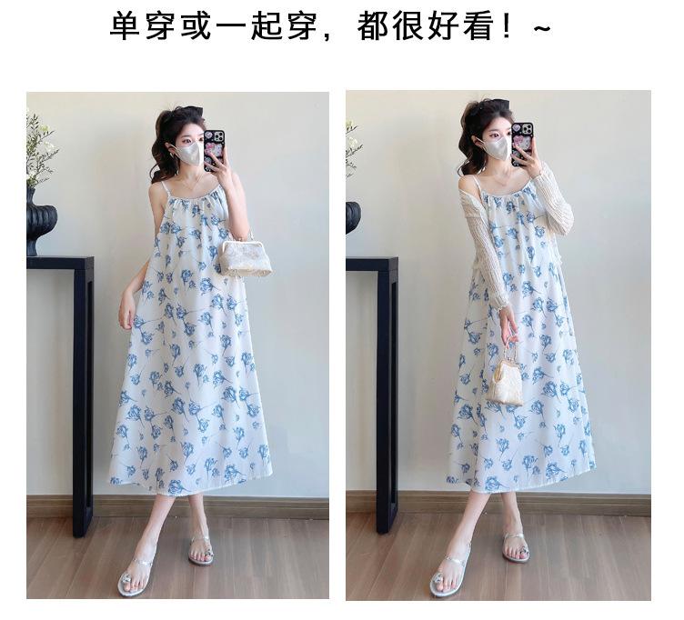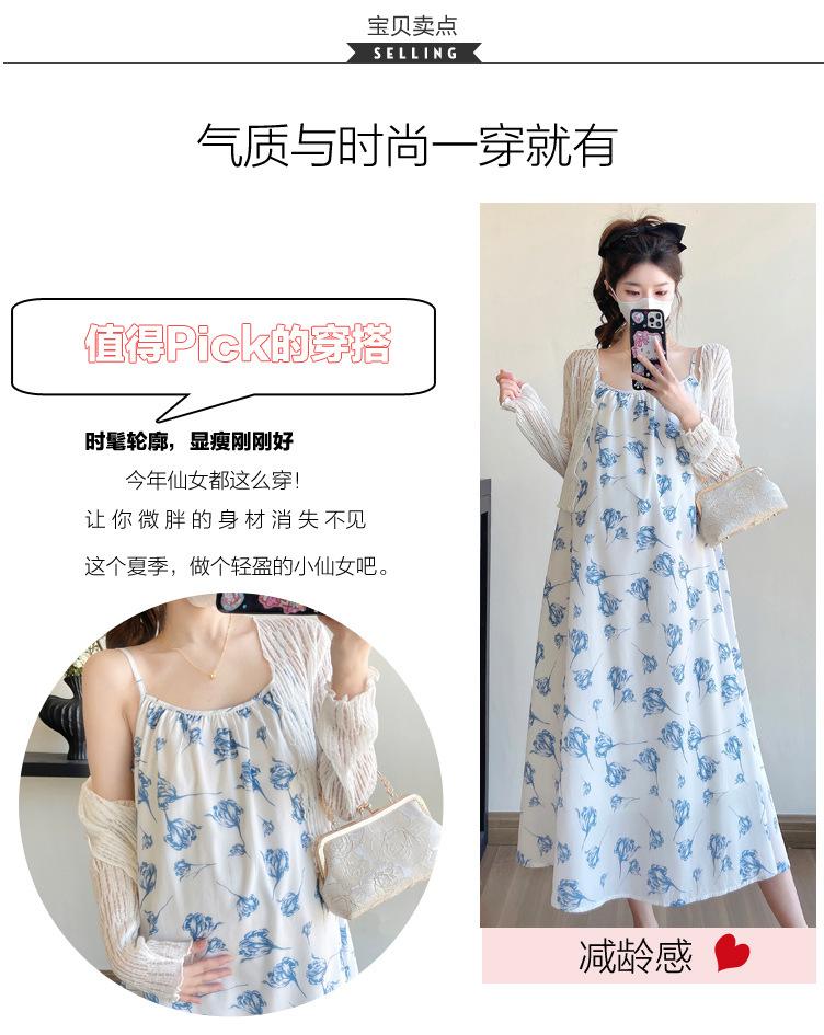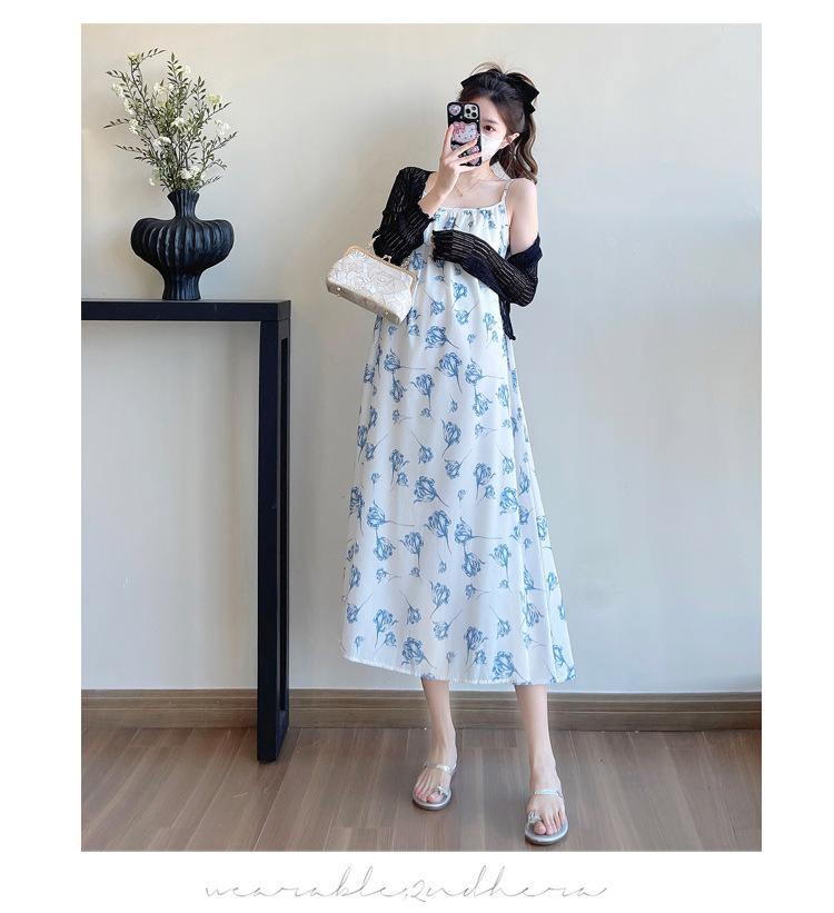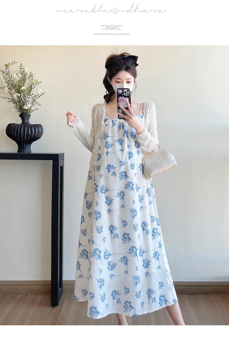 Ropa de Maternidad 2025 Verano Nuevo Estilo Francés Retro Floral Elegante Falda Larga + Cárdigan Vestido de Maternidad de Dos Piezas