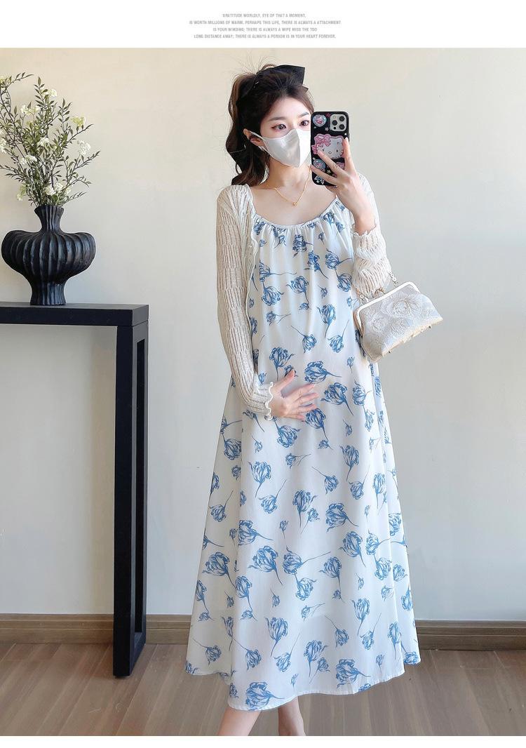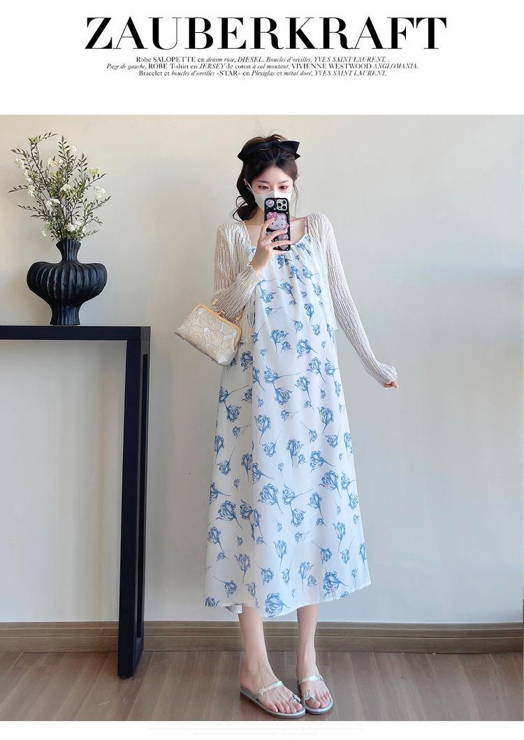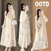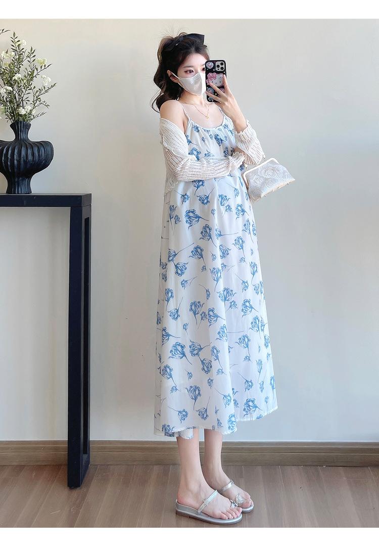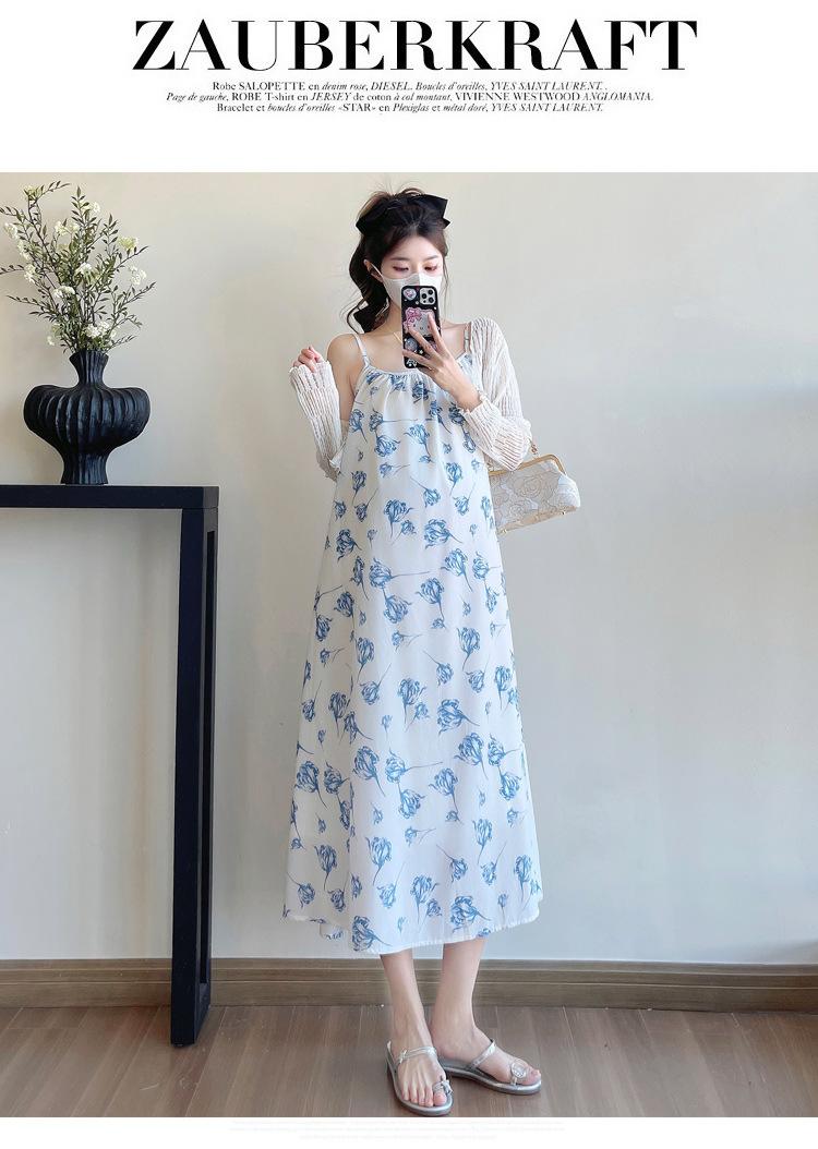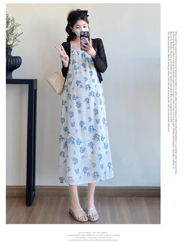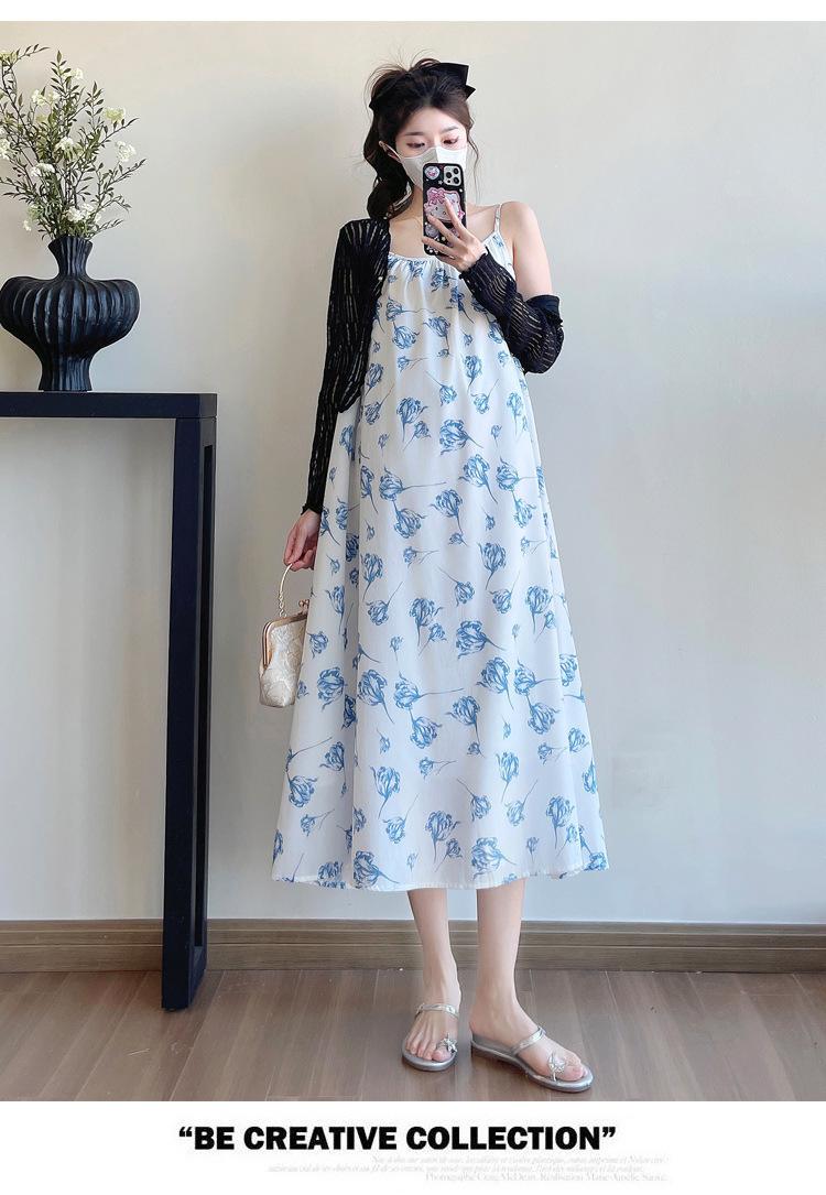Ropa de Maternidad 2025 Verano Nuevo Estilo Francés Retro Floral Elegante Falda Larga + Cárdigan Vestido de Maternidad de Dos Piezas