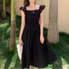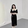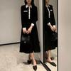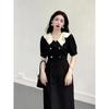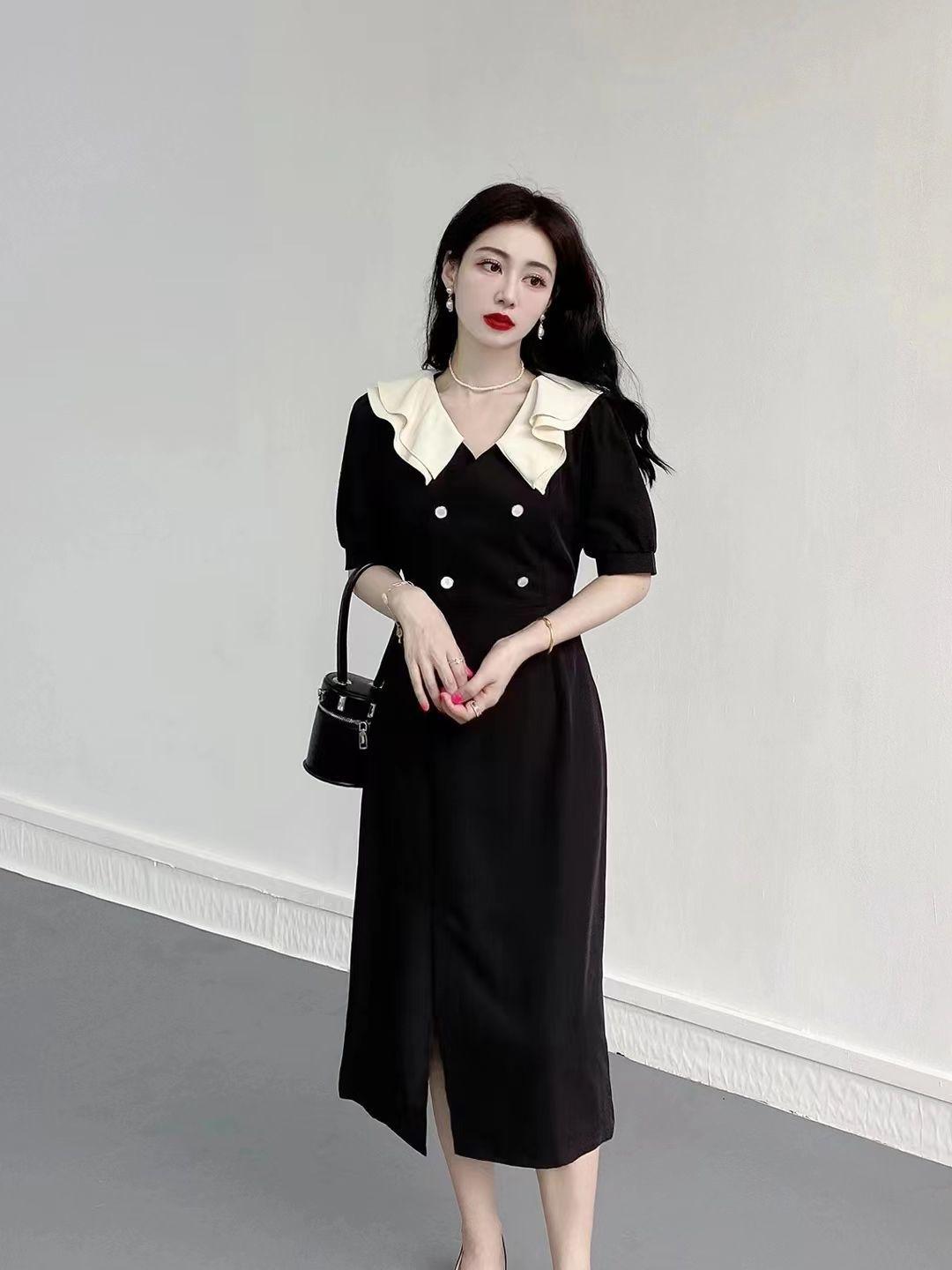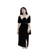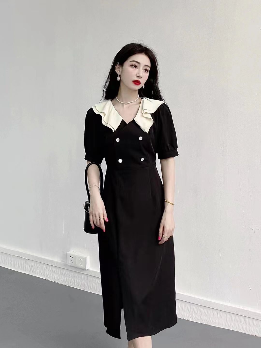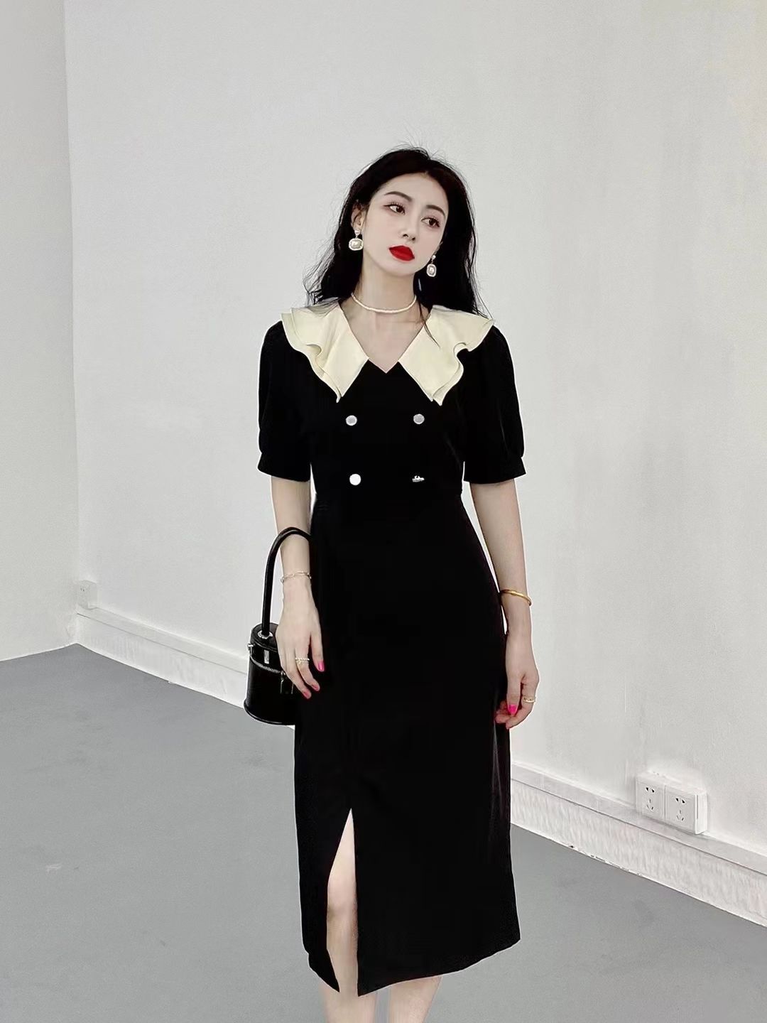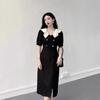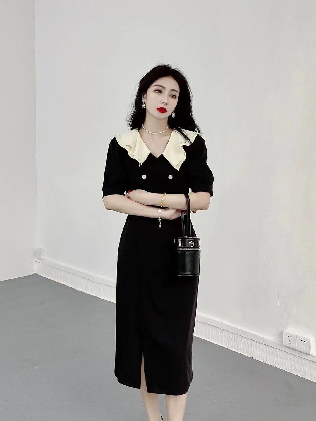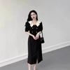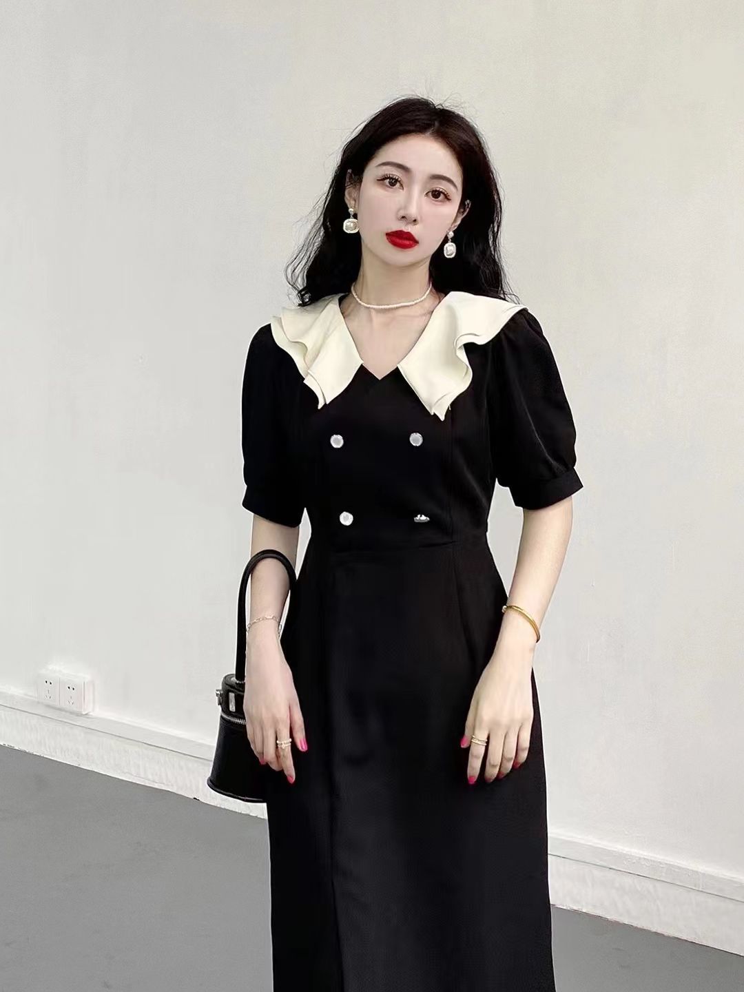 Falda Larga Estilo Francés Cubre Carne Cubre Vientre Corte Ajustado Cintura Ceñida Estilo Hepburn Vestido Negro Vestido de Contraste para Mujer