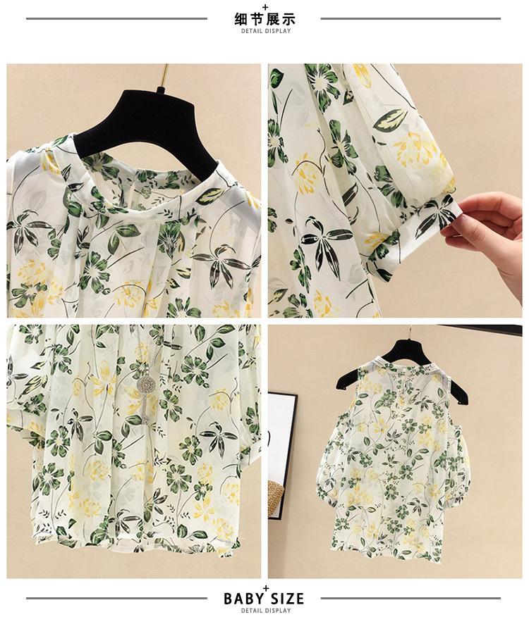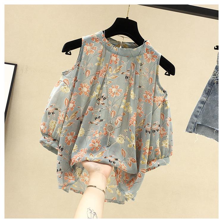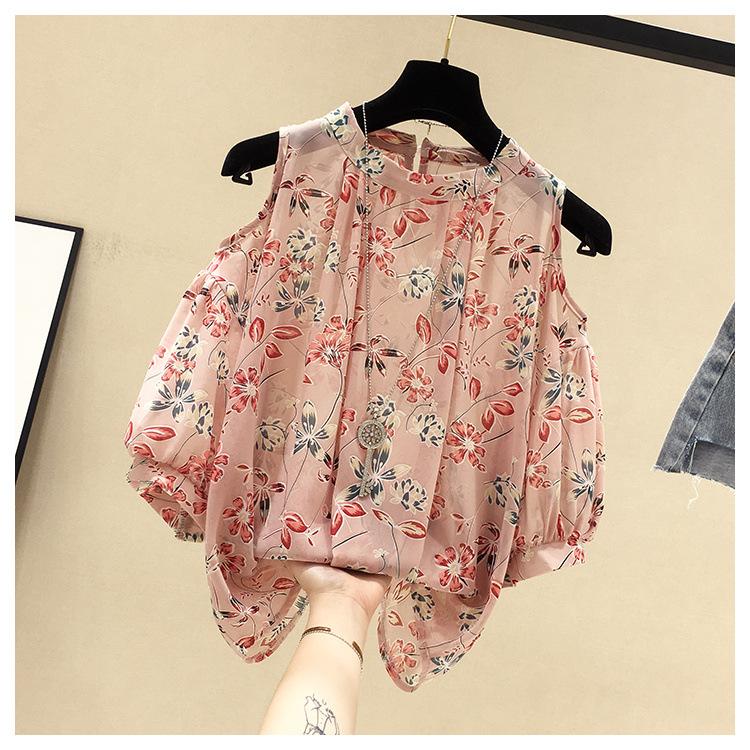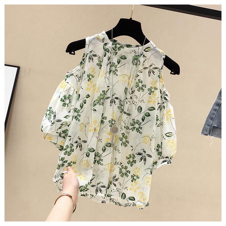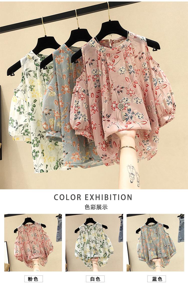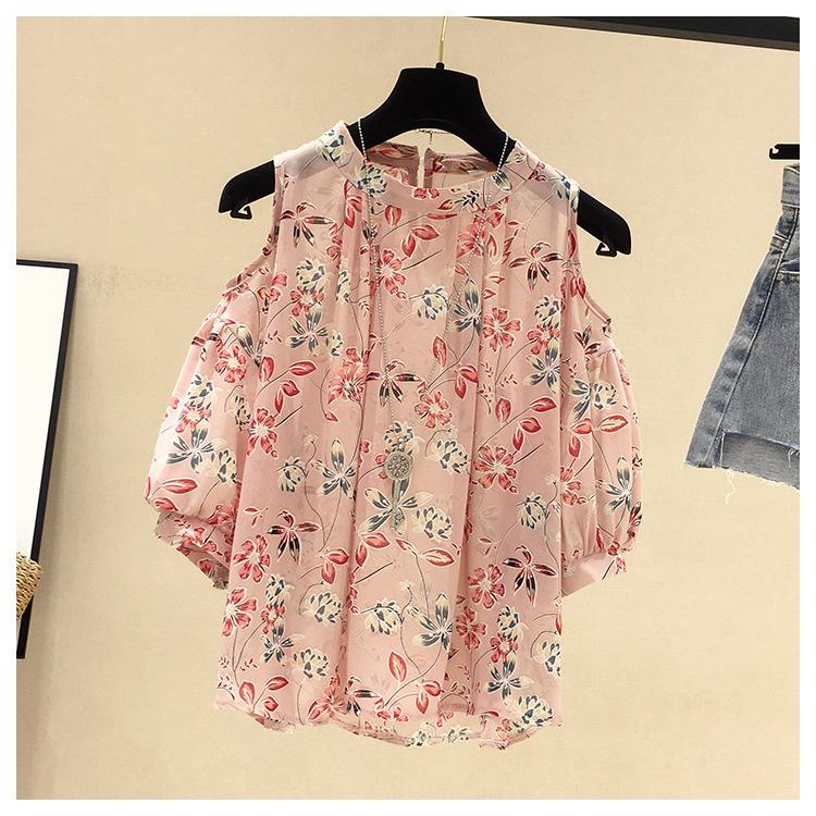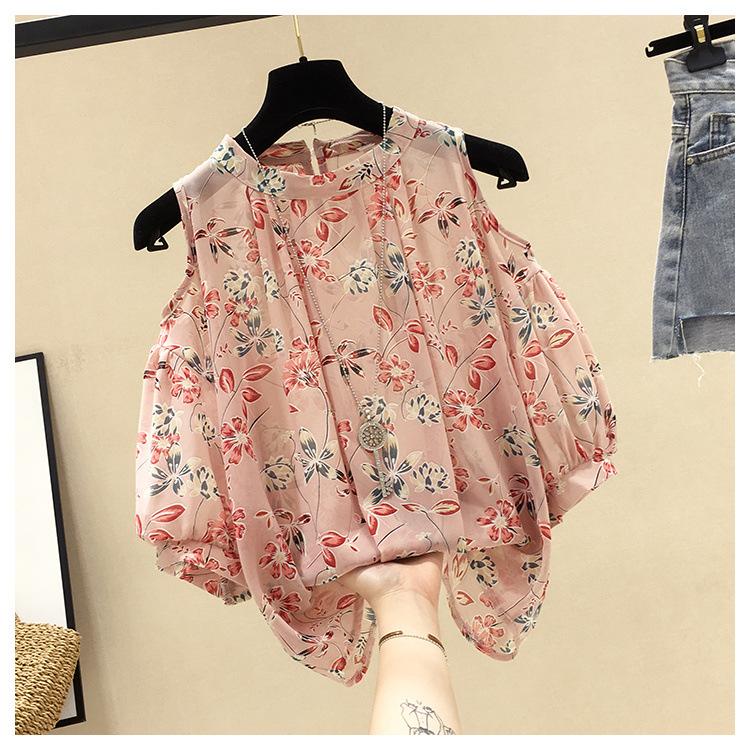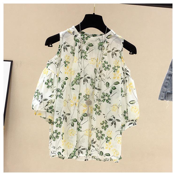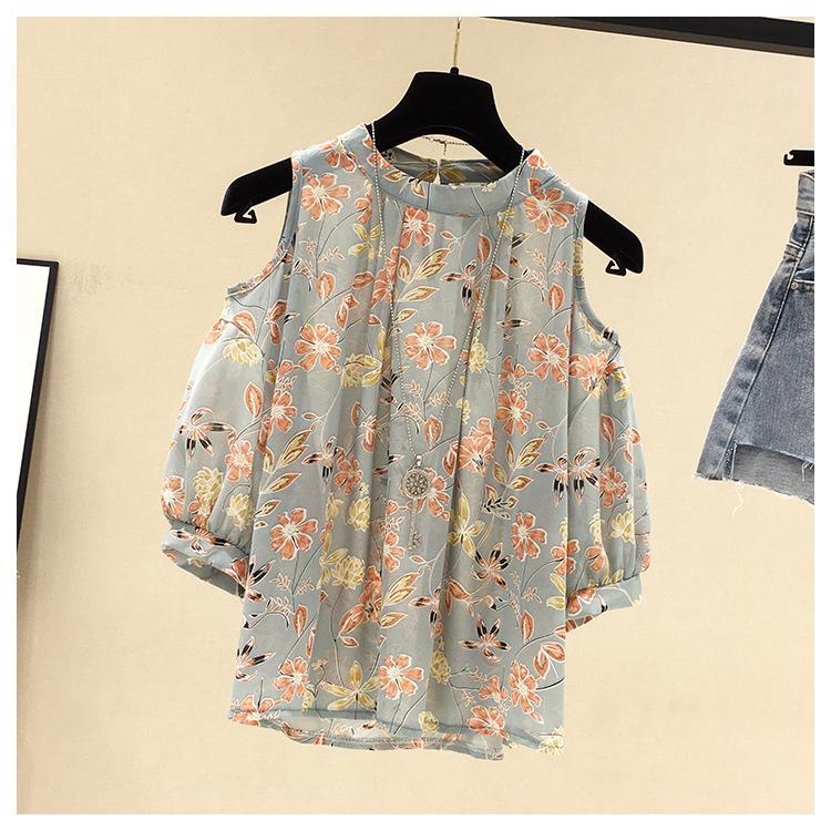 Camisa de Chifón de Verano de Manga Corta para Mujeres de Talla Grande, Top Floral con Hombros Descubiertos, Camisa de Moda Adelgazante que Cubre el Vientre