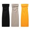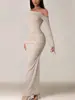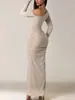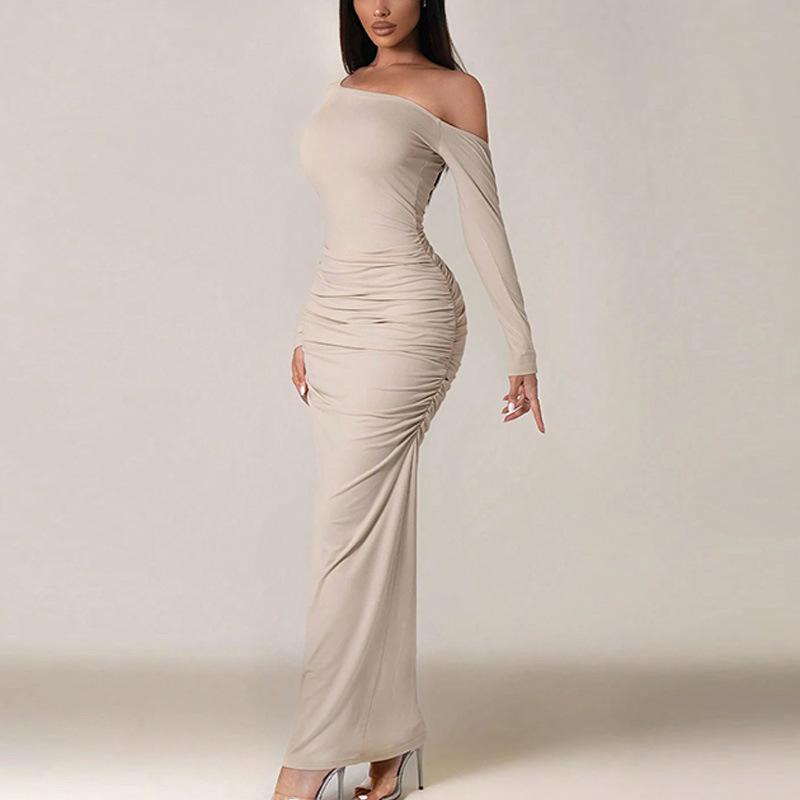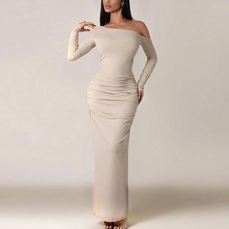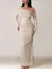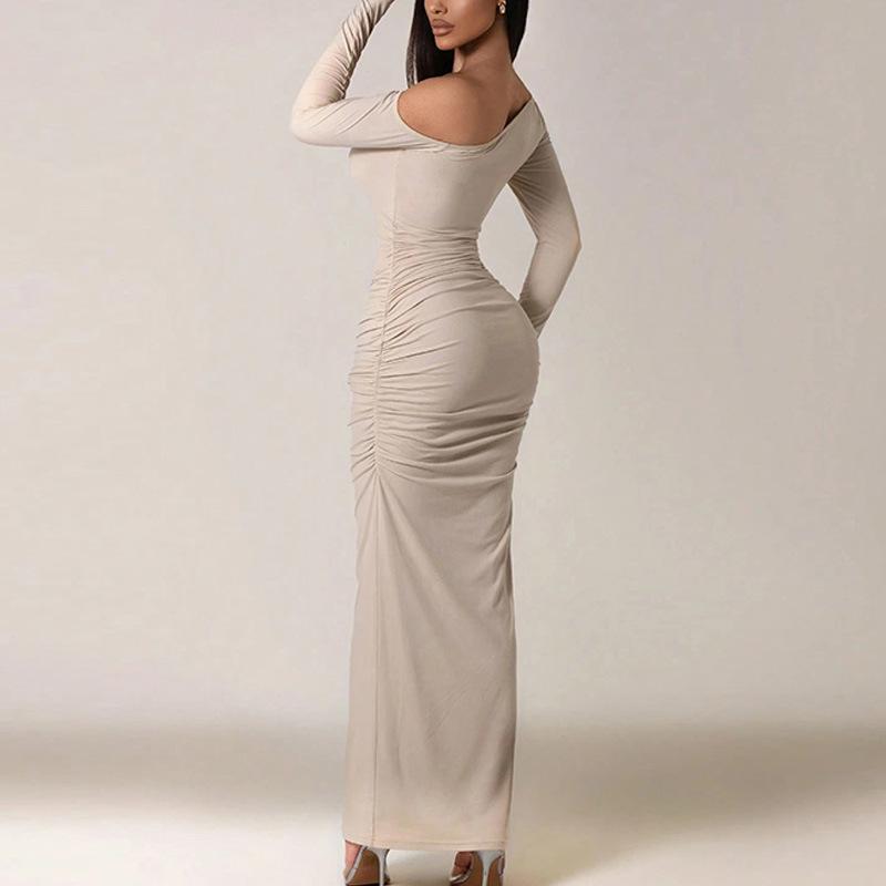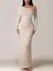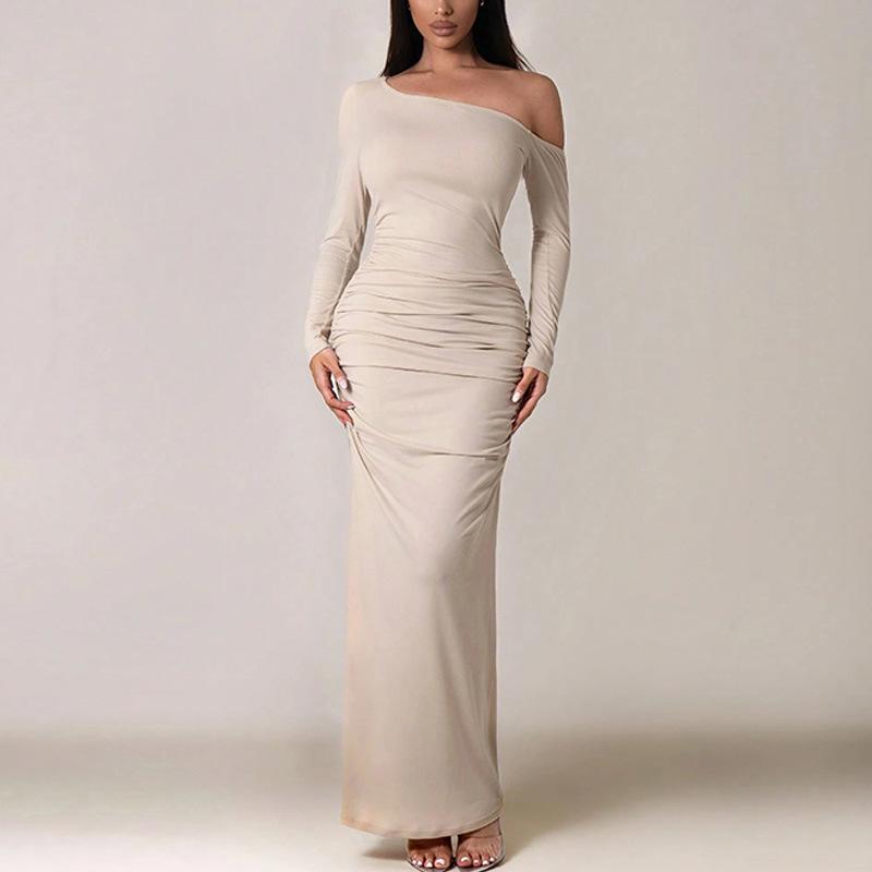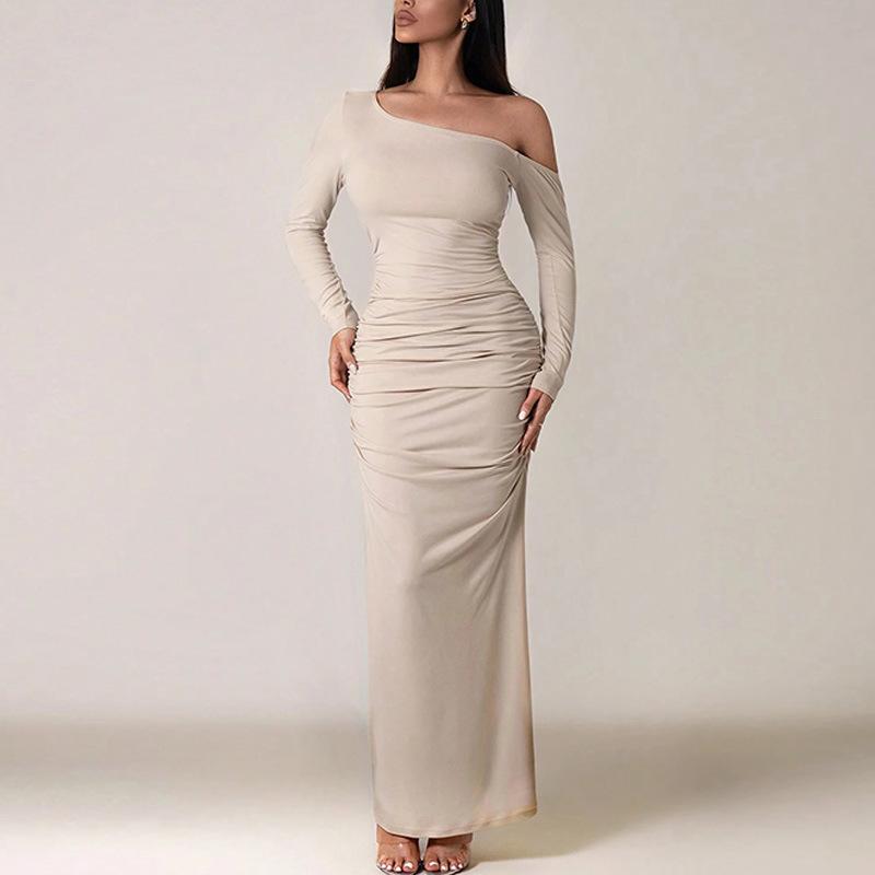 2025 Otoño Europeo y Americano Nueva Moda Sexy Slim Casual Casual Plisado Color Sólido Cuello Barco Manga Larga Vestido Mujer