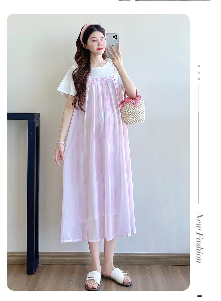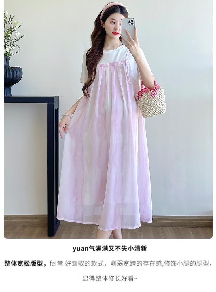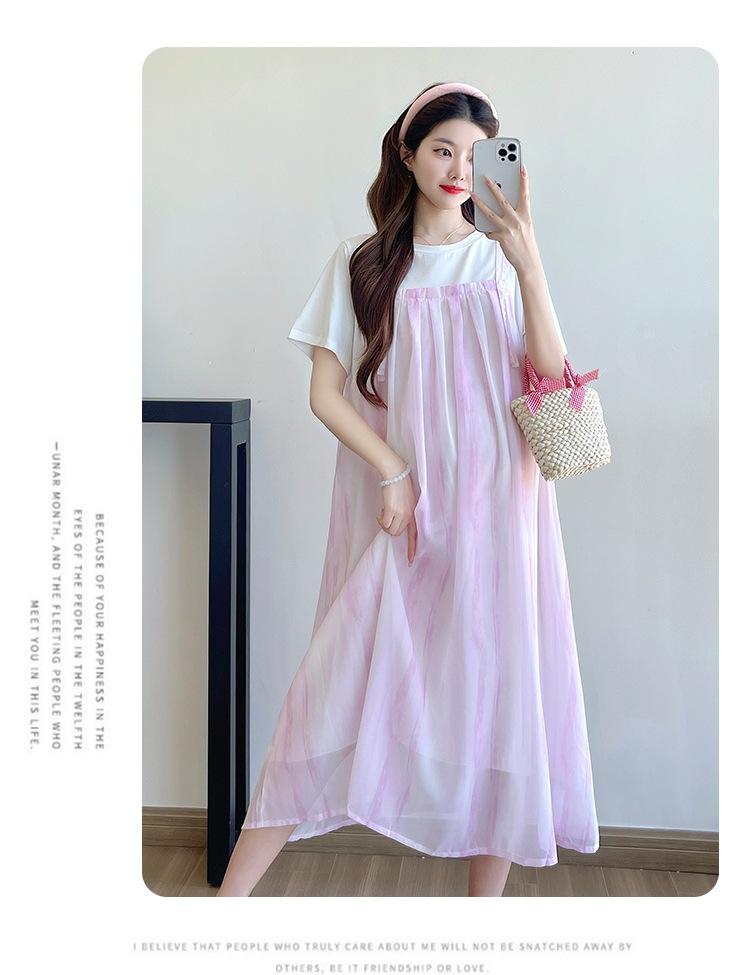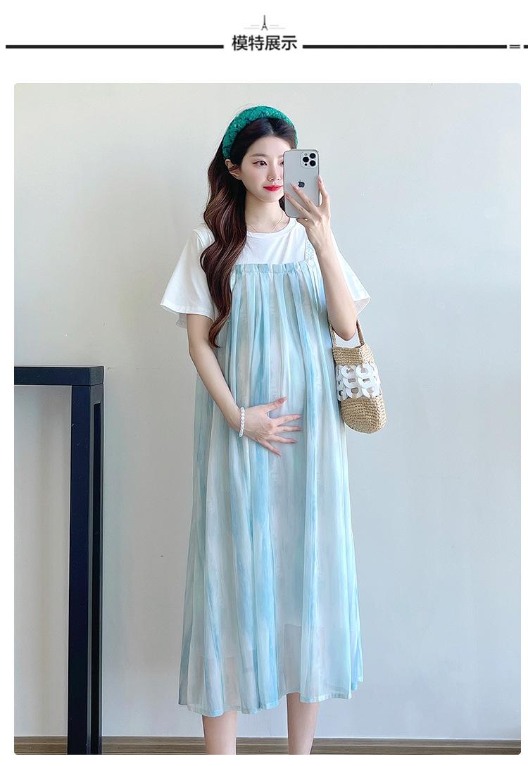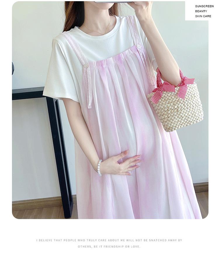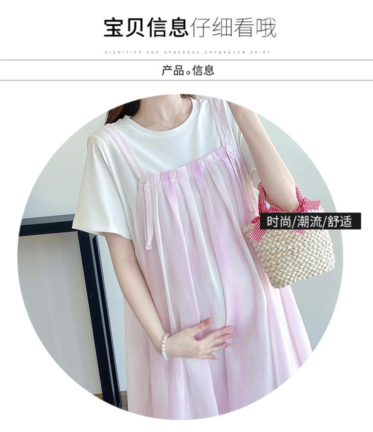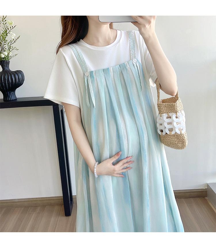 Vestido de maternidad de verano 2025, nueva moda, camiseta suelta de dos piezas falsa, falda larga, falda de maternidad de verano.