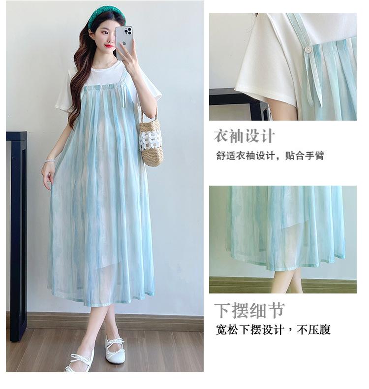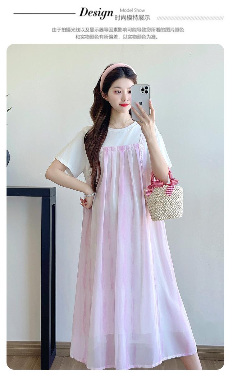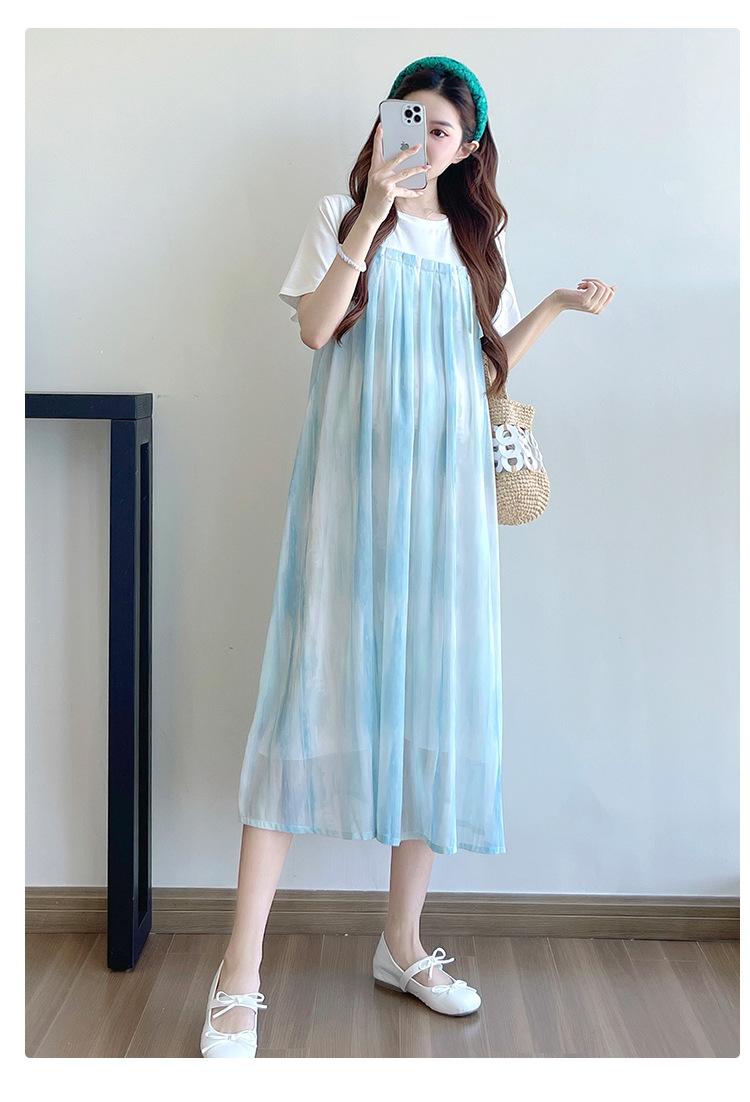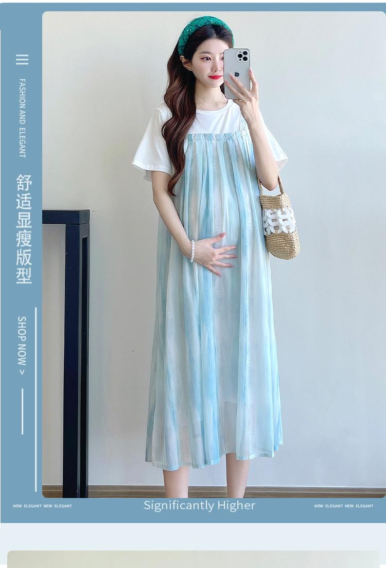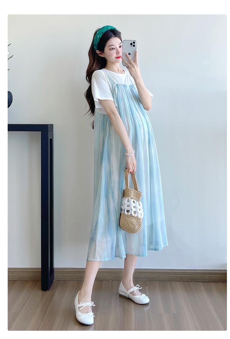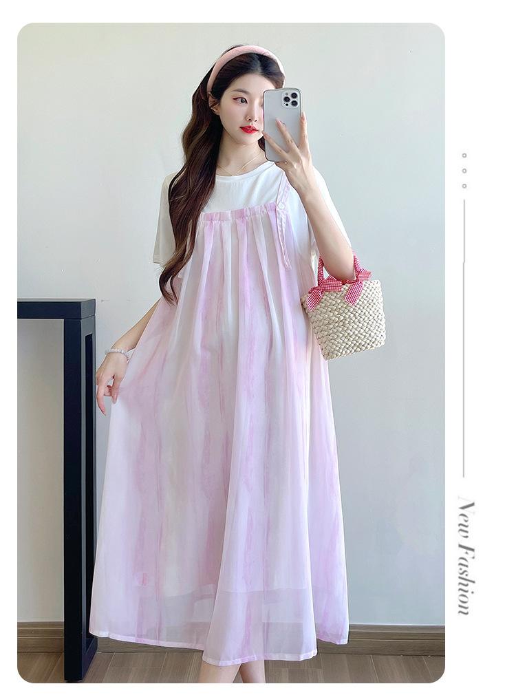 Vestido de maternidad de verano 2025, nueva moda, camiseta suelta de dos piezas falsa, falda larga, falda de maternidad de verano.
