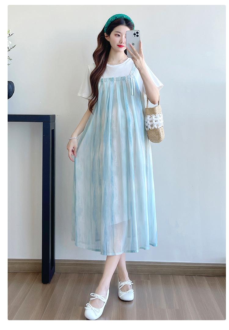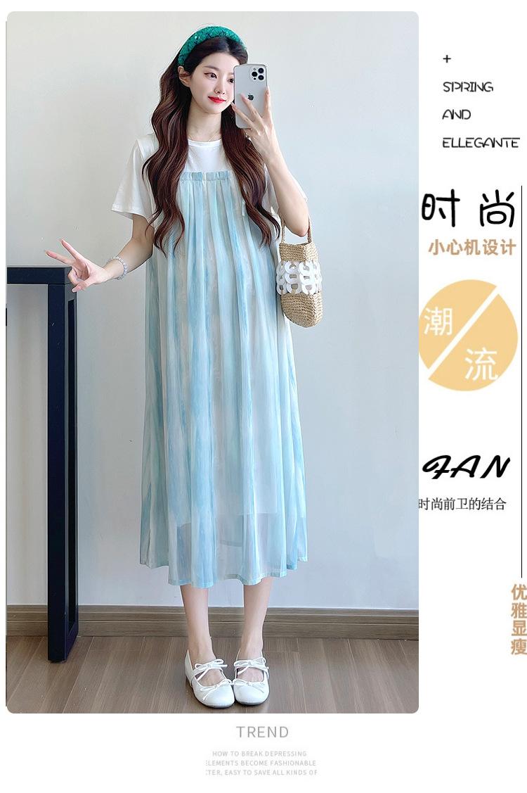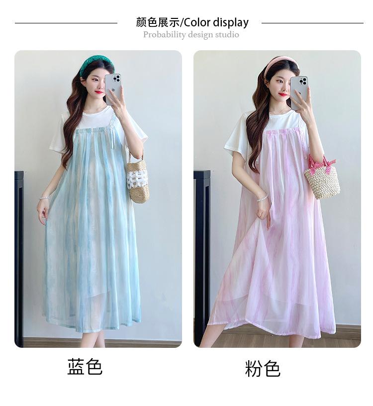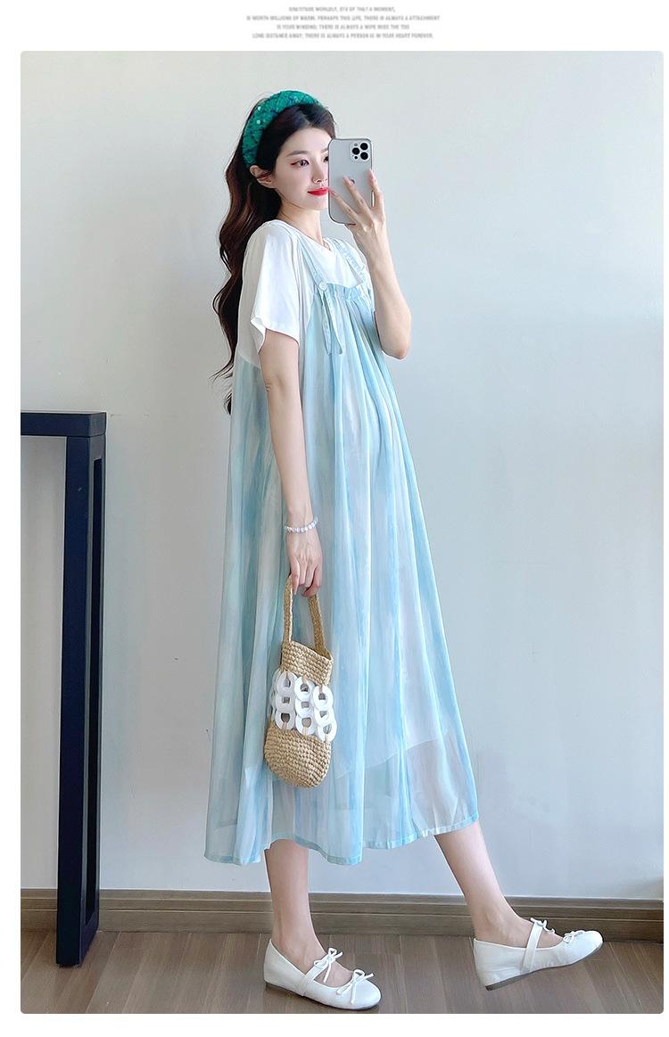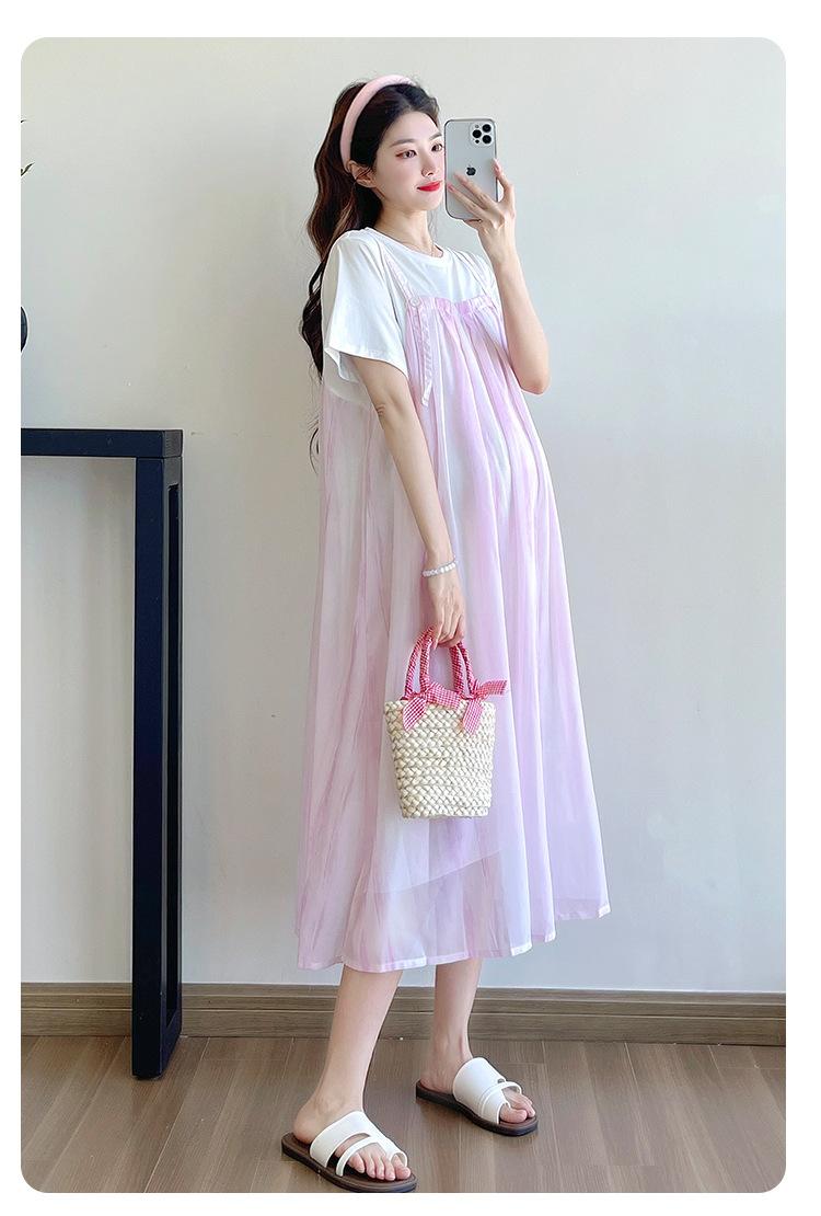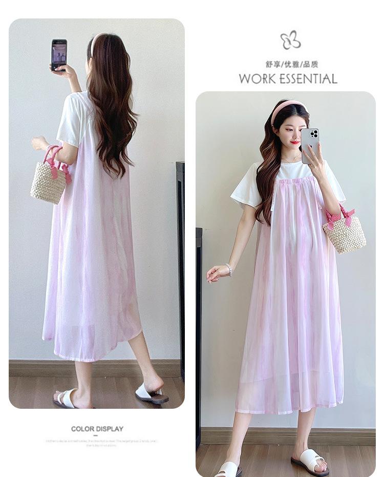 Vestido de maternidad de verano 2025, nueva moda, camiseta suelta de dos piezas falsa, falda larga, falda de maternidad de verano.