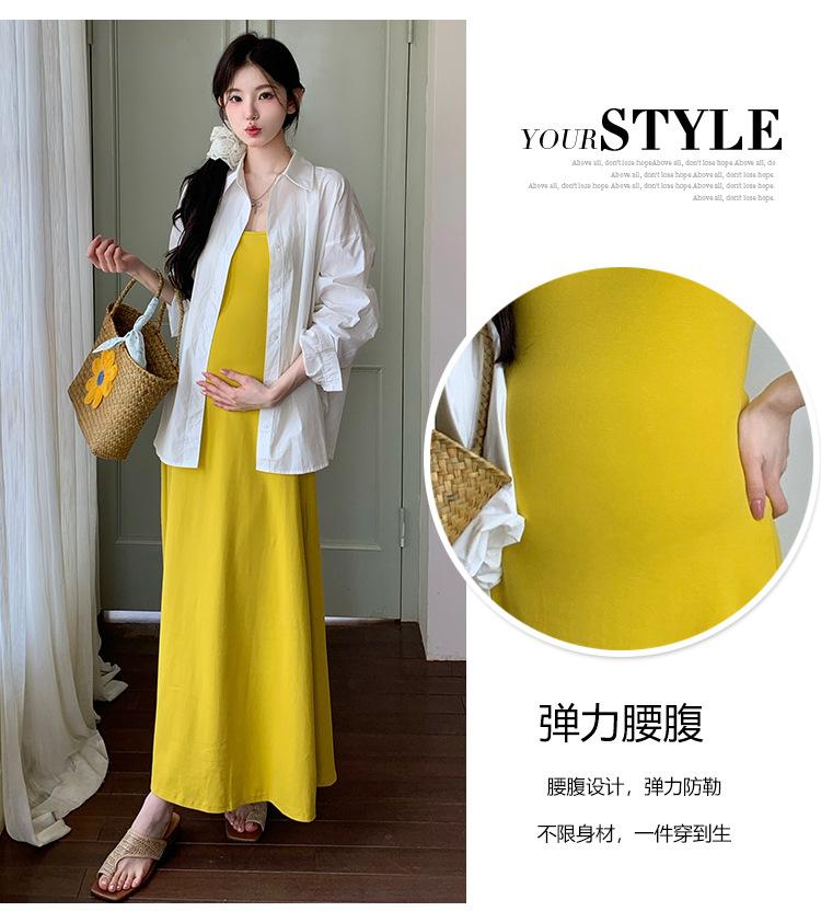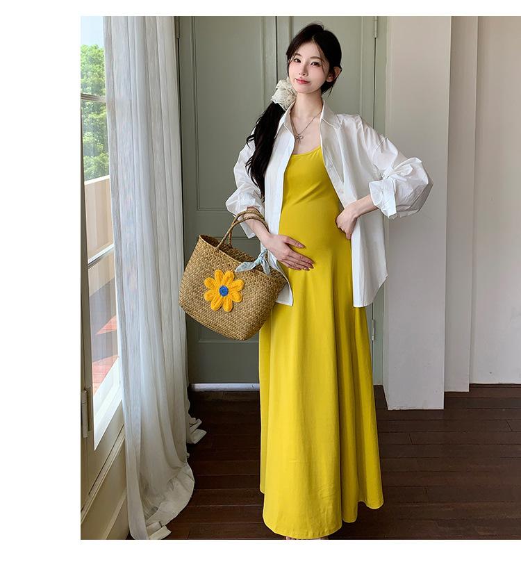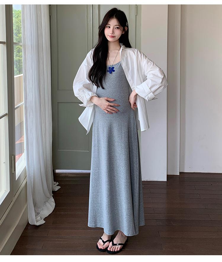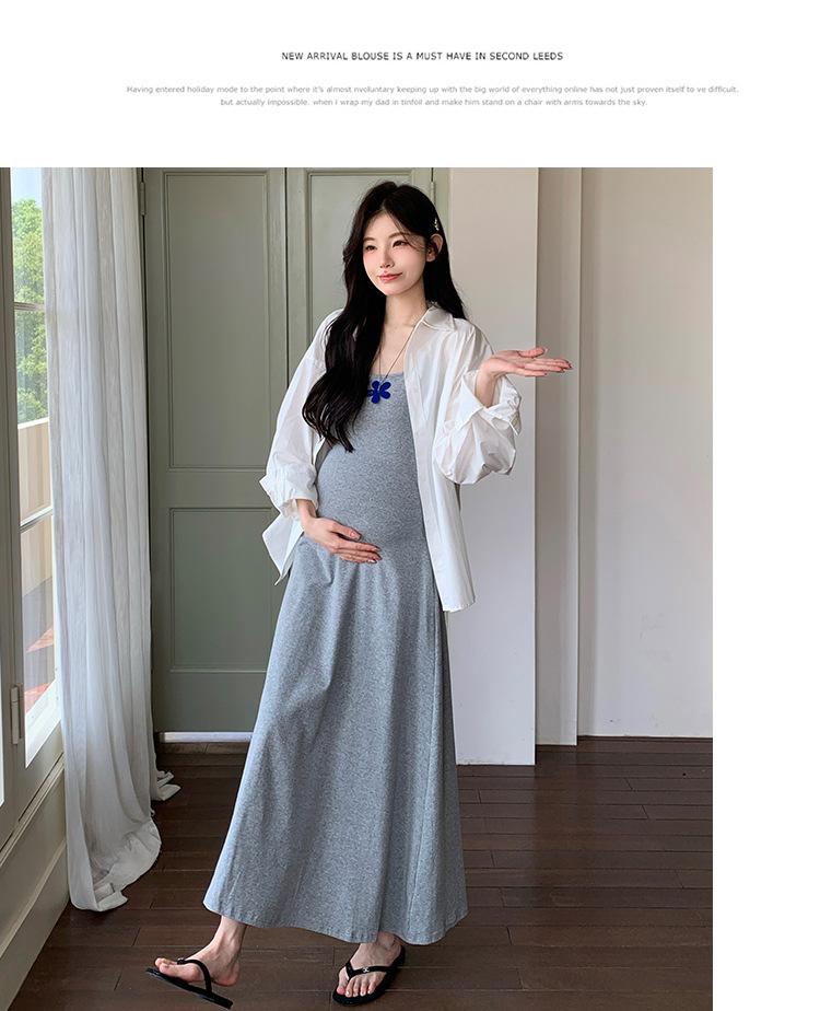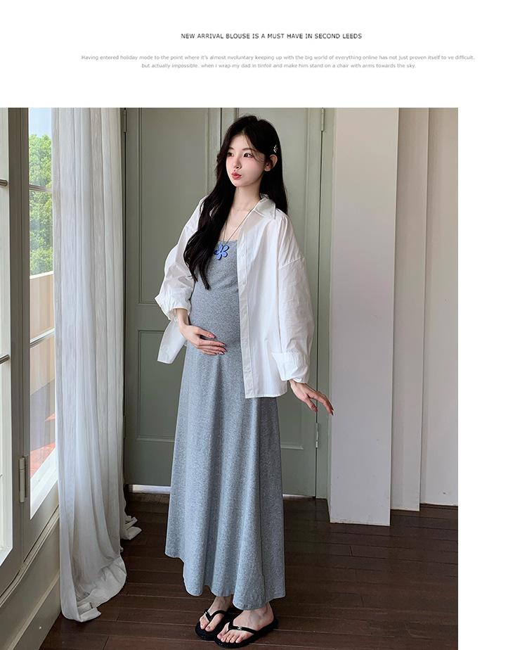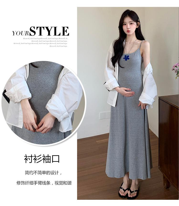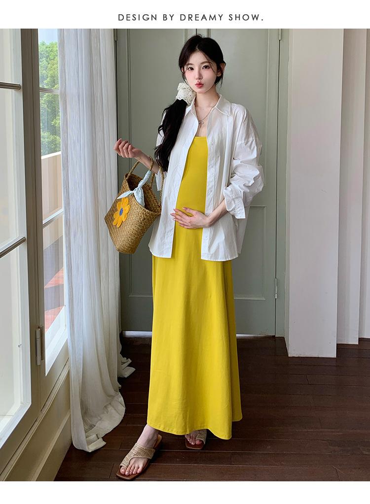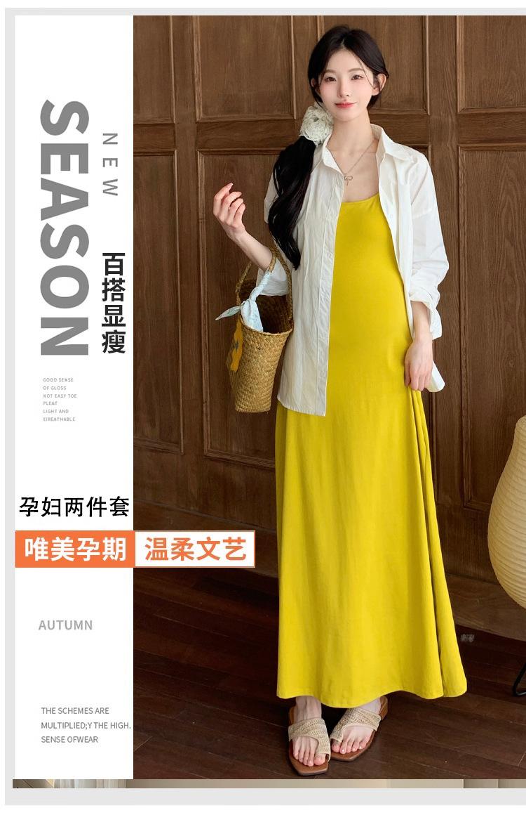 Ropa de Maternidad 2025 Nuevo Verano Camisa Protección Solar + Falda Larga con Tirantes Estilo Lazy Vestido de Maternidad de Dos Piezas