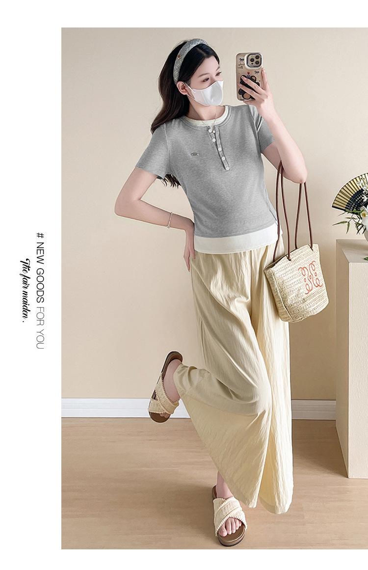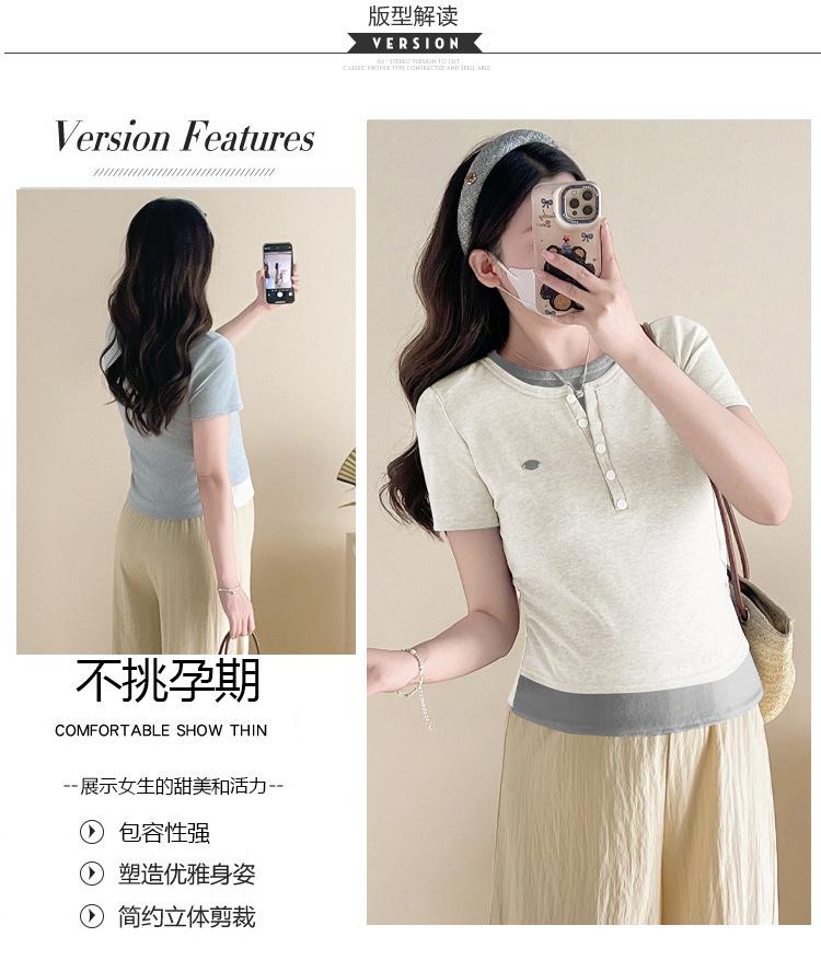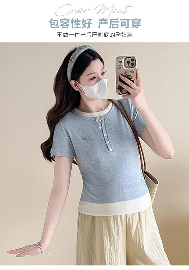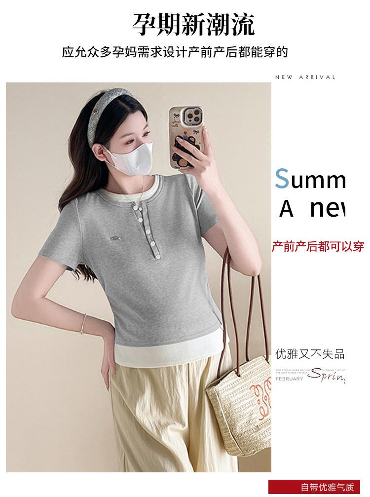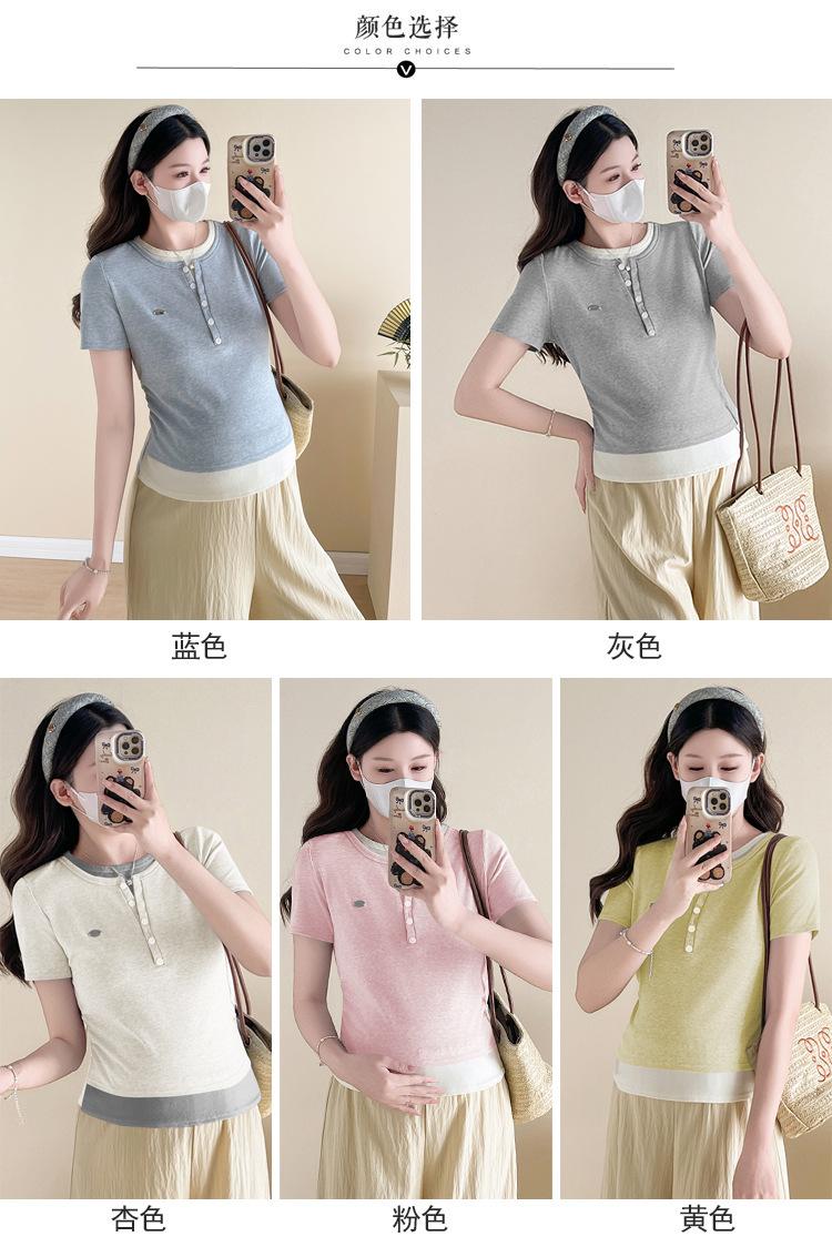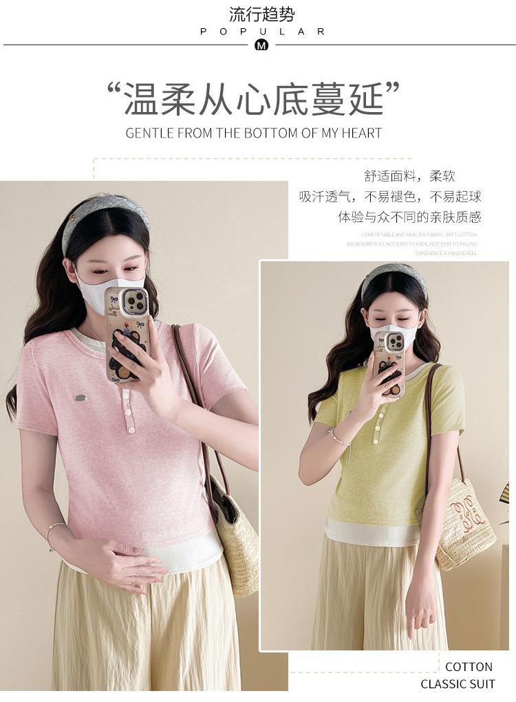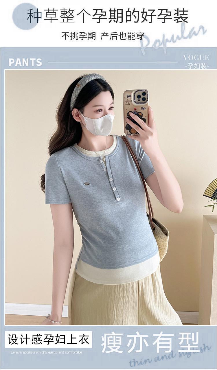 Ropa de Maternidad 2025 Verano Nuevo Estilo Coreano Moda Casual Sencillo Falso Dos Piezas Empalmado Camiseta de Manga Corta Top de Maternidad
