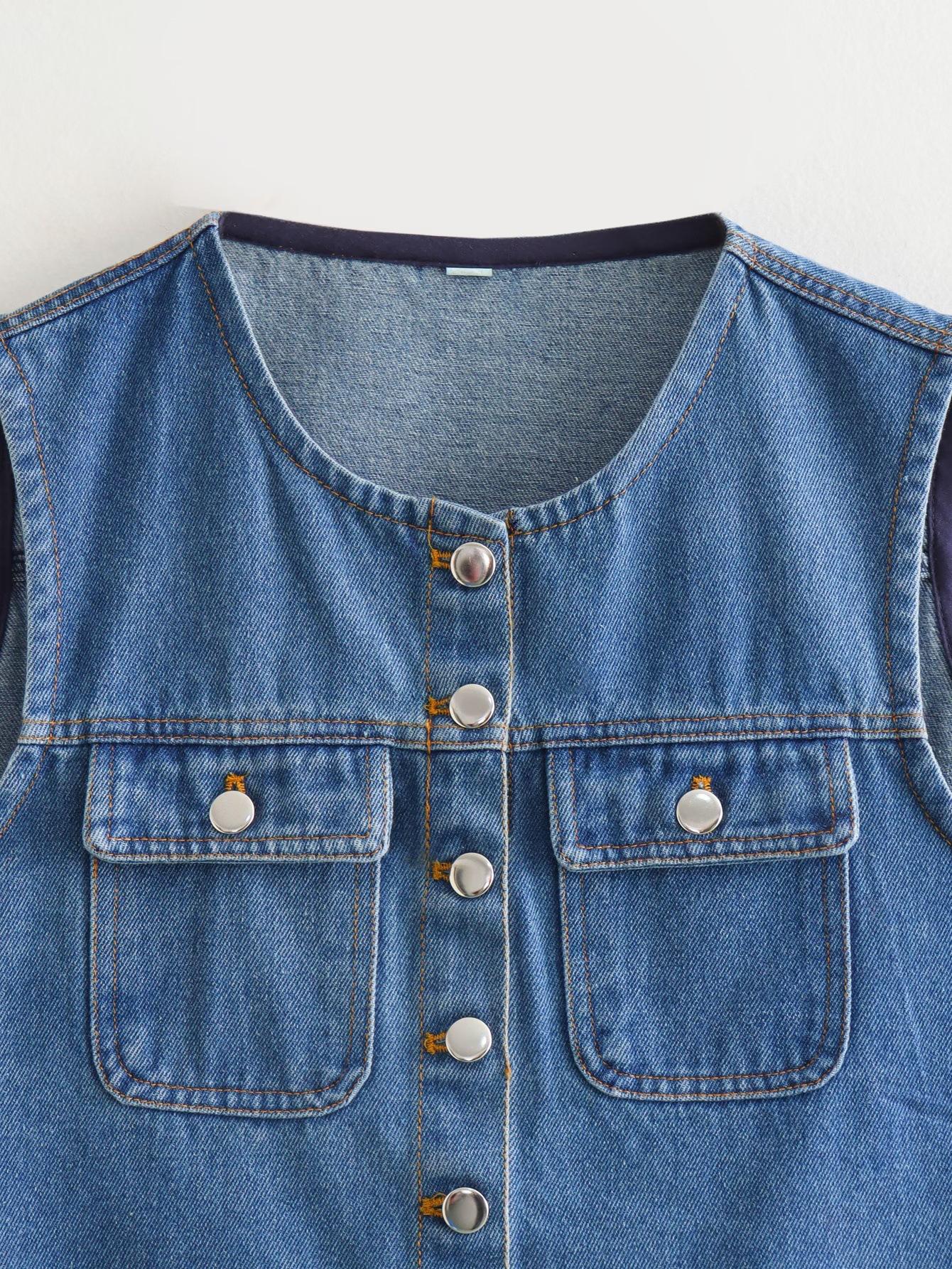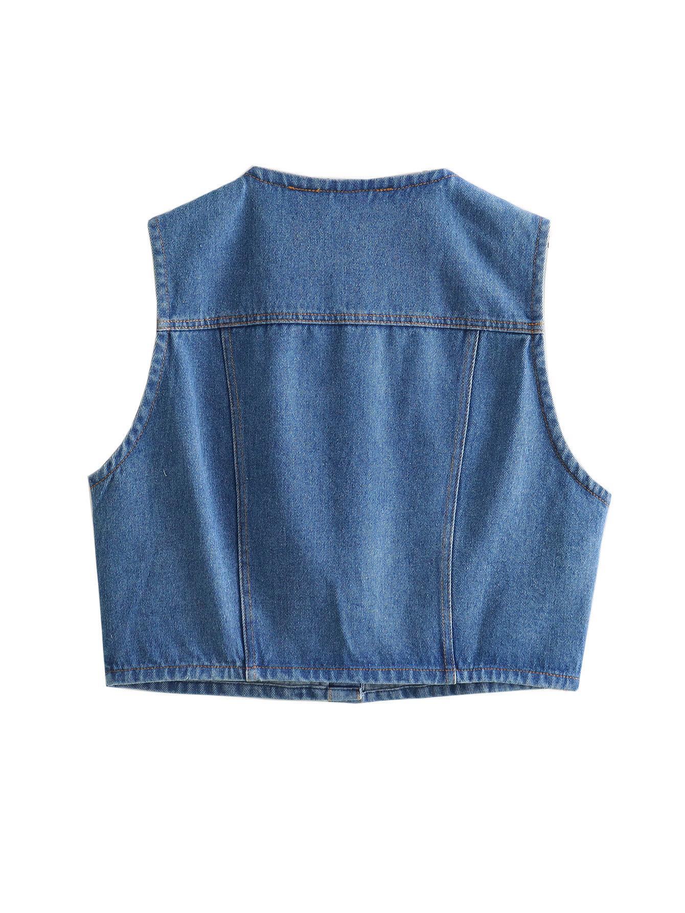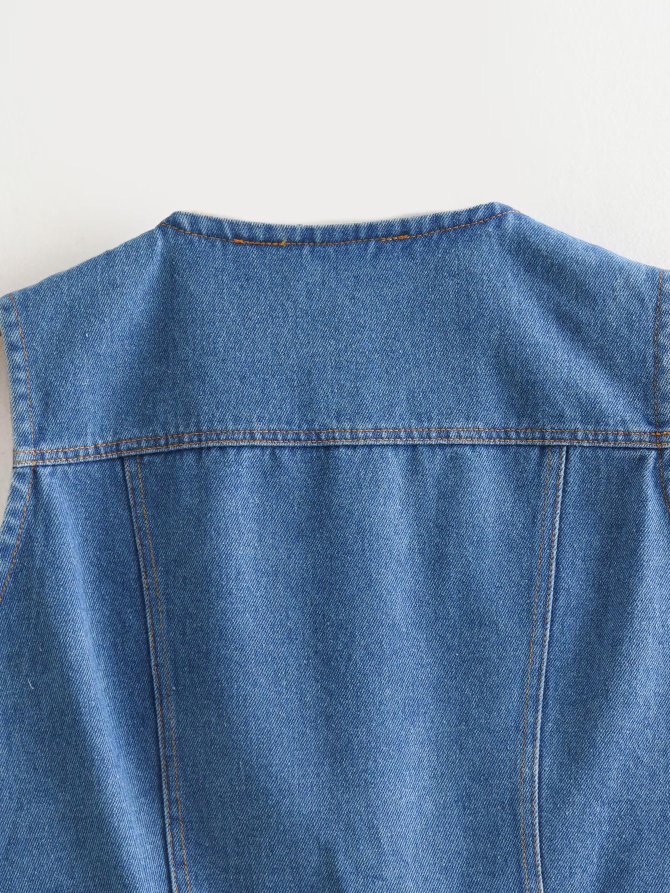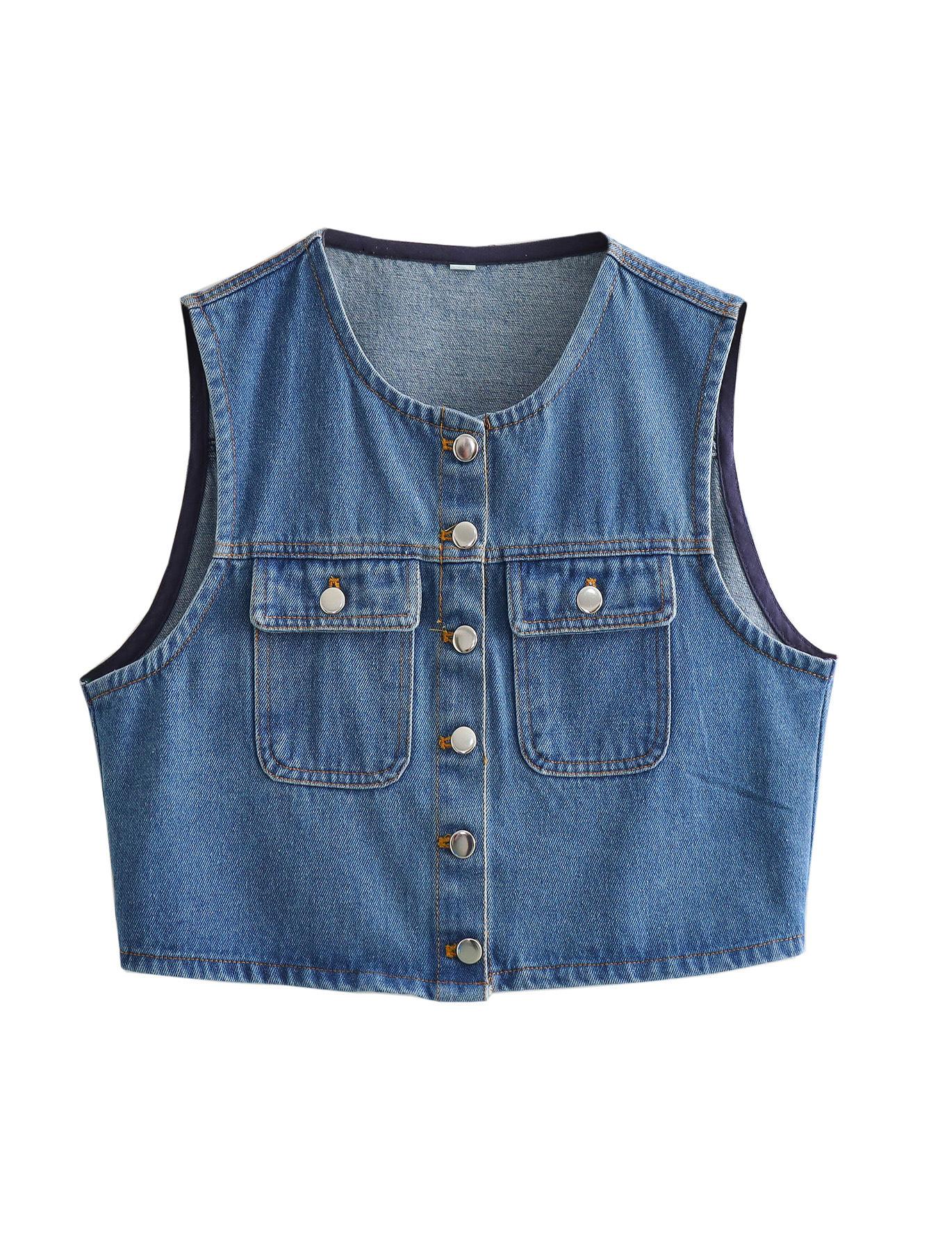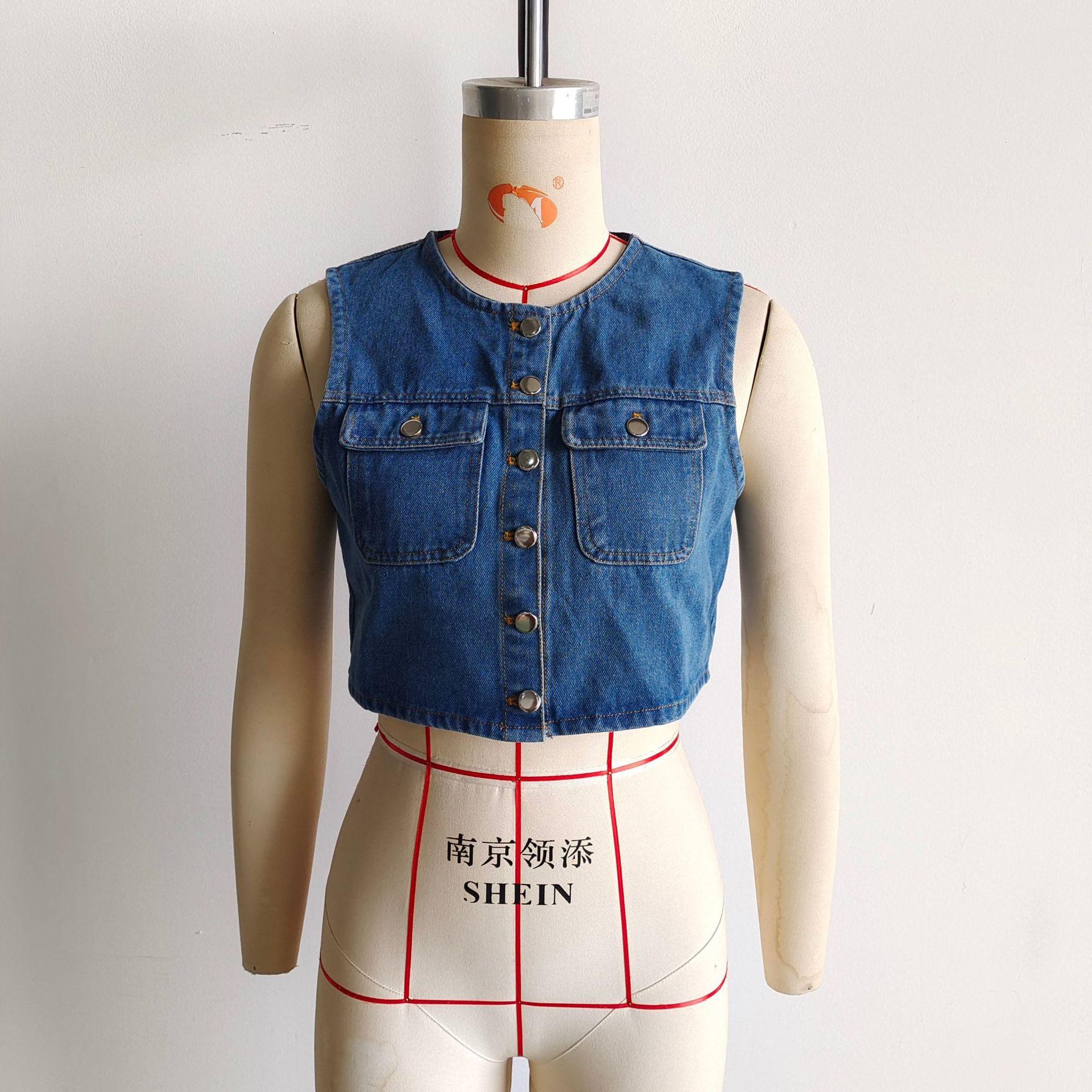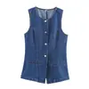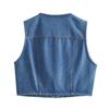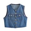 Chaleco de mezclilla de exportación de estilo europeo y americano de un solo botón para mujer 2025 Moda de verano para mujer Chaleco versátil corto sin mangas de cuello redondo