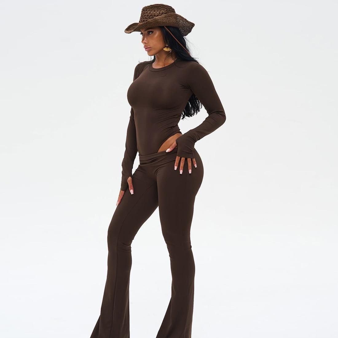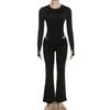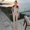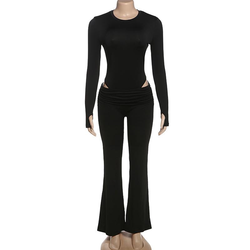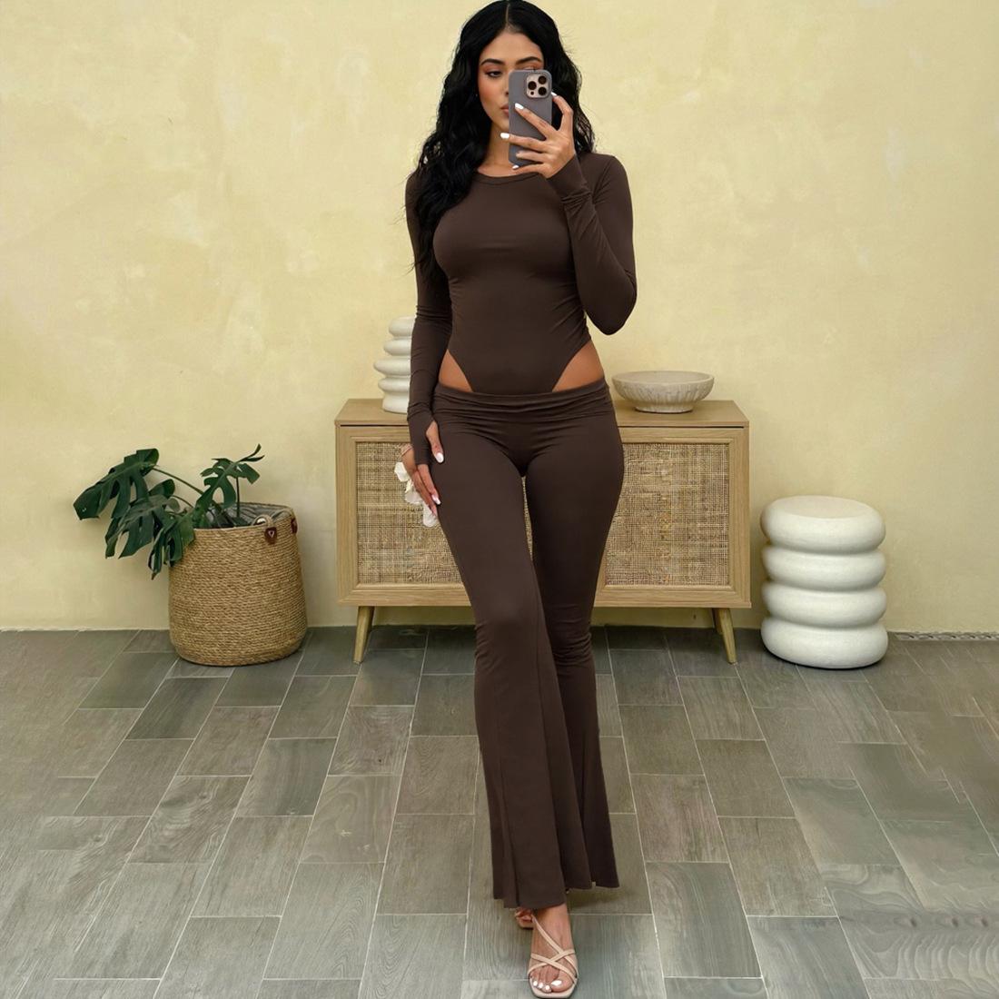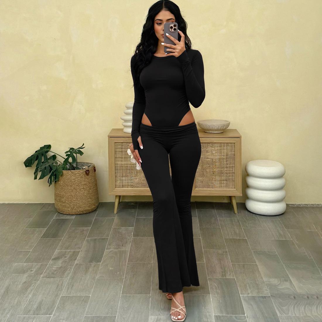 Amazon 2025 Exportación Nueva Moda Elegante Color Puro Cuello Redondo Manga Larga Mono Ajustado Traje de Pantalón de Cintura Baja