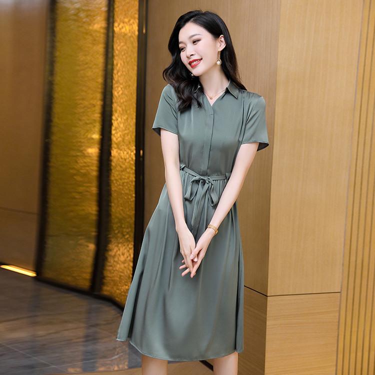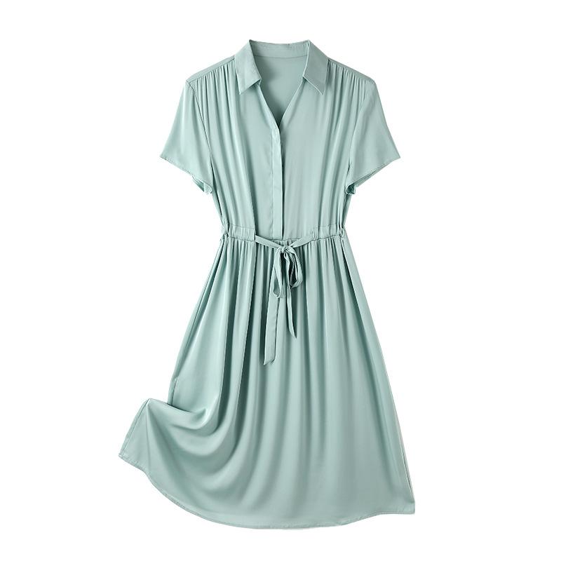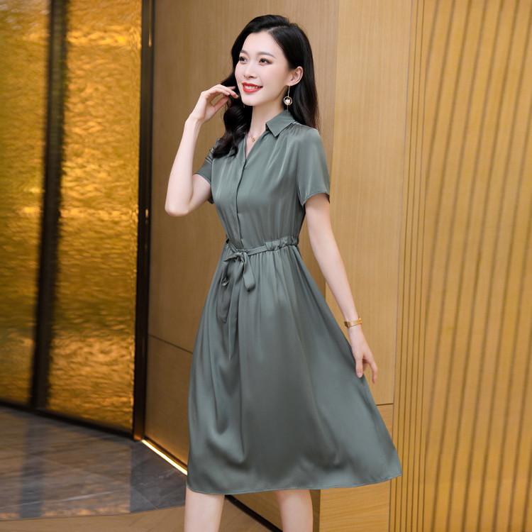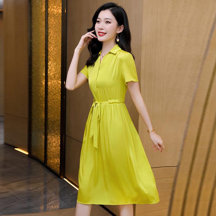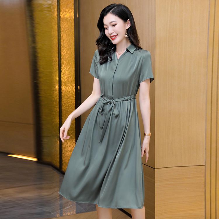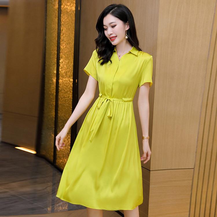 2025 Vestido Popular de Seda de Manga Corta para Mujer Verano Nuevo Vestido Camisero de Color Puro Seda de Morera Pesada por Encima de la Rodilla Largo Medio