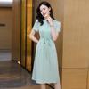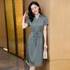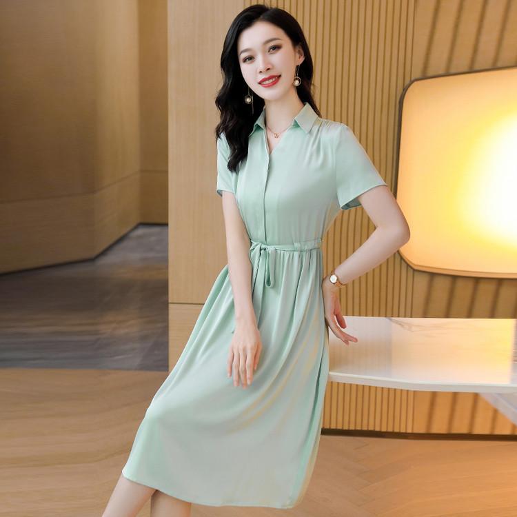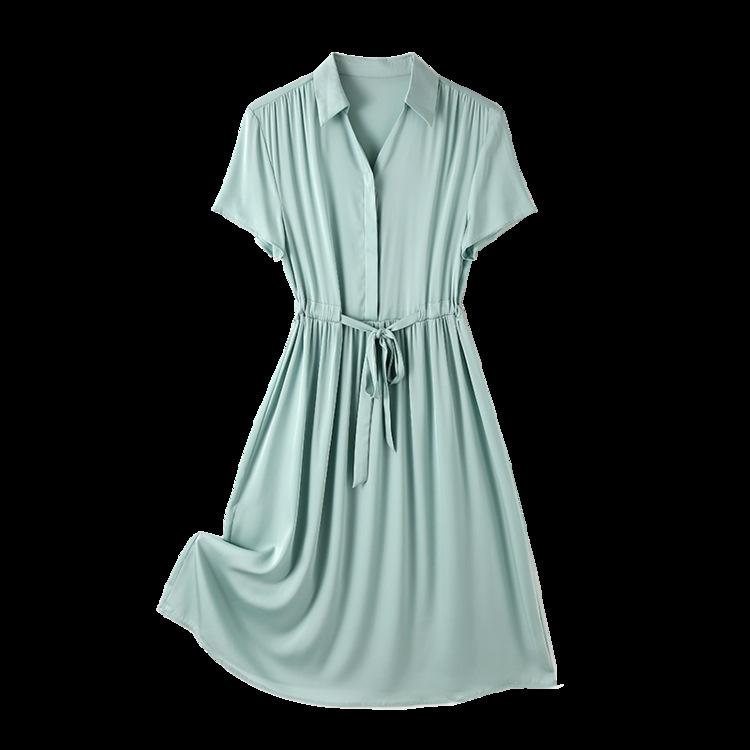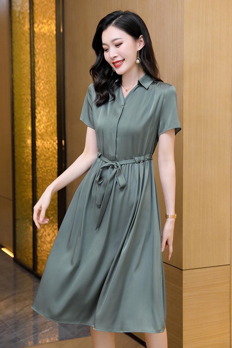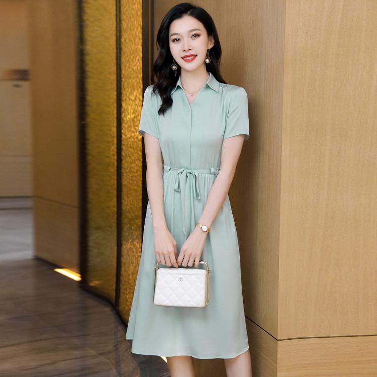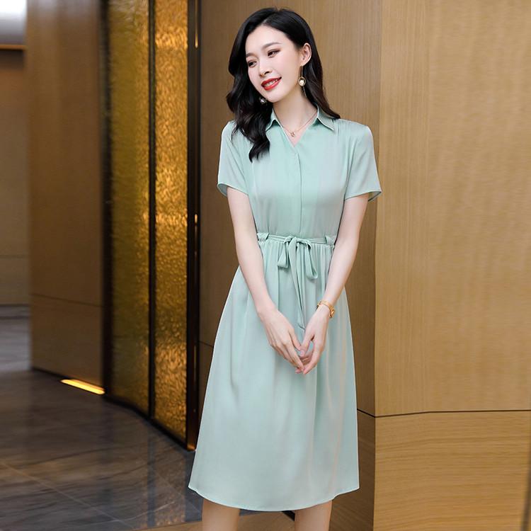 2025 Vestido Popular de Seda de Manga Corta para Mujer Verano Nuevo Vestido Camisero de Color Puro Seda de Morera Pesada por Encima de la Rodilla Largo Medio