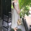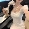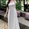 Vestido Francés de Estilo Socialité 2025 de Color Sólido con Calado Francés para Mujer Verano Adelgazante de Cintura Temperamento Dulce Vestidito Blanco