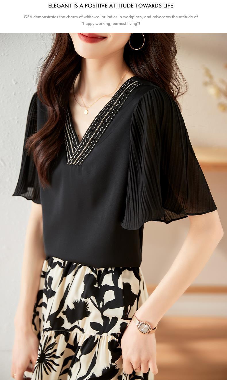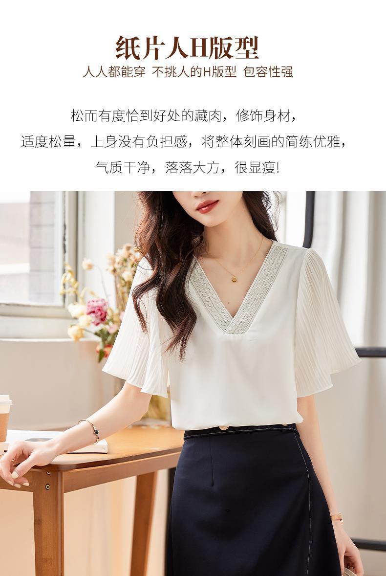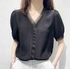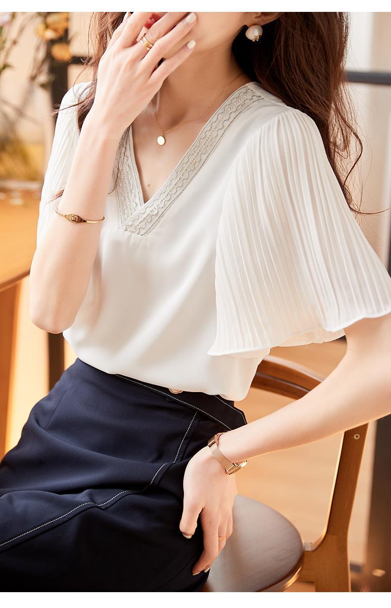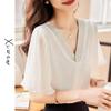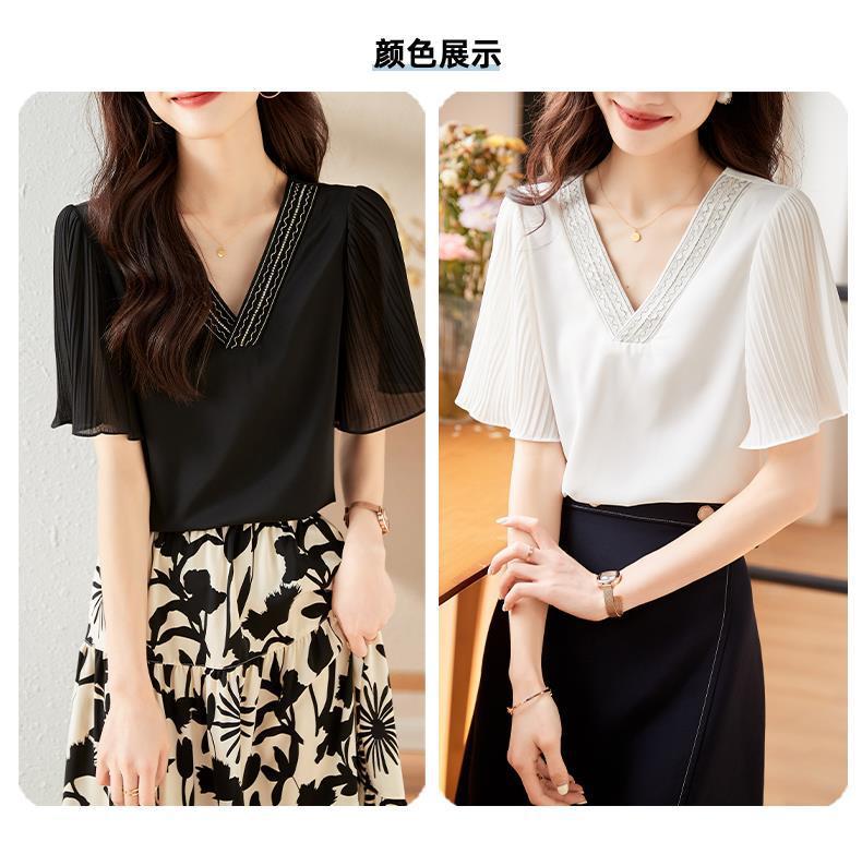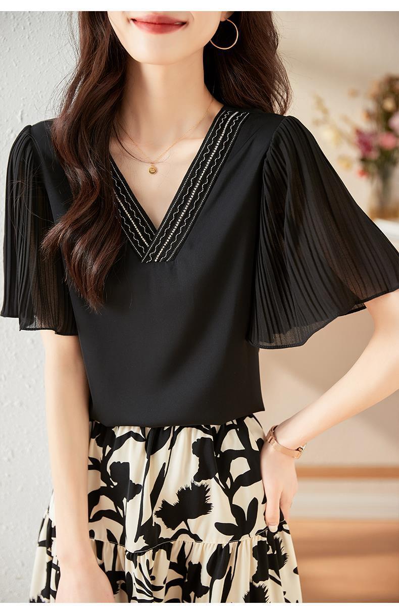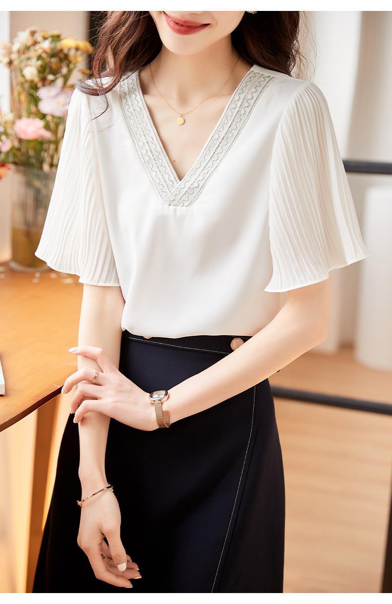 Camisa de gasa de manga corta fina con cuello en V para mujer, elegante camiseta de verano 2024 con nuevo diseño de nicho
