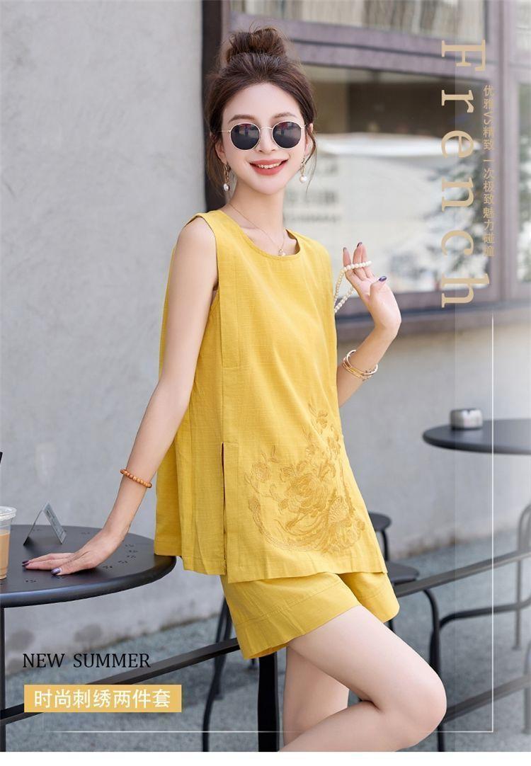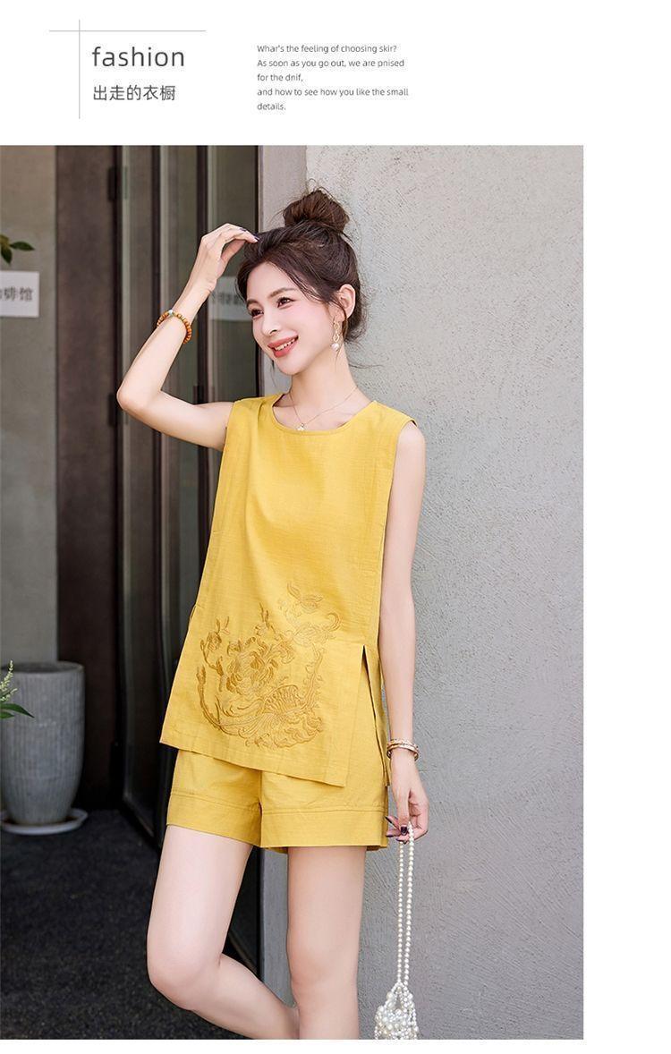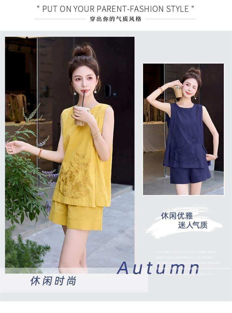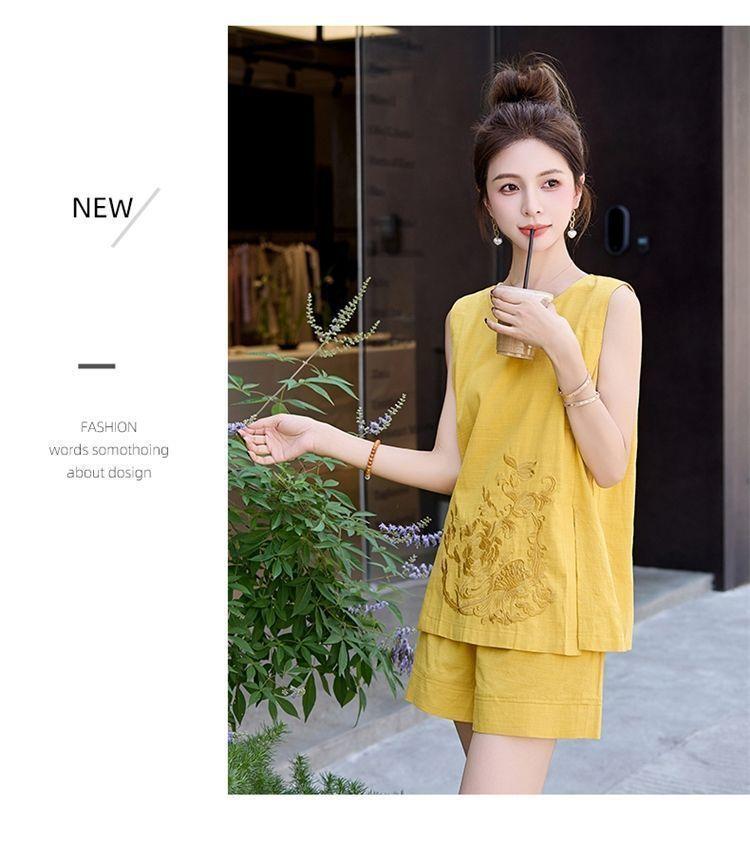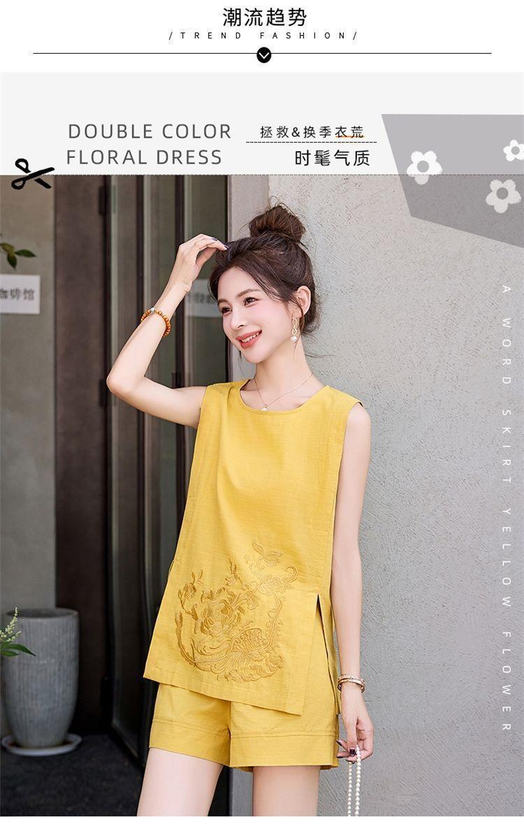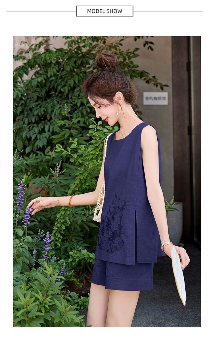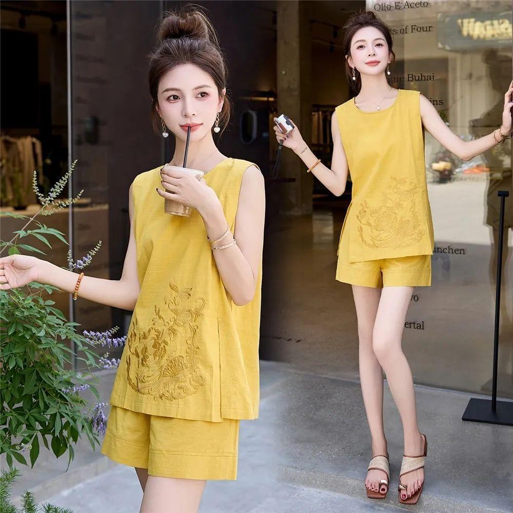 Traje de Estilo Nacional de Estilo Chino Nuevo para Mujer Verano Algodón y Lino Diseño Bordado Top Chaleco sin Mangas Shorts Elegante Conjunto de Dos Piezas