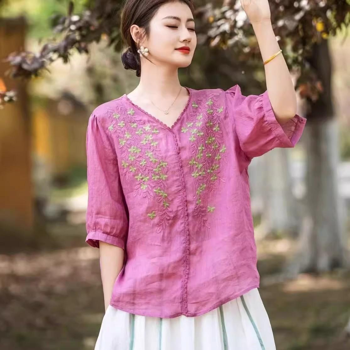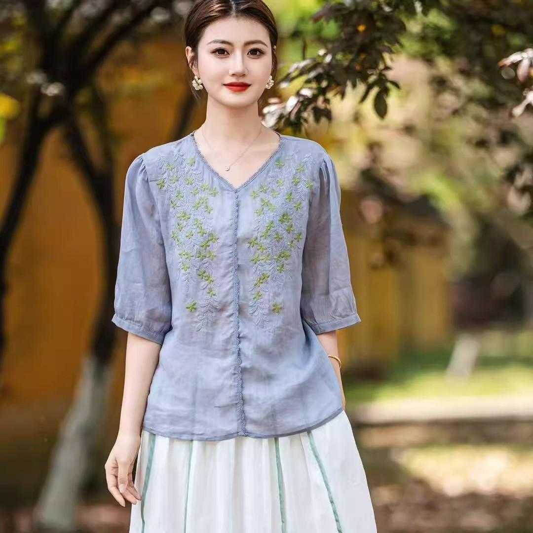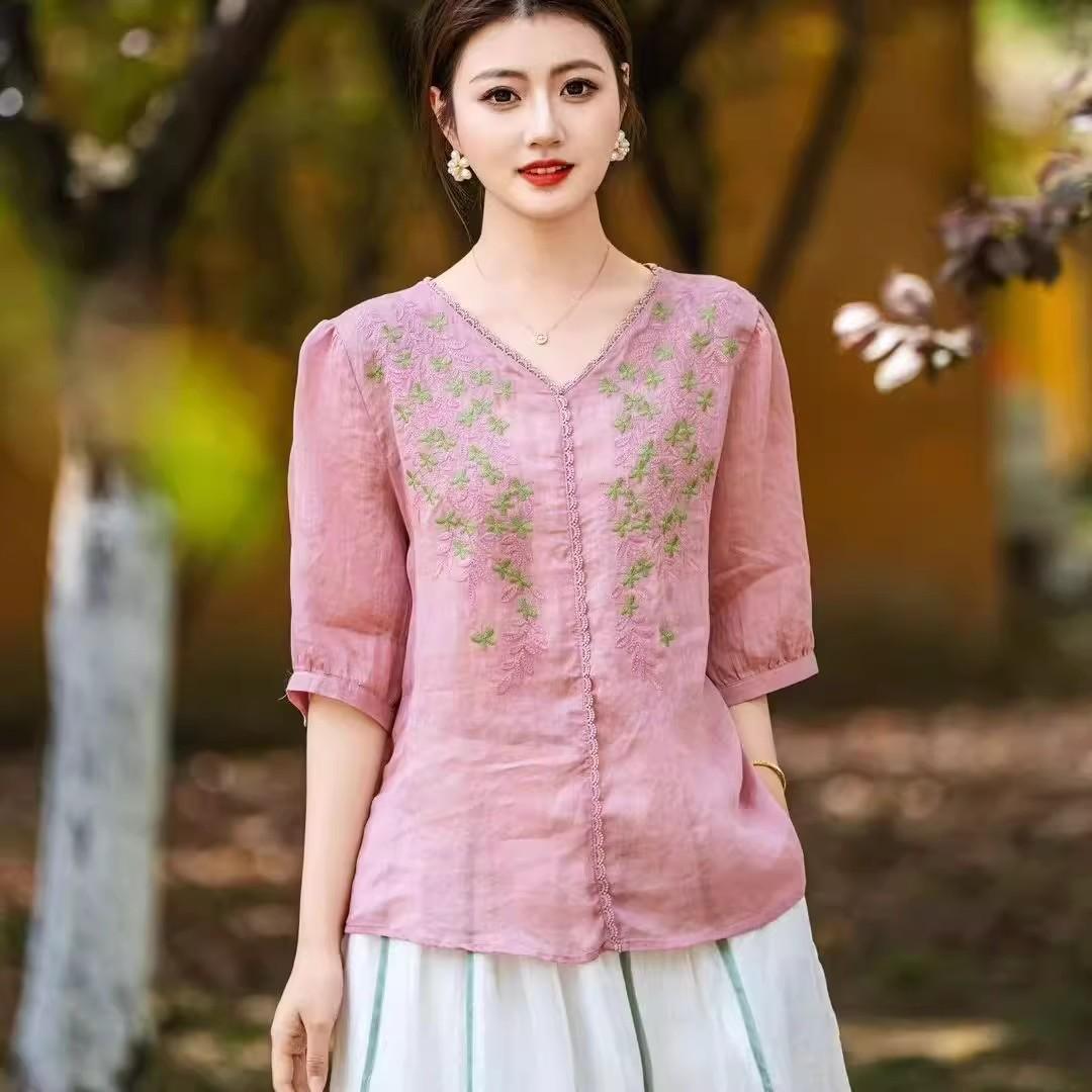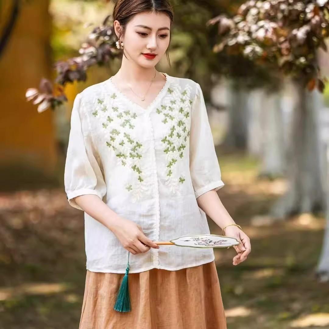 2025 Nuevas Camisas de Verano de Algodón y Lino Sueltas con Cuello en V Modernas Elegantes Camisetas Bordadas Tops Delgados Tops de Mujer